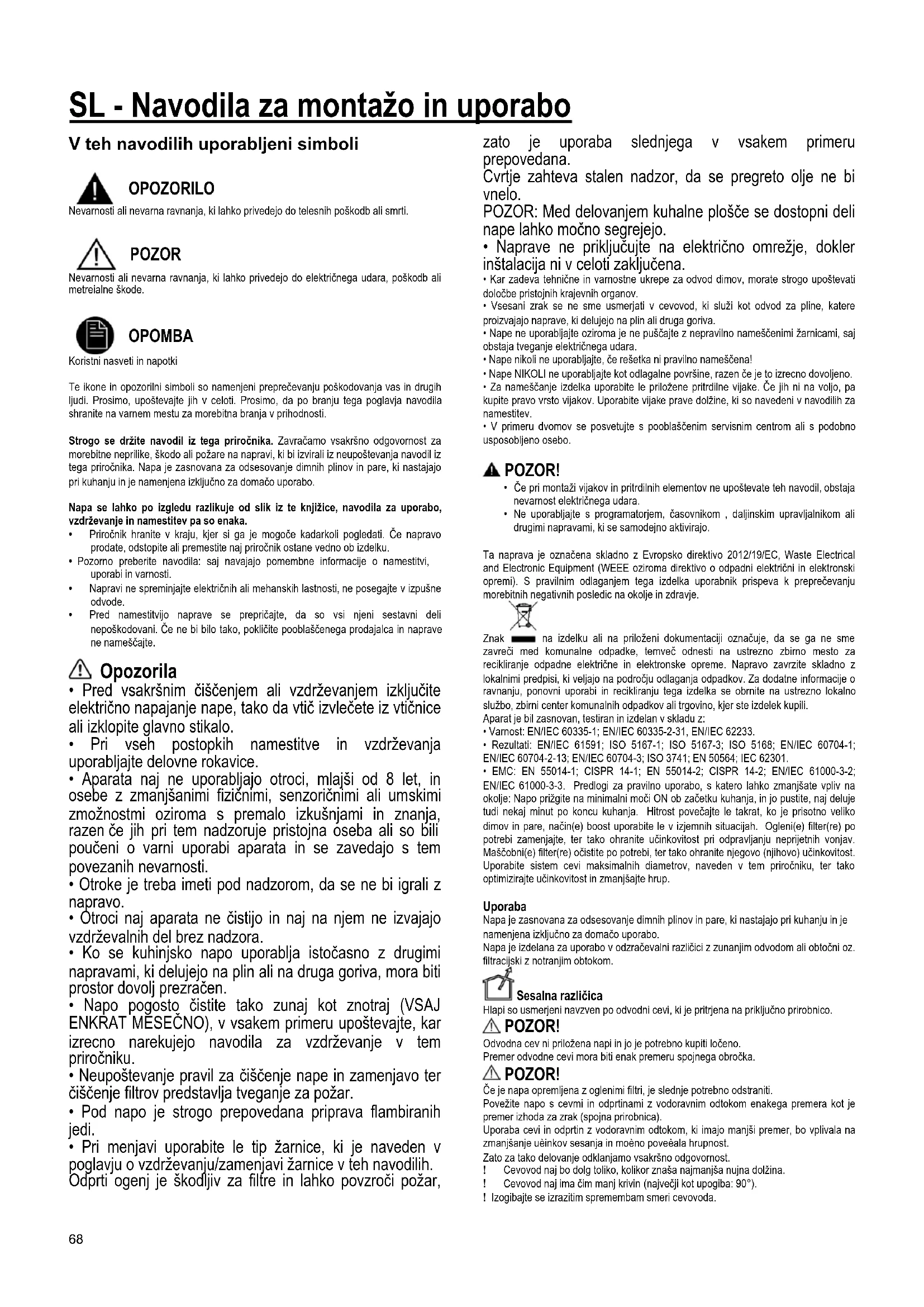 OPOMBA Koristni nasveti in napotki Te ikone in opozorilni simboli so namenjeni preprečevanju poškodovanja vas in drugih ljudi. Prosimo, upoštevajte jih v celoti. Prosimo, da po branju tega poglavja navodila shranite na varnem mestu za morebitna branja v prihodnosti. Strogo se držite navodil iz tega priročnika. Zavračamo vsakršno odgovornost za morebitne neprilike, škodo ali požare na napravi, ki bi izvirali iz neupoštevanja navodil iz tega priročnika. Napa je zasnovana za odsesovanje dimnih plinov in pare, ki nastajajo pri kuhanju in je namenjena izključno za domačo uporabo. Napa se lahko po izgledu razlikuje od slik iz te knjižice, navodila za uporabo, vzdrževanje in namestitev pa so enaka.