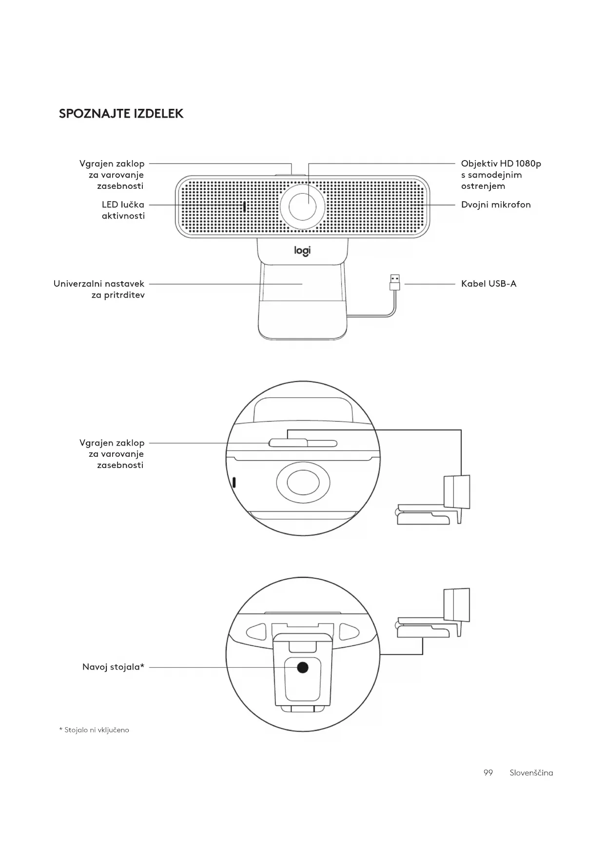 Povežite USB-A konektor na USB-A port na računaru.SPOZNAJTE IZDELEK Vgrajen zaklop za varovanje zasebnosti LED lučka aktivnosti Univerzalni nastavek za pritrditev Vgrajen zaklop za varovanje zasebnosti Navoj stojala* Dvojni mikrofon Objektiv HD 1080p s samodejnim ostrenjem Kabel USB-A