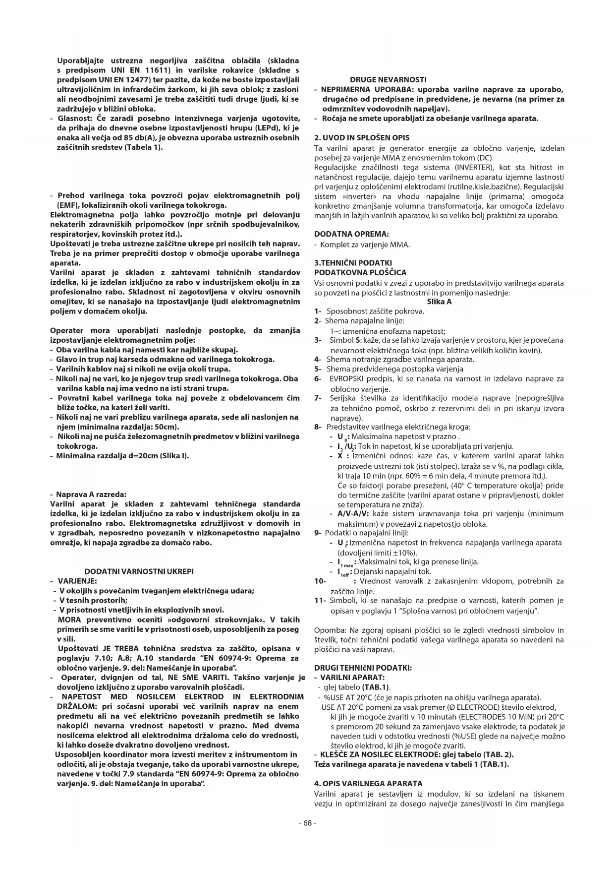 opisan v poglavju 1 “Splošna varnost pri obločnem varjenju”. Opomba: Na zgoraj opisani ploščici so le zgledi vrednosti simbolov in številk, točni tehnični podatki vašega varilnega aparata so navedeni na ploščici na vaši napravi. DRUGI TEHNIčNI PODATKI: - VARILNI APARAT: - glej tabelo (TAB.1). - %USE AT 20°C (če je napis prisoten na ohišju varilnega aparata). USE AT 20°C pomeni za vsak premer (Ø ELECTRODE) število elektrod, ki jih je mogoče zvariti v 10 minutah (ELECTRODES 10 MIN) pri 20°C s premorom 20 sekund za zamenjavo vsake elektrode; ta podatek je naveden tudi v odstotku vrednosti (%USE) glede na največje možno število elektrod, ki jih je mogoče zvariti. - KLEŠČE ZA NOSILEC ELEKTRODE: glej tabelo (TAB. 2). Teža varilnega aparata je navedena v tabeli 1 (TAB.1).