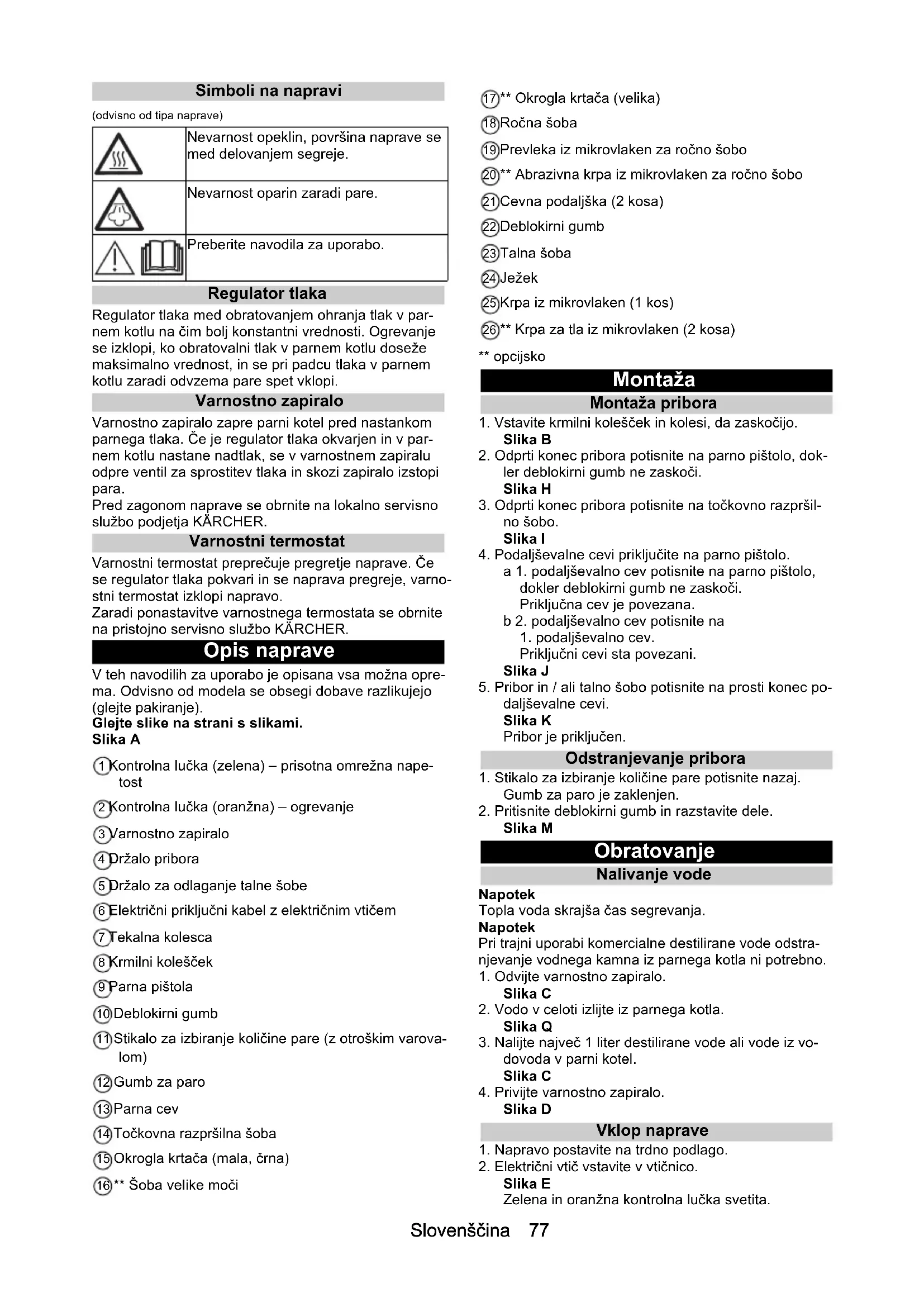 njo obrišite površino. Čiščenje stekla POZOR Zlom stekla in poškodovane površine Para lahko poškoduje lakirana mesta okenskega okvirja in pri nizkih zunanjih temperaturah povzroči napetost na površini okenskih stekel in s tem zlom stekla. Pare ne usmerite na lakirana mesta okenskega okvirja. Pri nizkih zunanjih temperaturah segrejte okensko stek- lo, tako da nežno navlažite celotno stekleno površino. Okensko površino očistite z ročno šobo in prevleko. Za odstranjevanje vode uporabite brisalec za okna ali površine obrišite do suhega. Uporaba pribora Parna pištola Če parne pištole ne uporabljate kot pribor, jo lahko upo- rabljate: Za odstranjevanje manjših gub iz visečih oblačil: ob- lačilo poškropite s paro z razdalje 10–20 cm. Za mokro brisanje prahu: Na kratko navlažite krpo in z njo obrišite pohištvo. Največja količina pare Manjša količina pare Ni pare – otroško varovalo Napotek Če je izbrana ta nastavitev, gumba za paro ni mogoče vključiti.Slovenščina 79 Točkovna razpršilna šoba Točkovna razpršilna šoba je primerna za čiščenje težko dostopnih mest, fug, armatur, odtokov, umivalnikov, stranišč, žaluzij in radiatorjev. Bližje kot je točkovna raz- pršilna šoba umazanemu mestu, večji je učinek čišče- nja, saj sta temperatura in količina pare na izstopu pare največji. Večje obloge vodnega kamna lahko pred par- nim čiščenjem obdelate s primernim čistilom. Čistilo pustite učinkovati prib. 5 minut in nato površino očistite s paro.