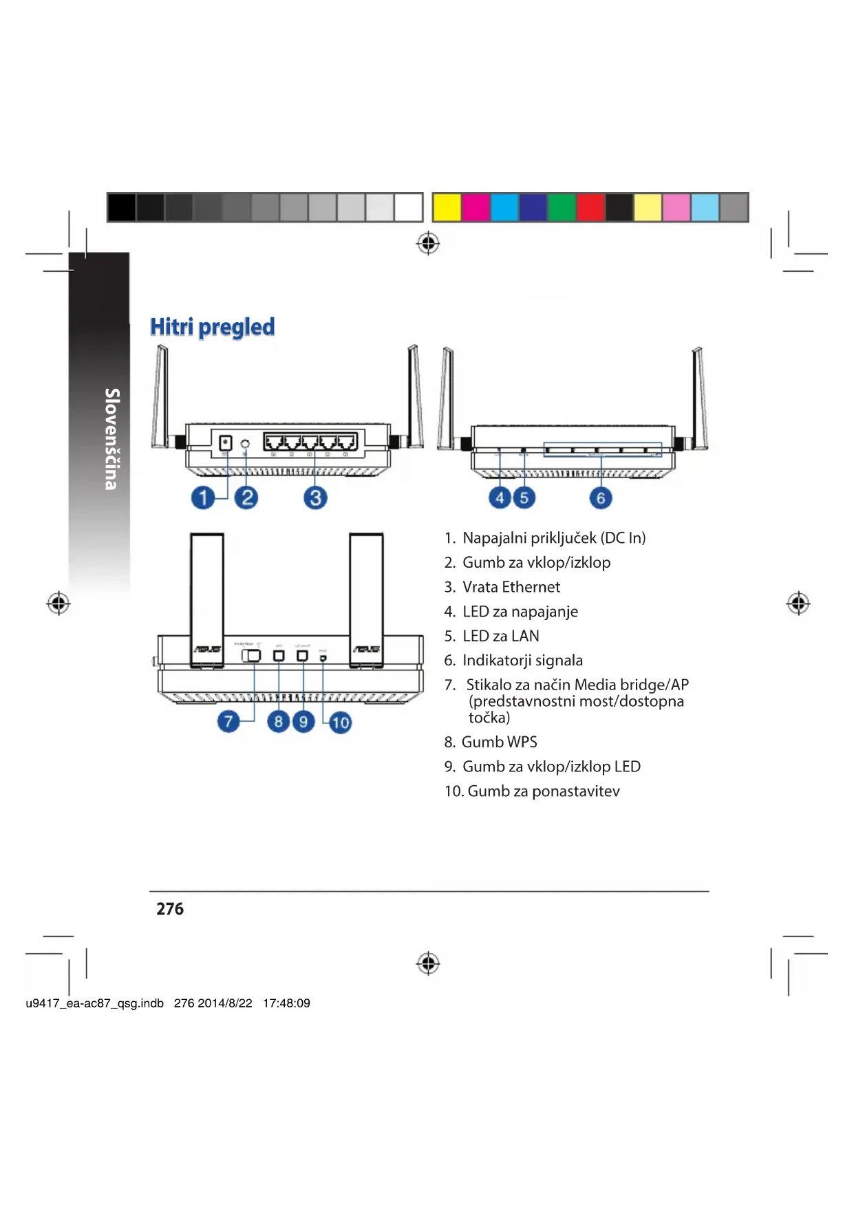 b. Pritisnite in držite gumb WPS na napravi EA-AC87 več kot tri sekunde, dokler indikatorji signala LED1 do LED5 ne začnejo zaporedno utripati naprej in nazaj. Nastavitev z WPS a. Premaknite drsno stikalo v način media bridge (predstavnostni most) in vključite napajalni adapter. u9417_ea-ac87_qsg.indb 282 2014/8/22 17:48:12Slovenščina