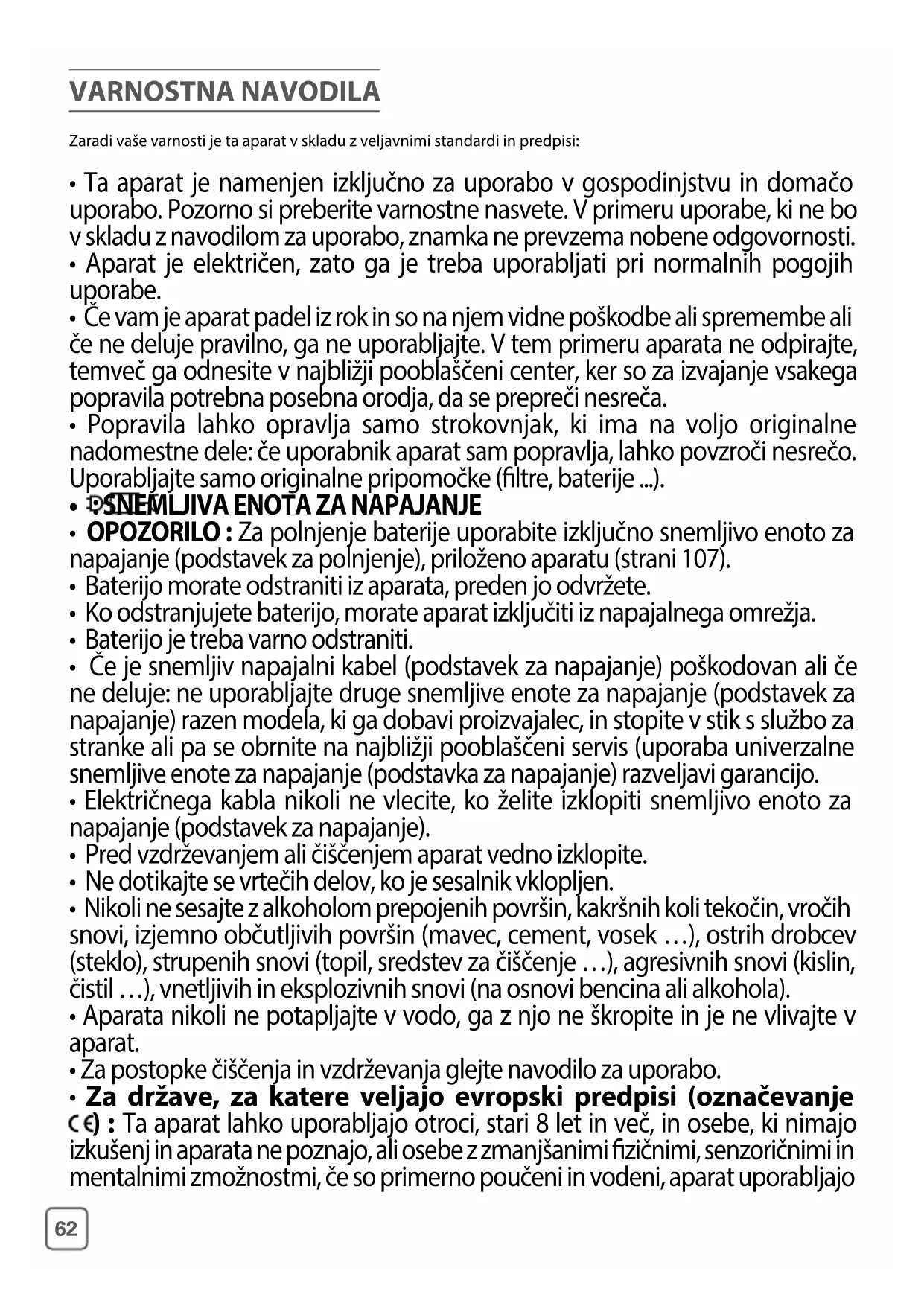 - Pred čiščenjem ali vzdrževanjem naprave morate vtič izključiti iz vtičnice. VARNOSTNA NAVODILA GLEDE BATERIJE* (*odvisno od modela)