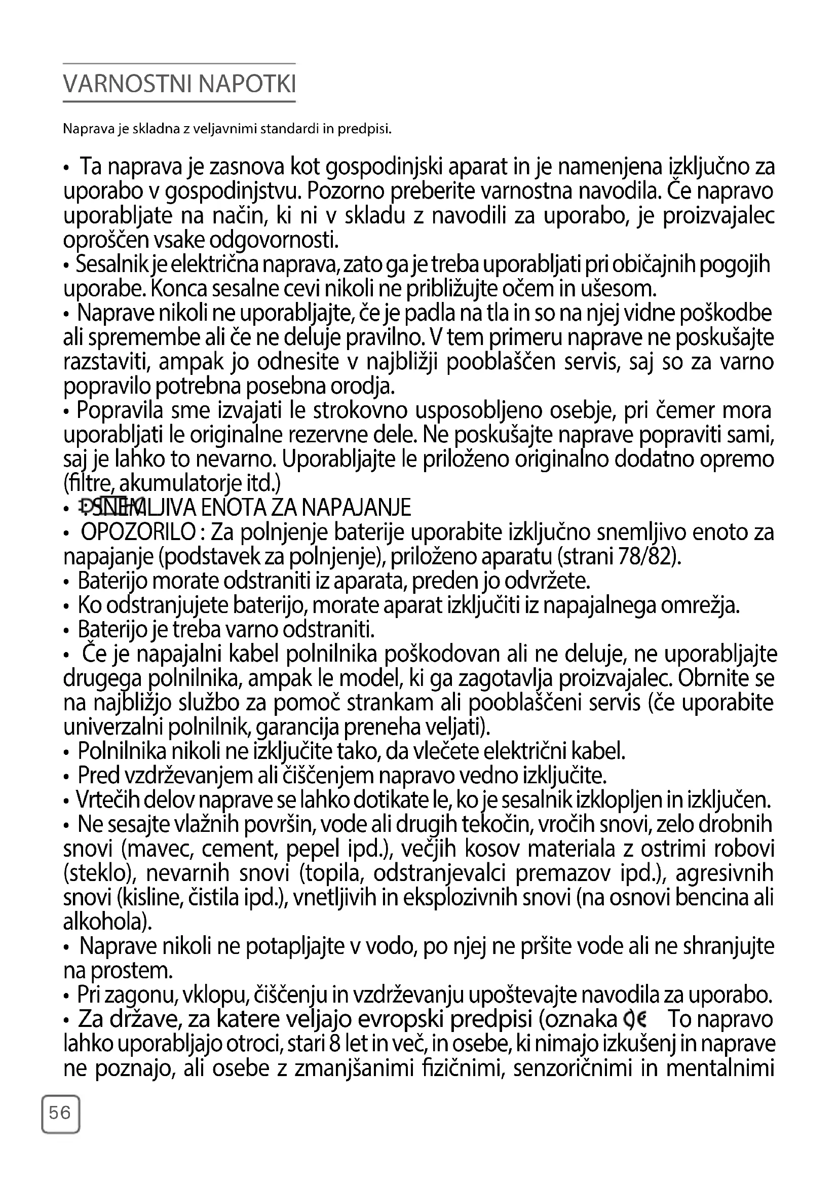 • PSNEMLJIVA ENOTA ZA NAPAJANJE - OPOZORILO : Za polnjenje baterije uporabite izključno snemljivo enoto za napajanje (podstavek za polnjenje), priloženo aparatu (strani 78/82).
