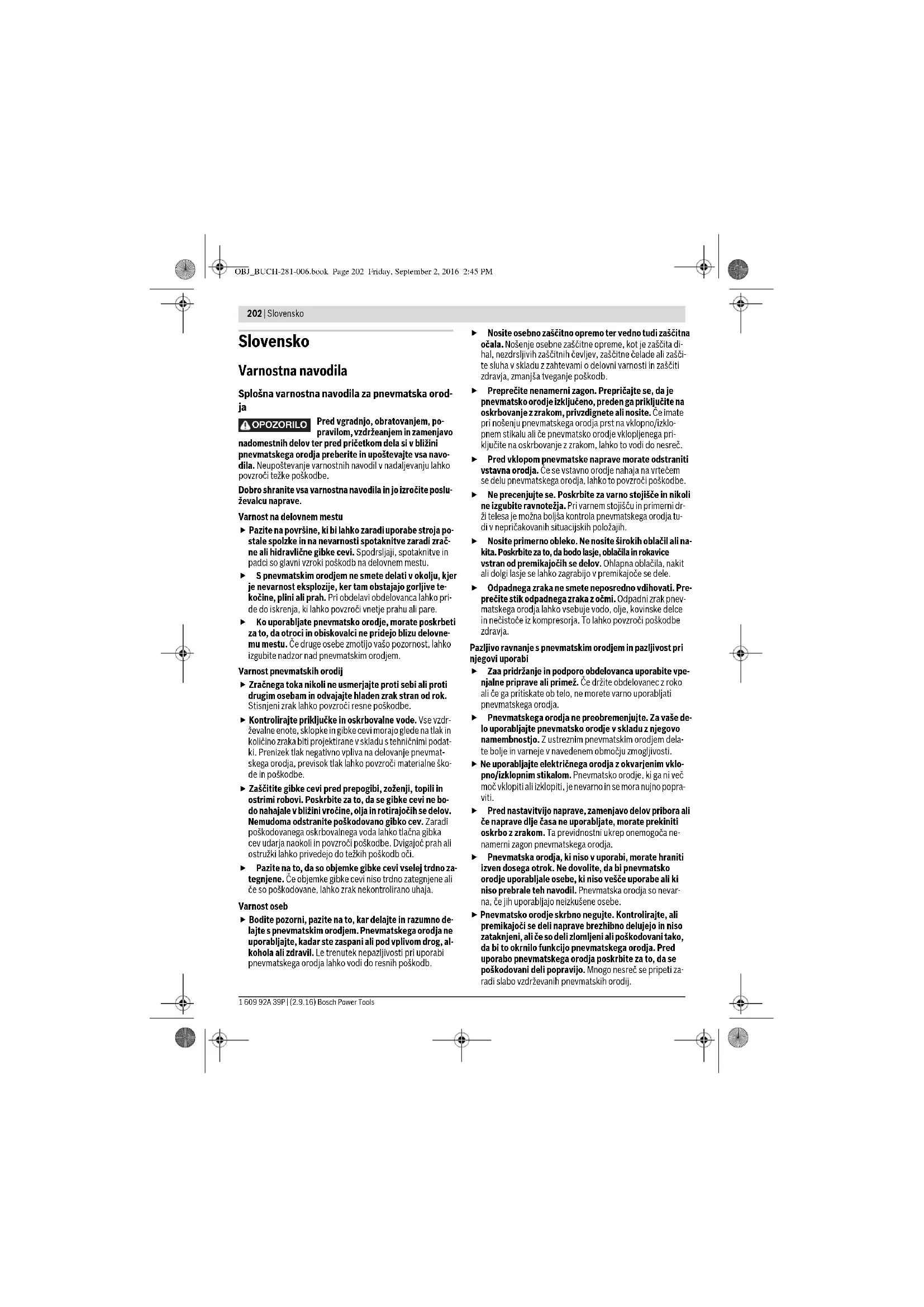 Pred vgradnjo, obratovanjem, po- pravilom, vzdržeanjem in zamenjavo nadomestnih delov ter pred pričetkom dela si v bližini pnevmatskega orodja preberite in upoštevajte vsa navo- dila. Neupoštevanje varnostnih navodil v nadaljevanju lahko povzroči težke poškodbe. Dobro shranite vsa varnostna navodila in jo izročite poslu- ževalcu naprave. Varnost na delovnem mestu Pazite na površine, ki bi lahko zaradi uporabe stroja po- stale spolzke in na nevarnosti spotaknitve zaradi zrač- ne ali hidravlične gibke cevi. Spodrsljaji, spotaknitve in padci so glavni vzroki poškodb na delovnem mestu. S pnevmatskim orodjem ne smete delati v okolju, kjer je nevarnost eksplozije, ker tam obstajajo gorljive te- kočine, plini ali prah. Pri obdelavi obdelovanca lahko pri- de do iskrenja, ki lahko povzroči vnetje prahu ali pare. Ko uporabljate pnevmatsko orodje, morate poskrbeti za to, da otroci in obiskovalci ne pridejo blizu delovne- mu mestu. Če druge osebe zmotijo vašo pozornost, lahko izgubite nadzor nad pnevmatskim orodjem. Varnost pnevmatskih orodij Zračnega toka nikoli ne usmerjajte proti sebi ali proti drugim osebam in odvajajte hladen zrak stran od rok. Stisnjeni zrak lahko povzroči resne poškodbe. Kontrolirajte priključke in oskrbovalne vode. Vse vzdr- ževalne enote, sklopke in gibke cevi morajo glede na tlak in količino zraka biti projektirane v skladu s tehničnimi podat- ki. Prenizek tlak negativno vpliva na delovanje pnevmat- skega orodja, previsok tlak lahko povzroči materialne ško- de in poškodbe. Zaščitite gibke cevi pred prepogibi, zoženji, topili in ostrimi robovi. Poskrbite za to, da se gibke cevi ne bo- do nahajale v bližini vročine, olja in rotirajočih se delov. Nemudoma odstranite poškodovano gibko cev. Zaradi poškodovanega oskrbovalnega voda lahko tlačna gibka cev udarja naokoli in povzroči poškodbe. Dvigajoč prah ali ostružki lahko privedejo do težkih poškodb oči. Pazite na to, da so objemke gibke cevi vselej trdno za- tegnjene. Če objemke gibke cevi niso trdno zategnjene ali če so poškodovane, lahko zrak nekontrolirano uhaja. Varnost oseb Bodite pozorni, pazite na to, kar delajte in razumno de- lajte s pnevmatskim orodjem. Pnevmatskega orodja ne uporabljajte, kadar ste zaspani ali pod vplivom drog, al- kohola ali zdravil. Le trenutek nepazljivosti pri uporabi pnevmatskega orodja lahko vodi do resnih poškodb. Nosite osebno zaščitno opremo ter vedno tudi zaščitna očala. Nošenje osebne zaščitne opreme, kot je zaščita di- hal, nezdrsljivih zaščitnih čevljev, zaščitne čelade ali zašči- te sluha v skladu z zahtevami o delovni varnosti in zaščiti zdravja, zmanjša tveganje poškodb. Preprečite nenamerni zagon. Prepričajte se, da je pnevmatsko orodje izključeno, preden ga priključite na oskrbovanje z zrakom, privzdignete ali nosite. Če imate pri nošenju pnevmatskega orodja prst na vklopno/izklo- pnem stikalu ali če pnevmatsko orodje vklopljenega pri- ključite na oskrbovanje z zrakom, lahko to vodi do nesreč. Pred vklopom pnevmatske naprave morate odstraniti vstavna orodja. Če se vstavno orodje nahaja na vrtečem se delu pnevmatskega orodja, lahko to povzroči poškodbe. Ne precenjujte se. Poskrbite za varno stojišče in nikoli ne izgubite ravnotežja. Pri varnem stojišču in primerni dr- ži telesa je možna boljša kontrola pnevmatskega orodja tu- di v nepričakovanih situacijskih položajih. Nosite primerno obleko. Ne nosite širokih oblačil ali na- kita. Poskrbite za to, da bodo lasje, oblačila in rokavice vstran od premikajočih se delov. Ohlapna oblačila, nakit ali dolgi lasje se lahko zagrabijo v premikajoče se dele. Odpadnega zraka ne smete neposredno vdihovati. Pre- prečite stik odpadnega zraka z očmi. Odpadni zrak pnev- matskega orodja lahko vsebuje vodo, olje, kovinske delce in nečistoče iz kompresorja. To lahko povzroči poškodbe zdravja. Pazljivo ravnanje s pnevmatskim orodjem in pazljivost pri njegovi uporabi Zaa pridržanje in podporo obdelovanca uporabite vpe- njalne priprave ali primež. Če držite obdelovanec z roko ali če ga pritiskate ob telo, ne morete varno uporabljati pnevmatskega orodja. Pnevmatskega orodja ne preobremenjujte. Za vaše de- lo uporabljajte pnevmatsko orodje v skladu z njegovo namembnostjo. Z ustreznim pnevmatskim orodjem dela- te bolje in varneje v navedenem območju zmogljivosti. Ne uporabljajte električnega orodja z okvarjenim vklo- pno/izklopnim stikalom. Pnevmatsko orodje, ki ga ni več moč vklopiti ali izklopiti, je nevarno in se mora nujno popra- viti. Pred nastavitvijo naprave, zamenjavo delov pribora ali če naprave dlje časa ne uporabljate, morate prekiniti oskrbo z zrakom. Ta previdnostni ukrep onemogoča ne- namerni zagon pnevmatskega orodja. Pnevmatska orodja, ki niso v uporabi, morate hraniti izven dosega otrok. Ne dovolite, da bi pnevmatsko orodje uporabljale osebe, ki niso vešče uporabe ali ki niso prebrale teh navodil. Pnevmatska orodja so nevar- na, če jih uporabljajo neizkušene osebe. Pnevmatsko orodje skrbno negujte. Kontrolirajte, ali premikajoči se deli naprave brezhibno delujejo in niso zataknjeni, ali če so deli zlomljeni ali poškodovani tako, da bi to okrnilo funkcijo pnevmatskega orodja. Pred uporabo pnevmatskega orodja poskrbite za to, da se poškodovani deli popravijo. Mnogo nesreč se pripeti za- radi slabo vzdrževanih pnevmatskih orodij. OPOZORILO OBJ_BUCH-281-006.book Page 202 Friday, September 2, 2016 2:45 PMSlovensko | 203 Bosch Power Tools 1 609 92A 39P | (2.9.16) Pnevmatsko orodje, pribor, vstavna orodja itd. upora- bljajte v skladu s temi navodili. Pri tem upoštevajte de- lovne pogoje in dejavnost, ki ga želite opraviti. Na ta na- čin boste kar v največji možni meri zmanjšali razvoj prahu, vibracij in hrupa. Naravnavanje, nastavitev ali uporaba pnevmatskega orodja se naj izvaja izključno s strani kvalificiranih in iz- šolanih posluževalcev. Pnevmatskega orodja ne smete spreminjati. Spremem- be lahko zmanjšajo uč