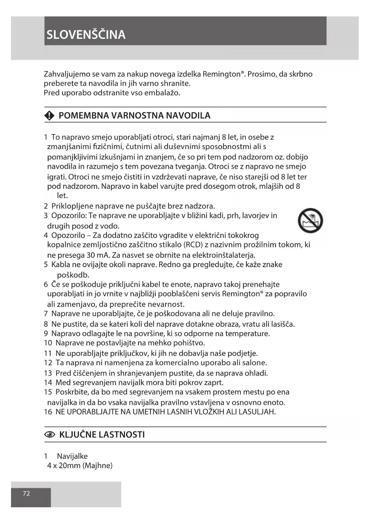 1 To napravo smejo uporabljati otroci, stari najmanj 8 let, in osebe z zmanjšanimi zičnimi, čutnimi ali duševnimi sposobnostmi ali s pomanjkljivimi izkušnjami in znanjem, če so pri tem pod nadzorom oz. dobijo navodila in razumejo s tem povezana tveganja. Otroci se z napravo ne smejo igrati. Otroci ne smejo čistiti in vzdrževati naprave, če niso starejši od 8 let ter pod nadzorom. Napravo in kabel varujte pred dosegom otrok, mlajših od 8 let. 2 Priklopljene naprave ne puščajte brez nadzora. 3 Opozorilo: Te naprave ne uporabljajte v bližini kadi, prh, lavorjev in drugih posod z vodo. 4 Opozorilo – Za dodatno zaščito vgradite v električni tokokrog kopalnice zemljostično zaščitno stikalo (RCD) z nazivnim prožilnim tokom, ki ne presega 30 mA. Za nasvet se obrnite na elektroinštalaterja. 5 Kabla ne ovijajte okoli naprave. Redno ga pregledujte, če kaže znake poškodb. 6 Če se poškoduje priključni kabel te enote, napravo takoj prenehajte uporabljati in jo vrnite v najbližji pooblaščeni servis Remington® za popravilo ali zamenjavo, da preprečite nevarnost. 7 Naprave ne uporabljajte, če je poškodovana ali ne deluje pravilno. 8 Ne pustite, da se kateri koli del naprave dotakne obraza, vratu ali lasišča. 9 Napravo odlagajte le na površine, ki so odporne na temperature. 10 Naprave ne postavljajte na mehko pohištvo. 11 Ne uporabljajte priključkov, ki jih ne dobavlja naše podjetje. 12 Ta naprava ni namenjena za komercialno uporabo ali salone. 13 Pred čiščenjem in shranjevanjem pustite, da se naprava ohladi. 14 Med segrevanjem navijalk mora biti pokrov zaprt. 15 Poskrbite, da bo med segrevanjem na vsakem prostem mestu po ena navijalka in da bo vsaka navijalka pravilno vstavljena v osnovno enoto. 16 NE UPORABLJAJTE NA UMETNIH LASNIH VLOŽKIH ALI LASULJAH.