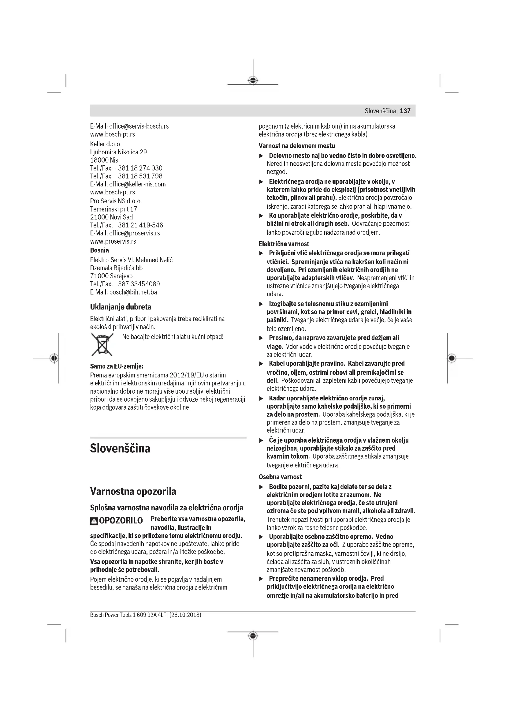 Montirajte paralelni graničnik (17) odnosno ugaoni graničnik (21) pomoću pričvrsnog vijka (20) na električni alat (opciono napred ili pozadi). Montirajte preklopivi graničnik dubine u skladu sa primenom (24) pomoću pričvrsnog vijka (23) na električni alat (opciono napred ili pozadi). Odvrnite navrtanj za fiksiranje (19) i podesite željenu širinu preklopa na skali (18). Ponovo pritegnite navrtanj za fiksiranje (19). Podesite prema potrebi željenu dubinu preklopa preklopivim graničnikom (24). Prođite rendisanje više puta, sve dok se ne dostigne željena dubina falca. Vodite rende sa bočnim pritiskom naleganja. Iskošenje sa ugaonim graničnikom Podesite pri iskošenju preklopa i površina neophodni ugao iskosa podešavanjem ugla (22). Održavanje i servis Održavanje i čišćenje u Izvucite pre svih radova na električnom alatu mrežni utikač iz utičnice. u Držite električni alat i proreze za ventilaciju čiste, da bi dobro i sigurno radili. Držite podnožje za odlaganje (25) slobodnim i redovno ga čistite. Ako su potrošene grafitne četkice električni alat se samostalno isključuje. Električni alat mora da se pošalje u korisnički servis, adrese pogledajte u odeljku „Korisnički servis i saveti za upotrebu“. Ako je potrebna zamena za priključni vod, onda to mora izvesti Bosch ili stručan servis za Bosch-električne alata da bi se izbegle opasnosti po sigurnost. Servis i saveti za upotrebu Servis odgovara na Vaša pitanja u vezi sa popravkom i održavanjem Vašeg proizvoda kao i u vezi sa rezervnim delovima. Šematske prikaze i informacije u vezi rezervnih delova naći ćete i pod: www.bosch-pt.com Bosch tim za konsultacije Vam rado pomaže tokom primene, ukoliko imate pitanja o našim proizvodima i njihovom priboru. Molimo da kod svih pitanja i prilikom naručivanja rezervnih delova neizostavno navedete broj predmeta sa 10brojčanih mesta prema tipskoj tablici proizvoda. Srpski Bosch Elektroservis Dimitrija Tucovića 59 11000 Beograd Tel.: +381 11 644 8546 Tel.: +381 11 744 3122 Tel.: +381 11 641 6291 Fax: +381 11 641 6293E-Mail: office@servis-bosch.rs www.bosch-pt.rs Keller d.o.o. Ljubomira Nikolica 29 18000 Nis Tel./Fax: +381 18 274 030 Tel./Fax: +381 18 531 798 E-Mail: office@keller-nis.com www.bosch-pt.rs Pro Servis NS d.o.o. Temerinski put 17 21000 Novi Sad Tel./Fax: +381 21 419-546 E-Mail: office@proservis.rs www.proservis.rs Bosnia Elektro-Servis Vl. Mehmed Nalić Dzemala Bijedića bb 71000 Sarajevo Tel./Fax: +387 33454089 E-Mail: bosch@bih.net.ba Uklanjanje đubreta Električni alati, pribor i pakovanja treba reciklirati na ekološki prihvatljiv način. Ne bacajte električni alat u kućni otpad! Samo za EU‑zemlje: Prema evropskim smernicama 2012/19/EU o starim električnim i elektronskim uređajima i njihovim pretvaranju u nacionalno dobro ne moraju više upotrebljivi električni pribori da se odvojeno sakupljaju i odvoze nekoj regeneraciji koja odgovara zaštiti čovekove okoline. Slovenščina Varnostna opozorila Splošna varnostna navodila za električna orodja OPOZORILO Preberite vsa varnostna opozorila, navodila, ilustracije in specifikacije, ki so priložene temu električnemu orodju. Če spodaj navedenih napotkov ne upoštevate, lahko pride do električnega udara, požara in/ali težke poškodbe. Vsa opozorila in napotke shranite, ker jih boste v prihodnje še potrebovali. Pojem električno orodje, ki se pojavlja v nadaljnjem besedilu, se nanaša na električna orodja z električnim pogonom (z električnim kablom) in na akumulatorska električna orodja (brez električnega kabla). Varnost na delovnem mestu u Delovno mesto naj bo vedno čisto in dobro osvetljeno. Nered in neosvetljena delovna mesta povečajo možnost nezgod. u Električnega orodja ne uporabljajte v okolju, v katerem lahko pride do eksplozij (prisotnost vnetljivih tekočin, plinov ali prahu). Električna orodja povzročajo iskrenje, zaradi katerega se lahko prah ali hlapi vnamejo. u Ko uporabljate električno orodje, poskrbite, da v bližini ni otrok ali drugih oseb. Odvračanje pozornosti lahko povzroči izgubo nadzora nad orodjem. Električna varnost u Priključni vtič električnega orodja se mora prilegati vtičnici. Spreminjanje vtiča na kakršen koli način ni dovoljeno. Pri ozemljenih električnih orodjih ne uporabljajte adapterskih vtičev. Nespremenjeni vtiči in ustrezne vtičnice zmanjšujejo tveganje električnega udara. u Izogibajte se telesnemu stiku z ozemljenimi površinami, kot so na primer cevi, grelci, hladilniki in pašniki. Tveganje električnega udara je večje, če je vaše telo ozemljeno. u Prosimo, da napravo zavarujete pred dežjem ali vlago. Vdor vode v električno orodje povečuje tveganje za električni udar. u Kabel uporabljajte pravilno. Kabel zavarujte pred vročino, oljem, ostrimi robovi ali premikajočimi se deli. Poškodovani ali zapleteni kabli povečujejo tveganje električnega udara. u Kadar uporabljate električno orodje zunaj, uporabljajte samo kabelske podaljške, ki so primerni za delo na prostem. Uporaba kabelskega podaljška, ki je primeren za delo na prostem, zmanjšuje tveganje za električni udar. u Če je uporaba električnega orodja v vlažnem okolju neizogibna, uporabljajte stikalo za zaščito pred kvarnim tokom. Uporaba zaščitnega stikala zmanjšuje tveganje električnega udara. Osebna varnost u Bodite pozorni, pazite kaj delate ter se dela z električnim orodjem lotite z razumom. Ne uporabljajte električnega orodja, če ste utrujeni oziroma če ste pod vplivom mamil, alkohola ali zdravil. Trenutek nepazljivosti pri uporabi električnega orodja je lahko vzrok za resne telesne poškodbe. u Uporabljajte osebno zaščitno opremo. Vedno uporabljajte zaščito za oči. Z uporabo zaščitne opreme, kot so protiprašna maska, varnostni čevlji, ki ne drsijo, čelada ali zaščita za sluh, v ustreznih okoliščinah zmanjšate nevarnost poškodb. u Preprečite nenameren vklop orodja. Pred priključitvijo električnega orodja na 