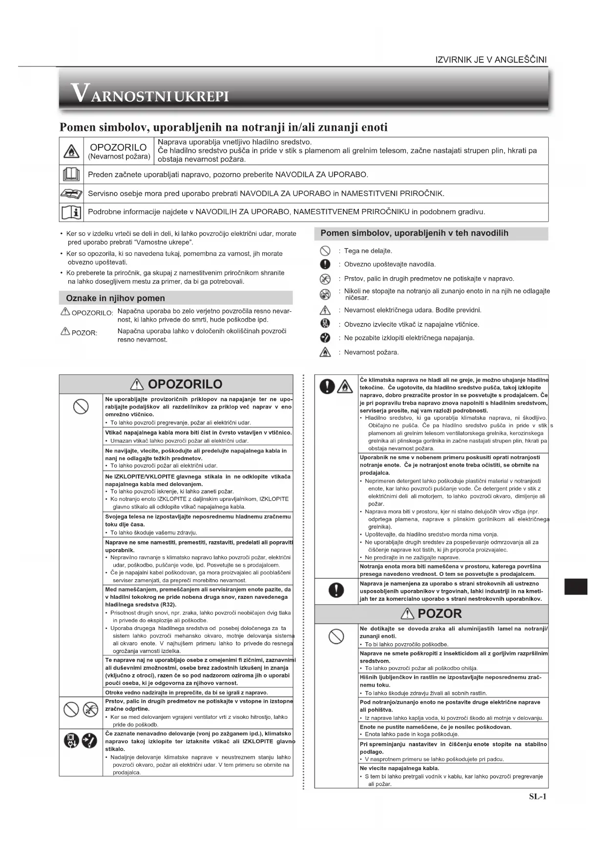 SL SL• Ker so v izdelku vrteči se deli in deli, ki lahko povzročijo električni udar, morate pred uporabo prebrati “Varnostne ukrepe”.• Ker so opozorila, ki so navedena tukaj, pomembna za varnost, jih morate obvezno upoštevati.• Ko preberete ta priročnik, ga skupaj z namestitvenim priročnikom shranite na lahko dosegljivem mestu za primer, da bi ga potrebovali. Oznake in njihov pomen OPOZORILO:Napačna uporaba bo zelo verjetno povzročila resno nevar-nost, ki lahko privede do smrti, hude poškodbe ipd. POZOR:Napačna uporaba lahko v določenih okoliščinah povzroči resno nevarnost. VARNOSTNI UKREPI Pomen simbolov, uporabljenih na notranji in/ali zunanji enoti OPOZORILO (Nevarnost požara)Naprava uporablja vnetljivo hladilno sredstvo.Če hladilno sredstvo pušča in pride v stik s plamenom ali grelnim telesom, začne nastajati strupen plin, hkrati pa obstaja nevarnost požara.Preden začnete uporabljati napravo, pozorno preberite NAVODILA ZA UPORABO.Servisno osebje mora pred uporabo prebrati NAVODILA ZA UPORABO in NAMESTITVENI PRIROČNIK.Podrobne informacije najdete v NAVODILIH ZA UPORABO, NAMESTITVENEM PRIROČNIKU in podobnem gradivu. OPOZORILO Ne uporabljajte provizoričnih priklopov na napajanje ter ne upo-rabljajte podaljškov ali razdelilnikov za priklop več naprav v eno omrežno vtičnico.• To lahko povzroči pregrevanje, požar ali električni udar.Vtikač napajalnega kabla mora biti čist in čvrsto vstavljen v vtičnico.• Umazan vtikač lahko povzroči požar ali električni udar.Ne navijajte, vlecite, poškodujte ali predelujte napajalnega kabla in nanj ne odlagajte težkih predmetov.• To lahko povzroči požar ali električni udar.Ne IZKLOPITE/VKLOPITE glavnega stikala in ne odklopite vtikača napajalnega kabla med delovanjem.• To lahko povzroči iskrenje, ki lahko zaneti požar.• Ko notranjo enoto IZKLOPITE z daljinskim upravljalnikom, IZKLOPITE glavno stikalo ali odklopite vtikač napajalnega kabla. Svojega telesa ne izpostavljajte neposrednemu hladnemu zračnemu toku dlje časa.• To lahko škoduje vašemu zdravju.Naprave ne sme namestiti, premestiti, razstaviti, predelati ali popraviti uporabnik.• Nepravilno ravnanje s klimatsko napravo lahko povzroči požar, električni udar, poškodbo, puščanje vode, ipd. Posvetujte se s prodajalcem.• Če je napajalni kabel poškodovan, ga mora proizvajalec ali pooblaščeni serviser zamenjati, da prepreči morebitno nevarnost.Med nameščanjem, premeščanjem ali servisiranjem enote pazite, da v hladilni tokokrog ne pride nobena druga snov, razen navedenega hladilnega sredstva (R32).• Prisotnost drugih snovi, npr. zraka, lahko povzroči neobičajen dvig tlaka in privede do eksplozije ali poškodbe.• Uporaba drugega hladilnega sredstva od posebej določenega za ta sistem lahko povzroči mehansko okvaro, motnje delovanja sistema ali okvaro enote. V najhujšem primeru lahko to privede do resnega ogrožanja varnosti izdelka.Te naprave naj ne uporabljajo osebe z omejenimi fi zičnimi, zaznavnimi ali duševnimi zmožnostmi, osebe brez zadostnih izkušenj in znanja (vključno z otroci), razen če so pod nadzorom oziroma jih o uporabi pouči oseba, ki je odgovorna za njihovo varnost.Otroke vedno nadzirajte in preprečite, da bi se igrali z napravo. Prstov, palic in drugih predmetov ne potiskajte v vstopne in izstopne zračne odprtine.• Ker se med delovanjem vgrajeni ventilator vrti z visoko hitrostjo, lahko pride do poškodb. Če zaznate nenavadno delovanje (vonj po zažganem ipd.), klimatsko napravo takoj izklopite ter iztaknite vtikač ali IZKLOPITE glavno stikalo.• Nadaljnje delovanje klimatske naprave v neustreznem stanju lahko povzroči okvaro, požar ali električni udar. V tem primeru se obrnite na prodajalca. Pomen simbolov, uporabljenih v teh navodilih : Tega ne delajte. : Obvezno upoštevajte navodila. : Prstov, palic in drugih predmetov ne potiskajte v napravo. : Nikoli ne stopajte na notranjo ali zunanjo enoto in na njih ne odlagajte ničesar. : Nevarnost električnega udara. Bodite previdni. : Obvezno izvlecite vtikač iz napajalne vtičnice. : Ne pozabite izklopiti električnega napajanja. : Nevarnost požara. Če klimatska naprava ne hladi ali ne greje, je možno uhajanje hladilne tekočine. Če ugotovite, da hladilno sredstvo pušča, takoj izklopite napravo, dobro prezračite prostor in se posvetujte s prodajalcem. Če je pri popravilu treba napravo znova napolniti s hladilnim sredstvom, serviserja prosite, naj vam razloži podrobnosti.• Hladilno sredstvo, ki ga uporablja klimatska naprava, ni škodljivo. Običajno ne pušča. Če pa hladilno sredstvo pušča in pride v stik s plamenom ali grelnim telesom ventilatorskega grelnika, kerozinskega grelnika ali plinskega gorilnika in začne nastajati strupen plin, hkrati pa obstaja nevarnost požara.Uporabnik ne sme v nobenem primeru poskusiti oprati notranjosti notranje enote. Če je notranjost enote treba očistiti, se obrnite na prodajalca.• Neprimeren detergent lahko poškoduje plastični material v notranjosti enote, kar lahko povzroči puščanje vode. Če detergent pride v stik z električnimi deli ali motorjem, to lahko povzroči okvaro, dimljenje ali požar.• Naprava mora biti v prostoru, kjer ni stalno delujočih virov vžiga (npr. odprtega plamena, naprave s plinskim gorilnikom ali električnega grelnika).• Upoštevajte, da hladilno sredstvo morda nima vonja.• Ne uporabljajte drugih sredstev za pospeševanje odmrzovanja ali za čiščenje naprave kot tistih, ki jih priporoča proizvajalec.• Ne predirajte in ne zažigajte naprave.Notranja enota mora biti nameščena v prostoru, katerega površina presega navedeno vrednost. O tem se posvetujte s prodajalcem.Naprava je namenjena za uporabo s strani strokovnih ali ustrezno usposobljenih uporabnikov v trgovinah, lahki industriji in na kmeti-jah ter za komercialno uporabo s strani nestrokovnih uporabnikov. POZOR Ne dotikajte se dovoda zraka ali aluminijastih lamel na notranj