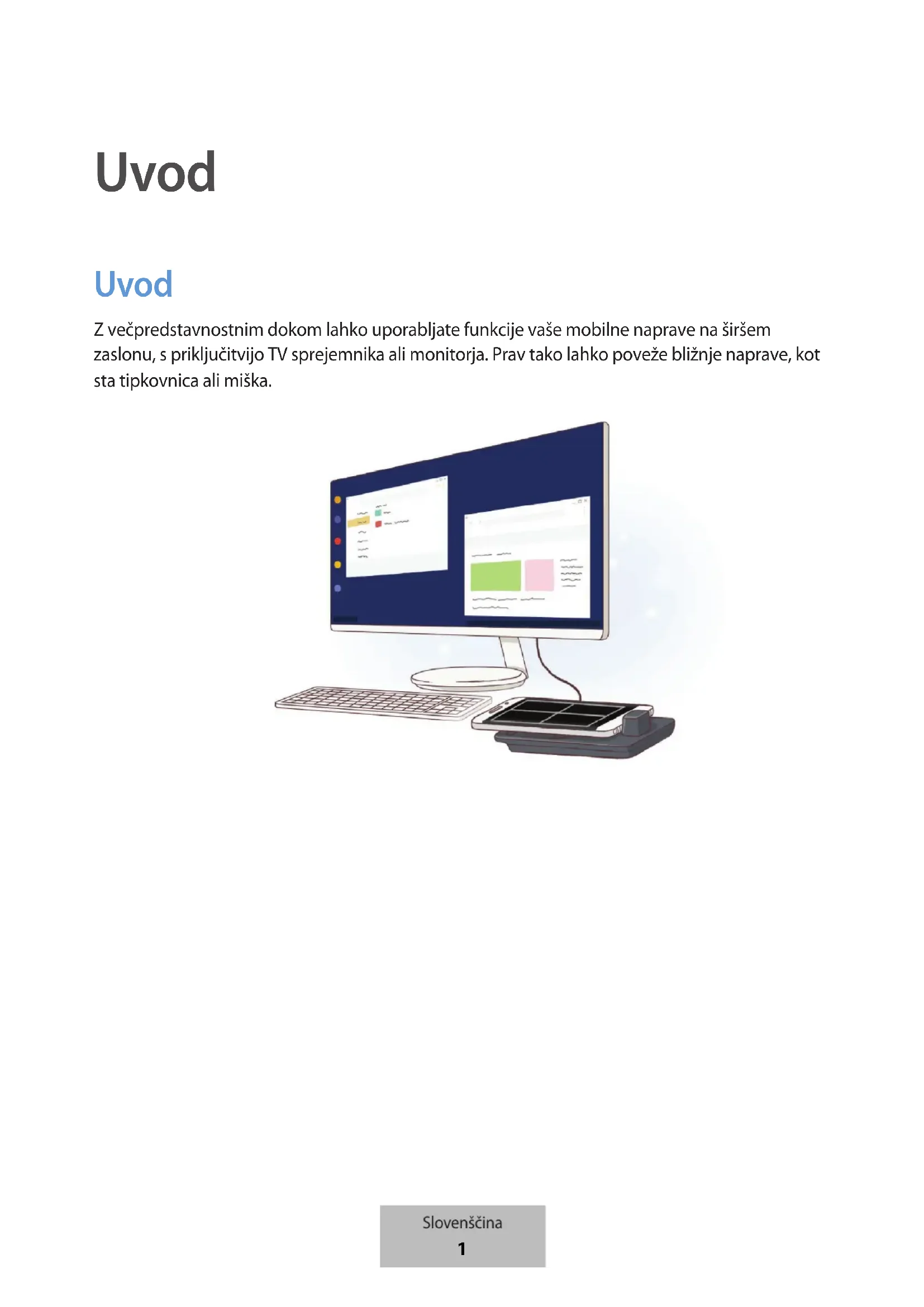 Uvod Uvod Z večpredstavnostnim dokom lahko uporabljate funkcije vaše mobilne naprave na širšem zaslonu, s priključitvijo TV sprejemnika ali monitorja. Prav tako lahko poveže bližnje naprave, kot sta tipkovnica ali miška. Slovenščina 1Uvod
