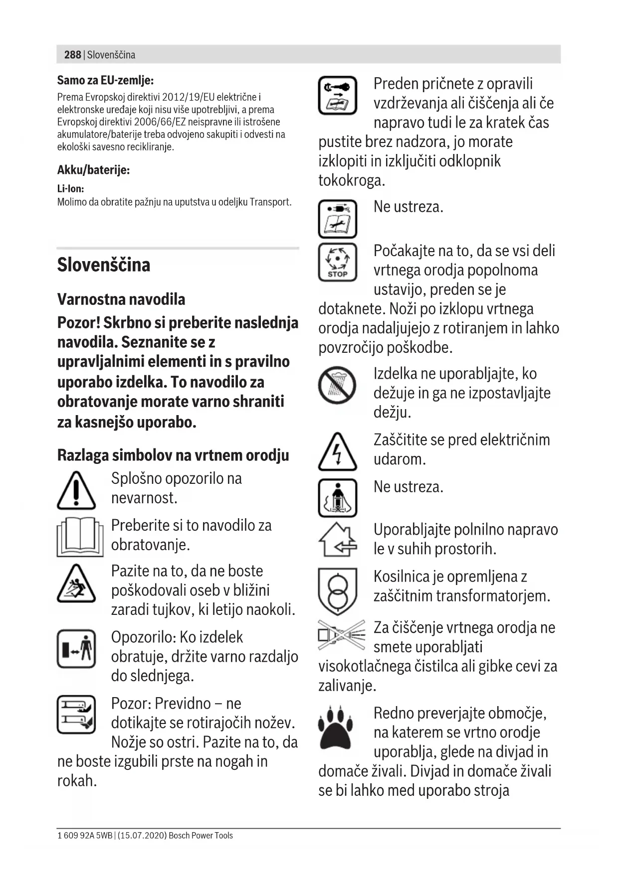 Prikazan ali opisan pribor ni del standardnega obsega dobave. Celoten pribor je del našega programa pribora. Zagon Za vašo varnost u Pozor! Pred začetkom opravil vzdrževanja ali čiščenja izklopite vrtno orodje, izključite odklopnik tokokroga in odstranite akumulatorsko baterijo. Enako velja v primeru, ko je kabel stikala poškodovan, narezan ali zamotan. u Po izključitvi vrtnega orodja se vrtijo noži še nekaj sekund naprej. u Pozor: Ne dotikajte se vrtečega rezalnega noža. Bosch Power Tools 1 609 92A 5WB | (15.07.2020)296 | Slovenščina Polnjenje akumulatorske baterije Akumulatorska baterija je opremljena z nadzorom temperature, ki dovoljuje polnjenje le v temperaturnem območju med 0 °C in 35 °C. Tako je zagotovljena dolga življenjska doba akumulatorske baterije. Napotek: Akumulatorska baterija je pri dobavi delno napolnjena. Da bi lahko akumulatorska baterija razvila svojo polno zmogljivost, jo morate pred prvo uporabo v celoti napolniti v polnilni napravi. Litij-ionsko akumulatorsko baterijo lahko kadarkoli napolnite, ne da bi pri tem skrajšali življenjsko dobo. Prekinitev postopka polnjenja akumulatorske baterije ne poškoduje. Litij-ionska akumulatorska baterija je zaščitena pred prekomerno izpraznitvijo s sistemom elektronske zaščite celic "Electronic Cell Protection (ECP)". Pri izpraznjeni akumulatorski bateriji zaščitno stikalo izklopi izdelek: Vrtno orodje preneha delovati. Vklopno/izklopnega stikala po samodejnem izklopu izdelka ne smete več pritiskati. S tem lahko poškodujete akumulatorsko baterijo. Upoštevajte navodila za odstranjevanje akumulatorskih baterij. Namestitev/odstranitev akumulatorske baterije Opozorilo: Če uporabljate akumulatorske baterije, ki niso primerne, lahko to povzroči poškodbo naprave. Vstavite napolnjeno akumulatorsko baterijo. Zagotovite, da bo akumulatorska baterija v celoti vstavljena. Za odstranitev akumulatorske baterije iz naprave, pritisnite deblokirno tipko akumulatorske baterije in potegnite akumulatorsko baterijo ven. Postopek polnjenja Polnilni postopek se prične takoj, ko vtaknete omrežni vtič polnilne naprave v vtičnico in vstavite akumulatorsko baterijo v polnilno napravo . Inteligentni postopek polnjenja omogoča takojšnje zaznavanje napolnjenosti akumulatorske baterije in odvisno od temperature in napetosti akumulatorske baterije se bo izbral optimalni polnilni tok. Ta način zagotavlja ohranitev akumulatorske baterije, ki bo pri namestitvi v polnilni napravi vedno do konca napolnjen. Pomen prikazovalnih elementov na polnilni napravi (AL 3620 CV/AL 3640 CV/AL 36V-20) Postopek hitrega polnjenja Postopek hitrega polnjenja se prikaže z utripanjem zelenega prikaza polnjenja akumulatorske baterije. Prikazovalni element na akumulatorski bateriji: Med postopkom napolnitve zasvetijo LED druga za drugo in za kratek čas izginejo. Akumulatorska baterija je v celoti napolnjena, kadar LED trajno svetijo. Pribl. 5minut po polni popolni napolnitvi akumulatorske baterije tri zelene LED ponovno ugasnejo. Opozorilo: Postopek hitrega polnjenja je možen samo, ko se temperatura akumulatorske baterije nahaja v dovoljenem območju temperature, glejte poglavje "Tehnični podatki". Akumulatorska baterija je napolnjena Trajno svetleč zelen prikaz LED signalizira, da je akumulatorska baterija v celoti napolnjena. Dodatno zaslišite za obdobje pribl. 2 sekundi zvočni signal, ki tudi akustično signalizira popolno napolnjenost akumulatorske baterije. Sedaj lahko vzamete akumulatorsko baterijo ven in jo uporabite. Brez vstavljene akumulatorske baterije signalizira trajno svetleč prikaz LED, da je omrežni vtič vstavljen v vtičnico in da je polnilna naprava pripravljena za uporabo. Temperatura akumulatorske baterije pod 0° ali nad 45°C Trajno svetleč rdeč prikaz LED prikazuje, da je temperatura akumulatorske baterije izven dovoljenega temperaturnega območja za polnjenje, glejte odstavek "Tehnični podatki". Pri dosegu dovoljenega območja temperature se polnilna naprava avtomatsko preklopi na postopek za hitro polnjenje. Če se temperatura akumulatorske baterije nahaja zunaj dovoljenega območja temperature za polnjenje, se pri vstavljanju v polnilno napravo zasveti rdeča LED akumulatorske baterije. Polnjenje ni možno Če se pri postopku polnjenja pojavi druga motnja, se to prikaže z utripanjem rdečega prikaza LED. Postopek polnjenja se ne more zagnati in polnjenje akumulatorske baterije ni možno (glejte odsek "Iskanje napak"). Opozorila glede polnjenja Pri neprekinjenih oziroma zaporednih ciklusih polnjenja brez vmesne prekinitve se lahko polnilnik segreje. Vendar to ni problematično in ne pomeni, da ima polnilnik kakšno tehnično okvaro. Močno skrajšan čas delovanja po napolnitvi nakazuje, da je akumulatorska baterija izrabljena in se mora nadomestiti. Upoštevajte navodila za odstranjevanje odsluženih naprav. Hlajenje akumulatorske baterije (Active Air Cooling) Upravljalnik ventilatorja, ki je vgrajen v polnilnik, nadzira temperaturo vstavljene akumulatorske baterije. Če je temperatura akumulatorske baterije nad 30 °C, se akumulatorska baterija ohlajuje s pomočjo ventilatorja na optimalno temperaturo za polnjenje. Ko je ventilator vklopljen, se sliši zvok prezračevalne enote. Če ventilator ne deluje, je temperatura akumulatorske baterije v optimalnem temperaturnem območju za polnjenje ali pa je ventilator v okvari. V tem primeru se podaljša čas polnjenja akumulatorske baterije. 1 609 92A 5WB | (15.07.2020) Bosch Power ToolsSlovenščina | 297 Delovna navodila Prikaz napolnjenosti akumulatorske baterije Akumulatorska baterija je obremljena s prikazovalnikom napolnjenosti, ki prikazuje stanje napolnjenosti akumulatorske baterije. Prikazovalnik napolnjenosti sestoji iz 3 zelenih LED. Pritisnite tipko za prikazovalnik stanja napolnjenosti in ga s tem aktivirajte. 5sek. se prikazovalnik stanja napolnjenosti samostojno ugasne. Stanje napolnjenosti lahko preverite tudi, ko akumulatorska baterija ni v nap