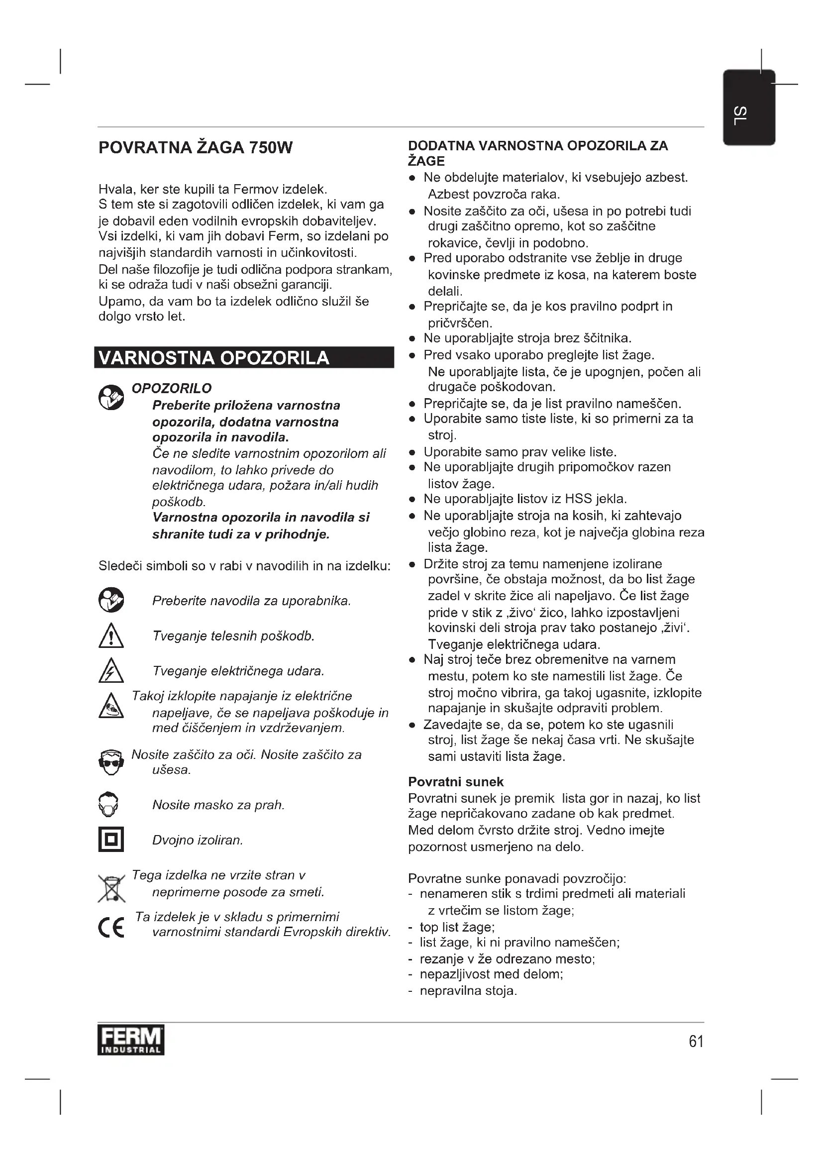 ŽAGE ● Ne obdelujte materialov, ki vsebujejo azbest. Azbest povzroča raka. ● Nosite zaščito za oči, ušesa in po potrebi tudi drugi zaščitno opremo, kot so zaščitne rokavice, čevlji in podobno. ● Pred uporabo odstranite vse žeblje in druge kovinske predmete iz kosa, na katerem boste delali. ● Prepričajte se, da je kos pravilno podprt in pričvrščen. ● Ne uporabljajte stroja brez ščitnika. ● Pred vsako uporabo preglejte list žage. Ne uporabljajte lista, če je upognjen, počen ali drugače poškodovan. ● Prepričajte se, da je list pravilno nameščen. ● Uporabite samo tiste liste, ki so primerni za ta stroj. ● Uporabite samo prav velike liste. ● Ne uporabljajte drugih pripomočkov razen listov žage. ● Ne uporabljajte listov iz HSS jekla. ● Ne uporabljajte stroja na kosih, ki zahtevajo večjo globino reza, kot je največja globina reza lista žage. ● Držite stroj za temu namenjene izolirane površine, če obstaja možnost, da bo list žage zadel v skrite žice ali napeljavo. Če list žage pride v stik z ‚živo‘ žico, lahko izpostavljeni kovinski deli stroja prav tako postanejo ‚živi‘. Tveganje električnega udara. ● Naj stroj teče brez obremenitve na varnem mestu, potem ko ste namestili list žage. Če stroj močno vibrira, ga takoj ugasnite, izklopite napajanje in skušajte odpraviti problem. ● Zavedajte se, da se, potem ko ste ugasnili stroj, list žage še nekaj časa vrti. Ne skušajte sami ustaviti lista žage. Povratni sunek Povratni sunek je premik lista gor in nazaj, ko list žage nepričakovano zadane ob kak predmet. Med delom čvrsto držite stroj. Vedno imejte pozornost usmerjeno na delo. Povratne sunke ponavadi povzročijo: - nenameren stik s trdimi predmeti ali materiali z vrtečim se listom žage; - top list žage; - list žage, ki ni pravilno nameščen; - rezanje v že odrezano mesto; - nepazljivost med delom; - nepravilna stoja.62