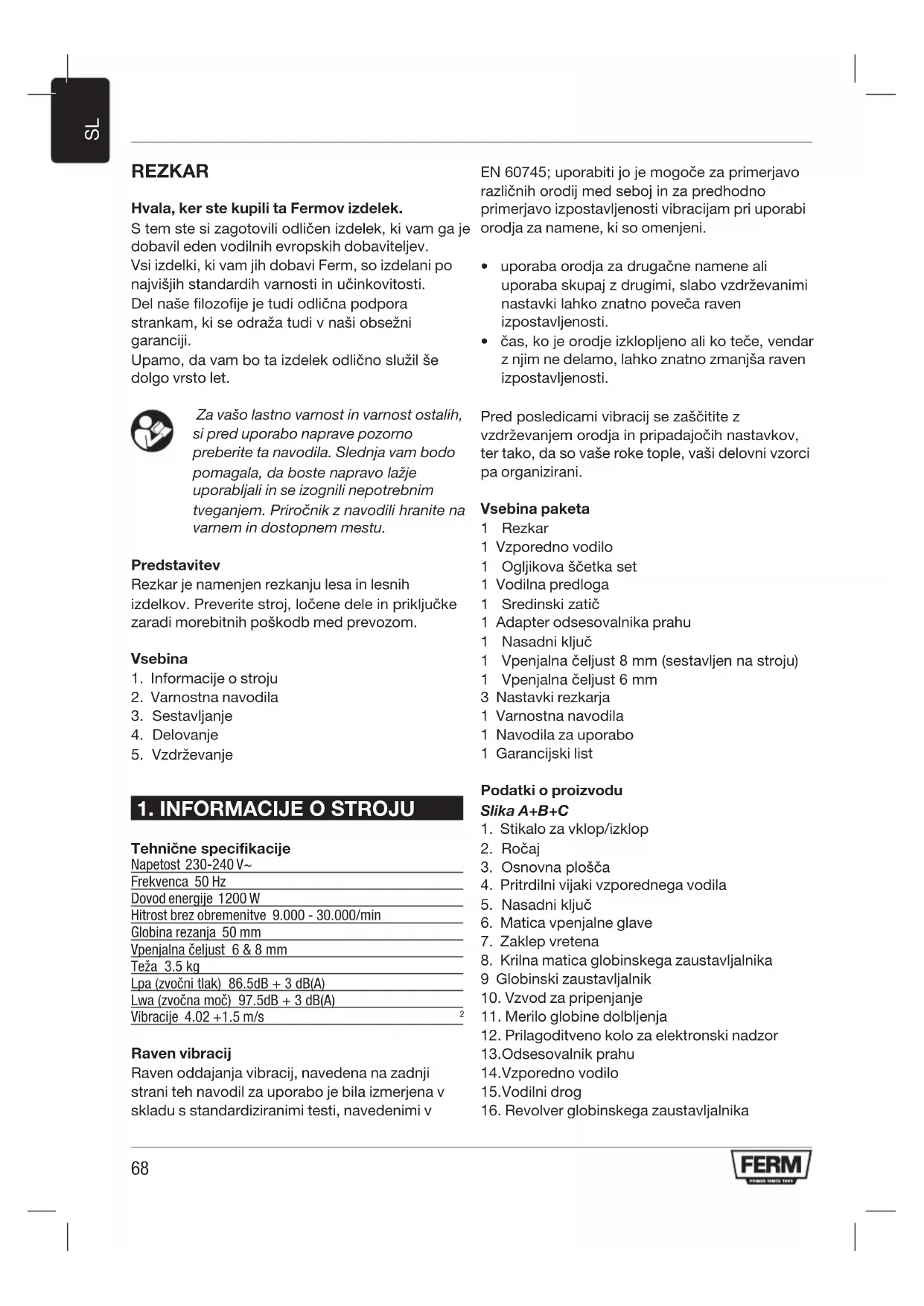 REZKAR Hvala, ker ste kupili ta Fermov izdelek. S tem ste si zagotovili odličen izdelek, ki vam ga je dobavil eden vodilnih evropskih dobaviteljev. Vsi izdelki, ki vam jih dobavi Ferm, so izdelani po najvišjih standardih varnosti in učinkovitosti. Del naše filozofije je tudi odlična podpora strankam, ki se odraža tudi v naši obsežni garanciji. Upamo, da vam bo ta izdelek odlično služil še dolgo vrsto let. Za vašo lastno varnost in varnost ostalih, si pred uporabo naprave pozorno preberite ta navodila. Slednja vam bodo pomagala, da boste napravo lažje uporabljali in se izognili nepotrebnim tveganjem. Priročnik z navodili hranite na varnem in dostopnem mestu. Predstavitev Rezkar je namenjen rezkanju lesa in lesnih izdelkov. Preverite stroj, ločene dele in priključke zaradi morebitnih poškodb med prevozom. Vsebina