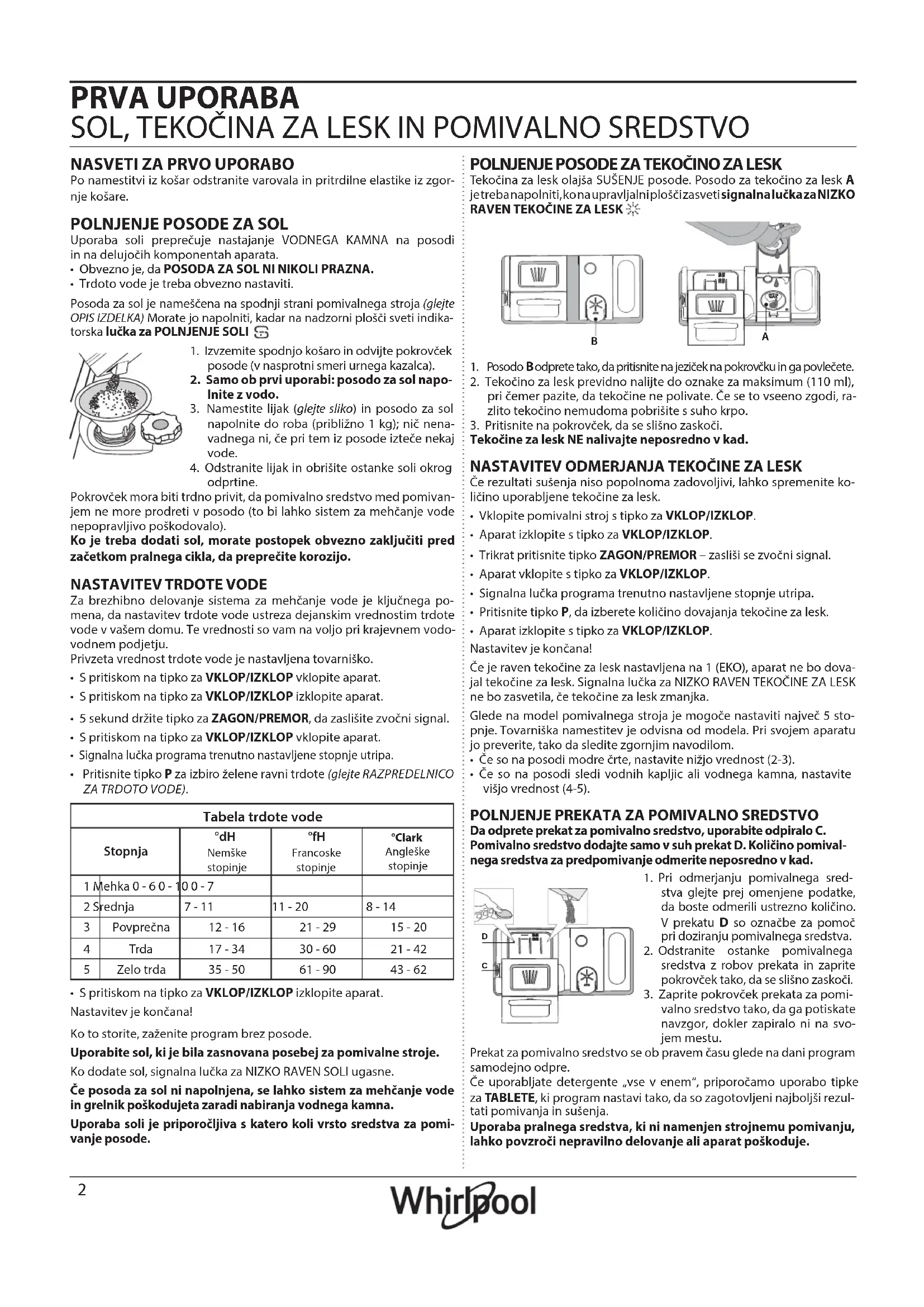 - S pritiskom na tipko za VKLOP/IZKLOP izklopite aparat.Nastavitev je končana!Ko to storite, zaženite program brez posode.Uporabite sol, ki je bila zasnovana posebej za pomivalne stroje.Ko dodate sol, signalna lučka za NIZKO RAVEN SOLI ugasne.Če posoda za sol ni napolnjena, se lahko sistem za mehčanje vode in grelnik poškodujeta zaradi nabiranja vodnega kamna.Uporaba soli je priporočljiva s katero koli vrsto sredstva za pomi-vanje posode. POLNJENJE POSODE ZA TEKOČINO ZA LESK Tekočina za lesk olajša SUŠENJE posode. Posodo za tekočino za lesk A je treba napolniti, ko na upravljalni plošči zasveti signalna lučka za NIZKO RAVEN TEKOČINE ZA LESK .