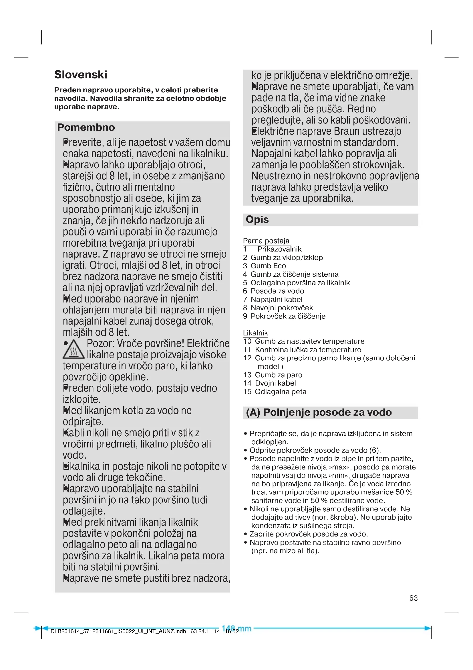 Električne naprave Braun ustrezajo veljavnim varnostnim standardom. Napajalni kabel lahko popravlja ali zamenja le pooblaščen strokovnjak. Neustrezno in nestrokovno popravljena naprava lahko predstavlja veliko tveganje za uporabnika. Opis Parna postaja 1 Prikazovalnik 2 Gumb za vklop/izklop 3 Gumb Eco 4 Gumb za čiščenje sistema 5 Odlagalna površina za likalnik 6 Posoda za vodo 7 Napajalni kabel 8 Navojni pokrovček 9 Pokrovček za čiščenje Likalnik 10 Gumb za nastavitev temperature 11 Kontrolna lučka za temperaturo 12 Gumb za precizno parno likanje (samo določeni modeli) 13 Gumb za paro 14 Dvojni kabel 15 Odlagalna peta (A) Polnjenje posode za vodo