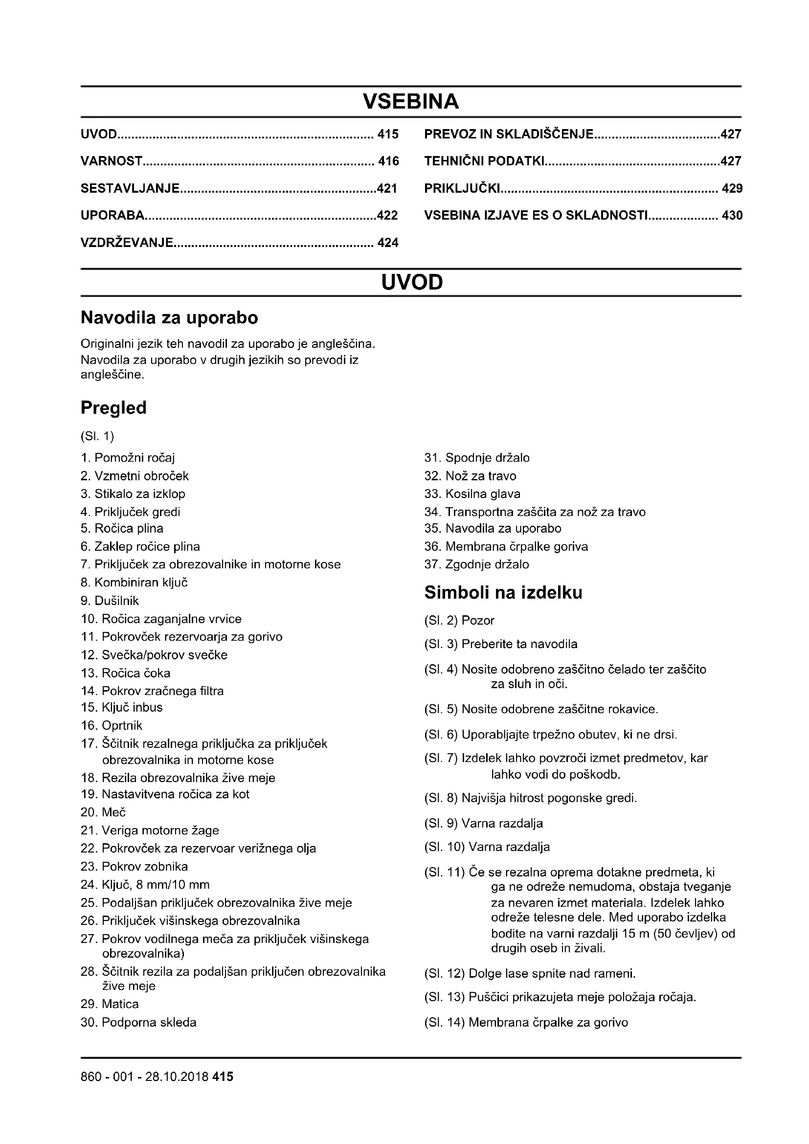 Simboli na izdelku (Sl. 2) Pozor (Sl. 3) Preberite ta navodila (Sl. 4) Nosite odobreno zaščitno čelado ter zaščito za sluh in oči. (Sl. 5) Nosite odobrene zaščitne rokavice. (Sl. 6) Uporabljajte trpežno obutev, ki ne drsi. (Sl. 7) Izdelek lahko povzroči izmet predmetov, kar lahko vodi do poškodb. (Sl. 8) Najvišja hitrost pogonske gredi. (Sl. 9) Varna razdalja (Sl. 10) Varna razdalja (Sl. 11) Če se rezalna oprema dotakne predmeta, ki ga ne odreže nemudoma, obstaja tveganje za nevaren izmet materiala. Izdelek lahko odreže telesne dele. Med uporabo izdelka bodite na varni razdalji 15 m (50 čevljev) od drugih oseb in živali. (Sl. 12) Dolge lase spnite nad rameni. (Sl. 13) Puščici prikazujeta meje položaja ročaja. (Sl. 14) Membrana črpalke za gorivo