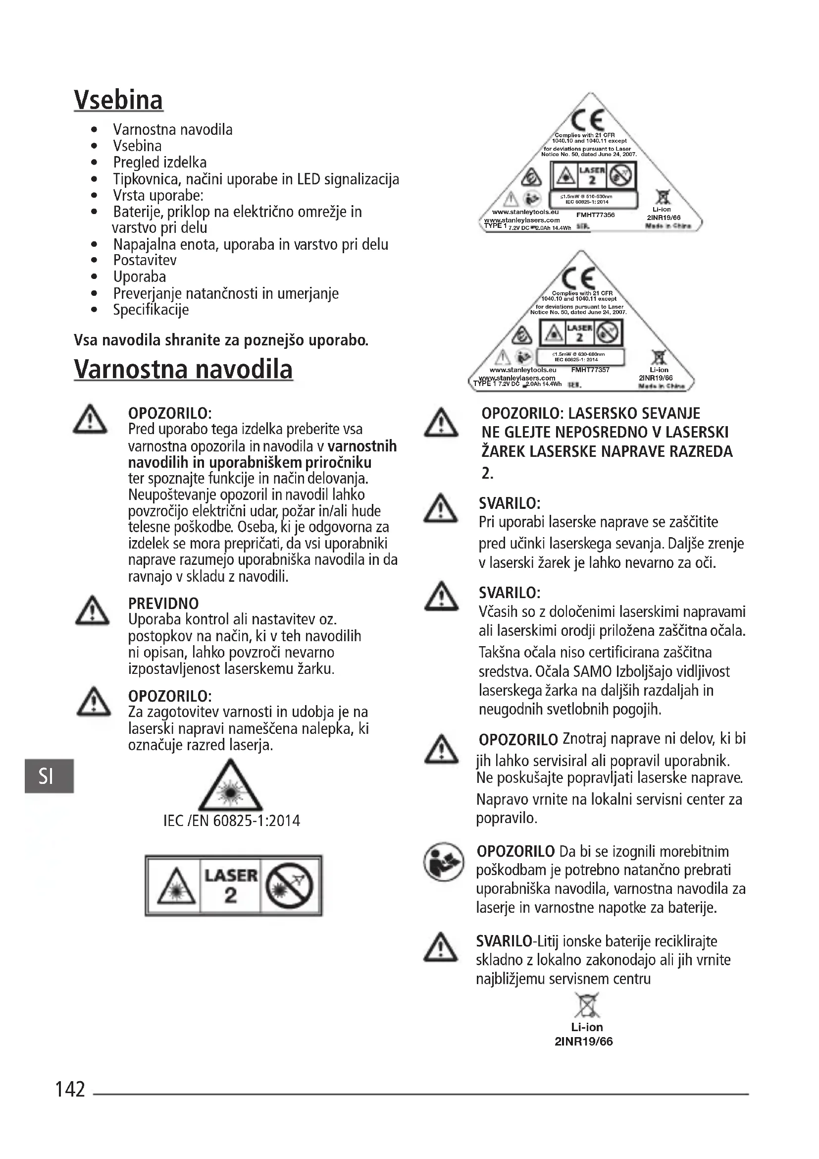 - Laserske naprave ni mogoče servisirati in jo je treba vprimeru okvare ali poškodbe vrniti pooblaščenemu trgovcu Stanley/servisnem centru. Vprimeru okvare, lahko napravo popravi le pooblaščeni serviser, ki bo uporabil originalne rezervne dele. To je zagotovilo, da se ohrani pravilno delovanje in varnost naprave.145