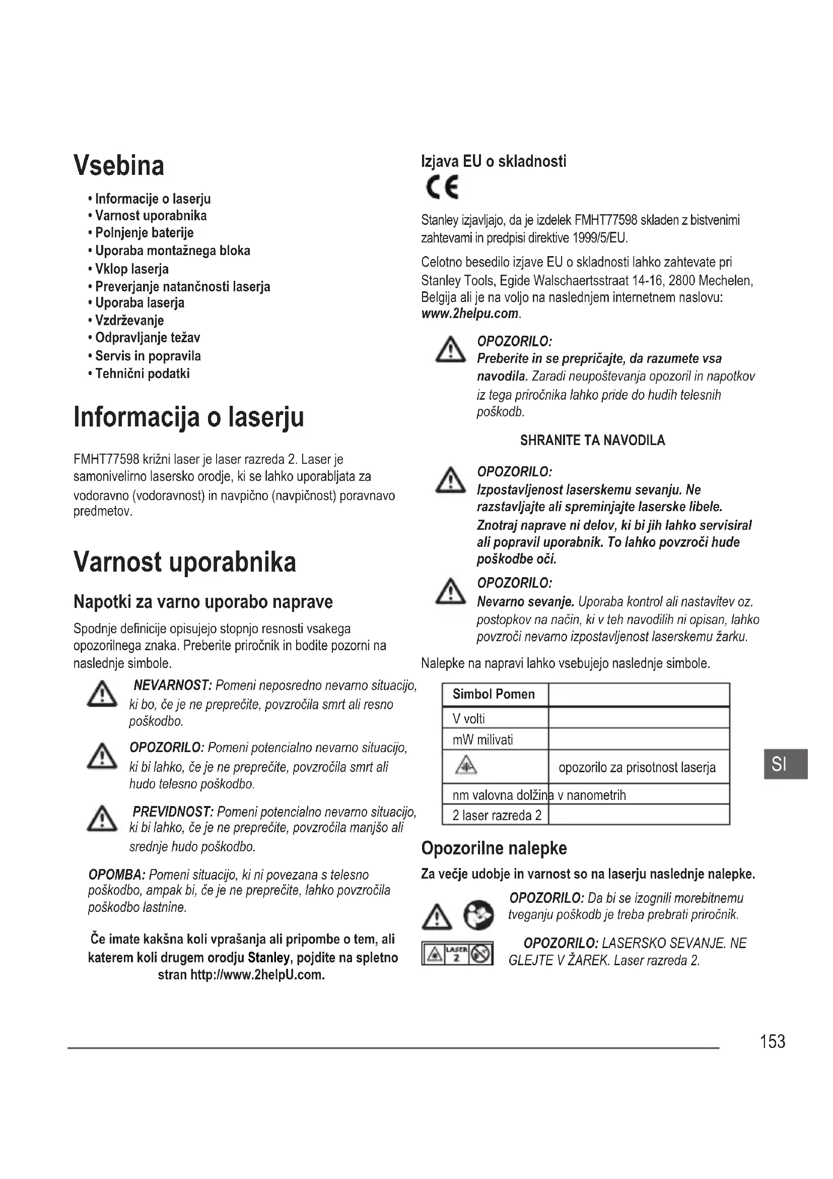 - Tehnični podatki Informacija o laserju FMHT77598 križni laser je laser razreda 2. Laser je samonivelirno lasersko orodje, ki se lahko uporabljata za vodoravno (vodoravnost) in navpično (navpičnost) poravnavo predmetov. Varnost uporabnika Napotki za varno uporabo naprave Spodnje denicije opisujejo stopnjo resnosti vsakega opozorilnega znaka. Preberite priročnik in bodite pozorni na naslednje simbole. NEVARNOST: Pomeni neposredno nevarno situacijo, ki bo, če je ne preprečite, povzročila smrt ali resno poškodbo. OPOZORILO: Pomeni potencialno nevarno situacijo, ki bi lahko, če je ne preprečite, povzročila smrt ali hudo telesno poškodbo. PREVIDNOST: Pomeni potencialno nevarno situacijo, ki bi lahko, če je ne preprečite, povzročila manjšo ali srednje hudo poškodbo. OPOMBA: Pomeni situacijo, ki ni povezana s telesno poškodbo, ampak bi, če je ne preprečite, lahko povzročila poškodbo lastnine. Če imate kakšna koli vprašanja ali pripombe o tem, ali katerem koli drugem orodju Stanley, pojdite na spletno stran http://www.2helpU.com. Izjava EU o skladnosti Stanley izjavljajo, da je izdelek FMHT77598 skladen z bistvenimi zahtevami in predpisi direktive 1999/5/EU. Celotno besedilo izjave EU o skladnosti lahko zahtevate pri Stanley Tools, Egide Walschaertsstraat 14-16, 2800 Mechelen, Belgija ali je na voljo na naslednjem internetnem naslovu: www.2helpu.com. OPOZORILO: Preberite in se prepričajte, da razumete vsa navodila. Zaradi neupoštevanja opozoril in napotkov iz tega priročnika lahko pride do hudih telesnih poškodb.