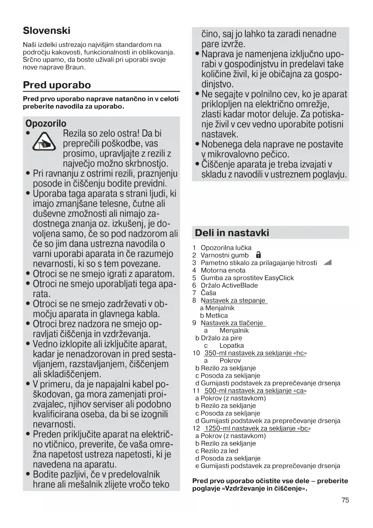 Čiščenje aparata je treba izvajati v skladu z navodili v ustreznem poglavju. Deli in nastavki 1 Opozorilna lučka 2 Varnostni gumb 3 Pametno stikalo za prilagajanje hitrosti 4 Motorna enota 5 Gumba za sprostitev EasyClick 6 Držalo ActiveBlade 7 Čaša 8 Nastavek za stepanje a Menjalnik b Metlica 9 Nastavek za tlačenje a Menjalnik b Držalo za pire c Lopatka 10 350-ml nastavek za sekljanje «hc» a Pokrov b Rezilo za sekljanje c Posoda za sekljanje d Gumijasti podstavek za preprečevanje drsenja 11 500-ml nastavek za sekljanje «ca» a Pokrov (z nastavkom) b Rezilo za sekljanje c Posoda za sekljanje d Gumijasti podstavek za preprečevanje drsenja 12 1250-ml nastavek za sekljanje «bc» a Pokrov (z nastavkom) b Rezilo za sekljanje c Rezilo za led d Posoda za sekljanje e Gumijasti podstavek za preprečevanje drsenja Pred prvo uporabo očistite vse dele – preberite poglavje «Vzdrževanje in čiščenje». 5722112414_MQ9045X_INT_S6-116.indd 75 17.10.16 11:2176 Opozorilna lučka Opozorilna lučka (1) prikazuje stanje naprave, ko je priključena v električno vtičnico. Opozorilna luĀka Stanje naprave / delovanja Utripa rdeȏe Naprava je pripravljena za uporabo. Zelena Naprava je sprošȏena (pritisnjen je bil gumb za sprostitev) in jo lahko vklopite. Rdeȏa Zgodnje opozorilo pred pregre- vanjem. Delovanje motorja se postopoma upoȏasni, dokler se motor ne izklopi. Poȏakajte, da se naprava ohladi. Napravo lahko ponovno zaȏnete uporabljati, ko opozorilna luȏka utripa v rdeȏi barvi. Če se največja dovoljena hitrost zmanjša zaradi visoke obremenitve in dolgega obratovanja, lahko še vedno dokončate pripravo živil, vendar priporočamo, da nato napravo ohladite. Uporaba naprave Pametno stikalo za prilagajanje hitrosti Z enim pritiskom imate na voljo vse hitrosti. Močnejši, kot je stisk, višja je hitrost. Višja, kot je hitrost, hitrejše in bolj natančno bo mešanje ter sekljanje. Enoročno delovanje: pametno stikalo za prilagajanje hitrosti (3) vam omogoča, da vklopite napravo in prilagajate hitrost z eno roko. Delovanje ročnega mešalnika Prva uporaba: z motorne enote (4) odstranite transportno blokado tako, da povlečete rdeč trak. Vklop (A) Naprava ima vgrajen varnostni gumb za sprostitev pametnega stikala za prilagajanje hitrosti. Če želite napravo varno vklopiti, sledite tem navodilom: