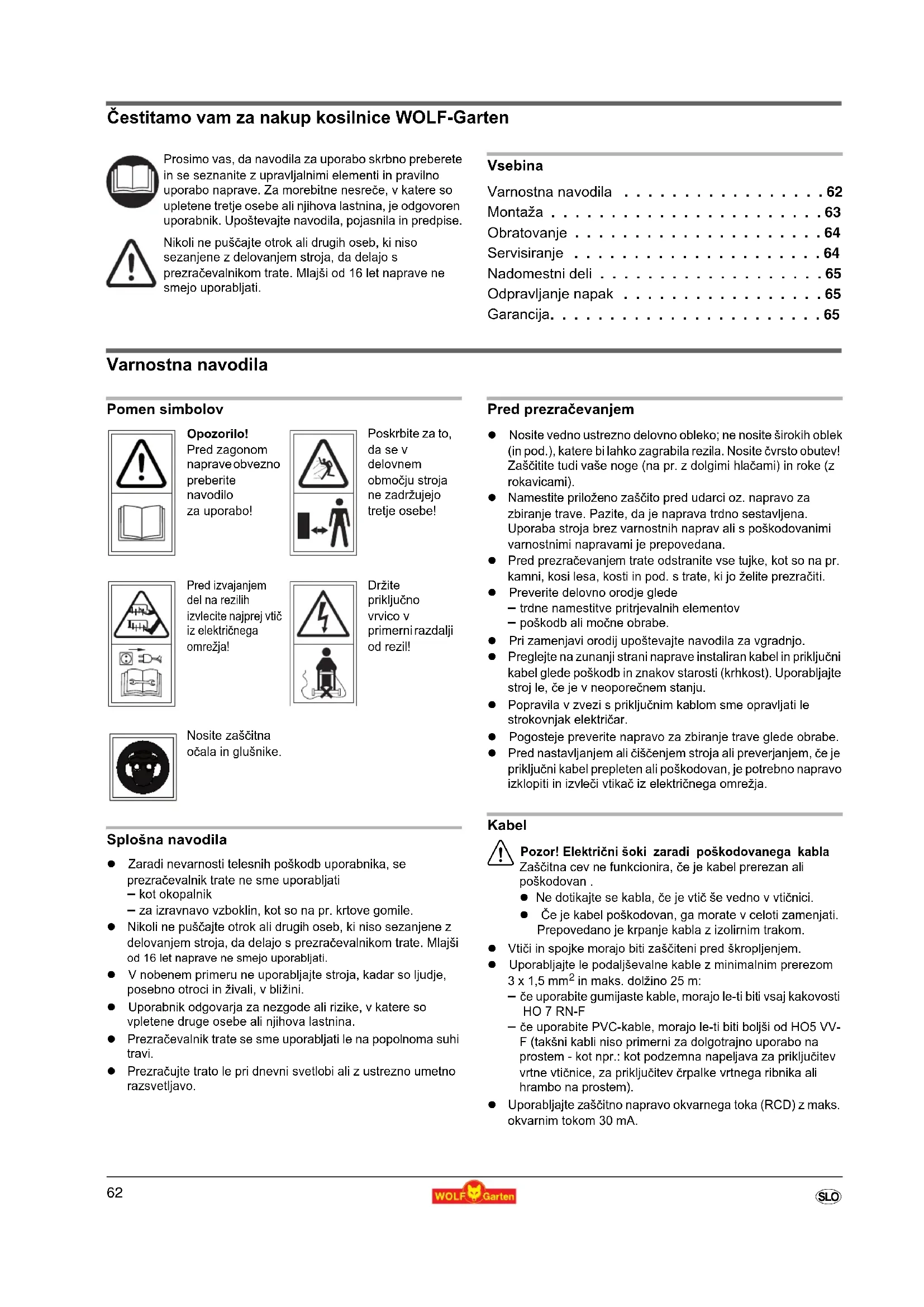 in maks. dolžino 25 m: – če uporabite gumijaste kable, morajo le-ti biti vsaj kakovosti HO 7 RN-F – če uporabite PVC-kable, morajo le-ti biti boljši od HO5 VV- F (takšni kabli niso primerni za dolgotrajno uporabo na prostem - kot npr.: kot podzemna napeljava za priključitev vrtne vtičnice, za priključitev črpalke vrtnega ribnika ali hrambo na prostem). Uporabljajte zaščitno napravo okvarnega toka (RCD) z maks. okvarnim tokom 30 mA. Prosimo vas, da navodila za uporabo skrbno preberete in se seznanite z upravljalnimi elementi in pravilno uporabo naprave. Za morebitne nesreče, v katere so upletene tretje osebe ali njihova lastnina, je odgovoren uporabnik. Upoštevajte navodila, pojasnila in predpise. Nikoli ne puščaj te otrok ali drugih oseb, ki niso sezanjene z delovanjem stroja, da delajo s prezračevalnikom trate. Mlajši od 16 let naprave ne smejo uporabljati. Opozorilo! Pred zagonom naprave obvezno preberite navodilo za uporabo! Poskrbite za to, da se v delovnem območju stroja ne zadržujejo tretje osebe! Pred izvajanjem del na rezilih izvlecite najprej vtič iz električnega omrežja! Držite priključno vrvico v primerni razdalji od rezil! Nosite zaščitna očala in glušnike. Izvirno navodilo za obratovanje63