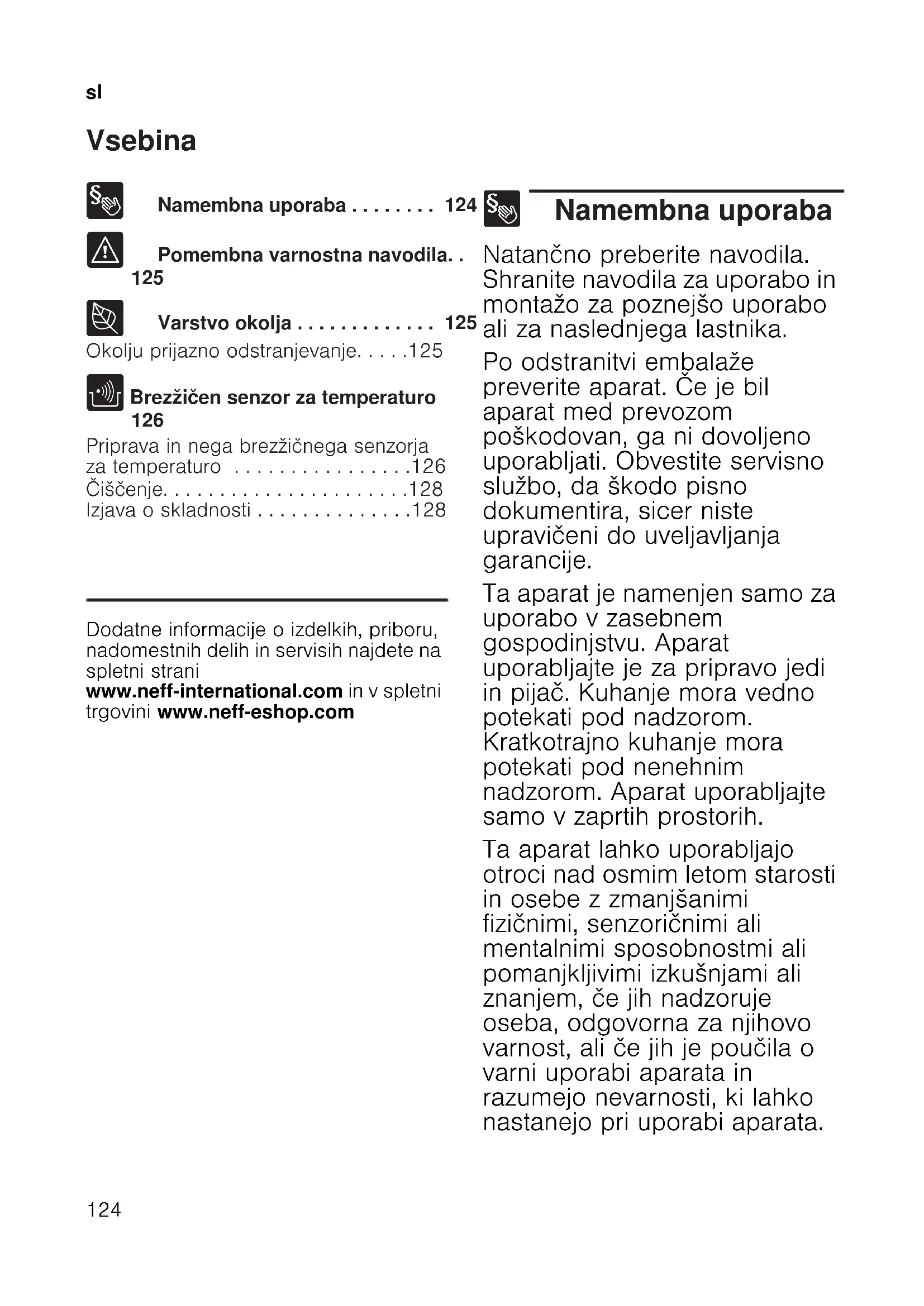 Vsebina slNavodila za uporabo 8 Namembna uporaba . . . . . . . . 124 ( Pomembna varnostna navodila. .