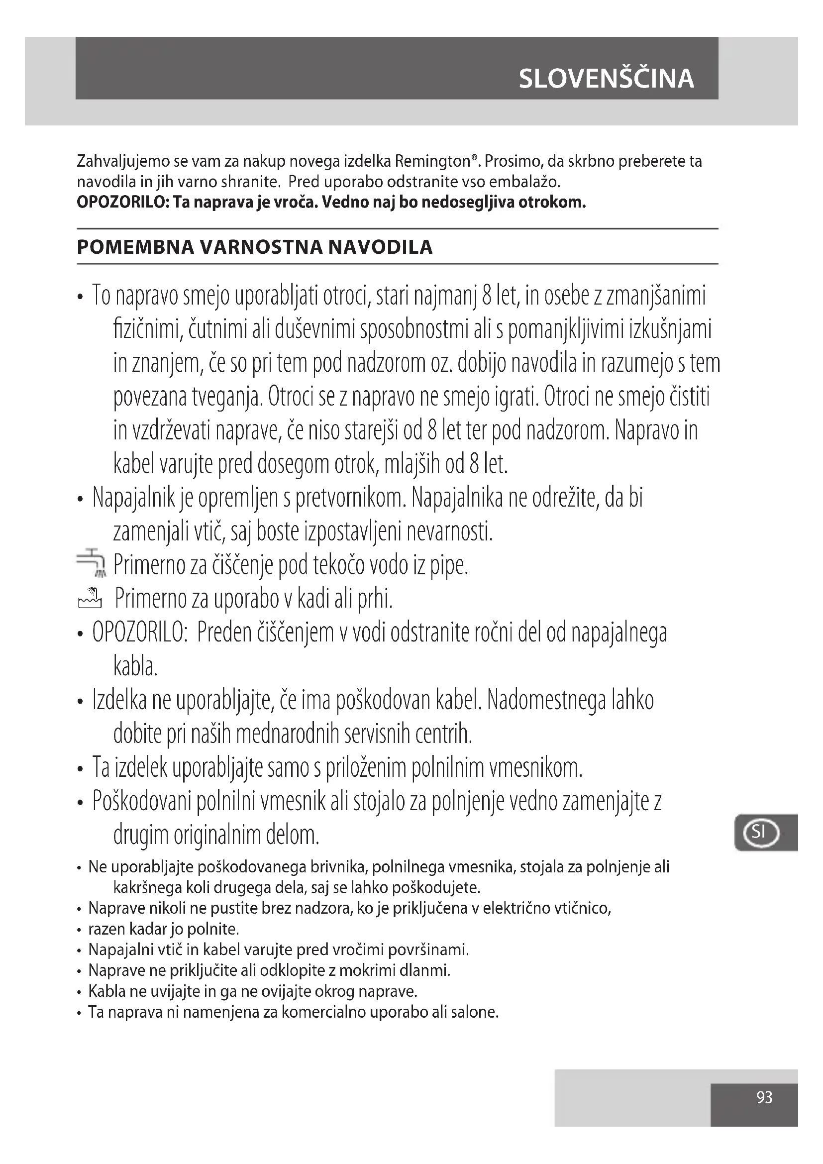 - To napravo smejo uporabljati otroci, stari najmanj 8 let, in osebe z zmanjšanimi fizičnimi, čutnimi ali duševnimi sposobnostmi ali s pomanjkljivimi izkušnjami in znanjem, če so pri tem pod nadzorom oz. dobijo navodila in razumejo s tem povezana tveganja. Otroci se z napravo ne smejo igrati. Otroci ne smejo čistiti in vzdrževati naprave, če niso starejši od 8 let ter pod nadzorom. Napravo in kabel varujte pred dosegom otrok, mlajših od 8 let.
