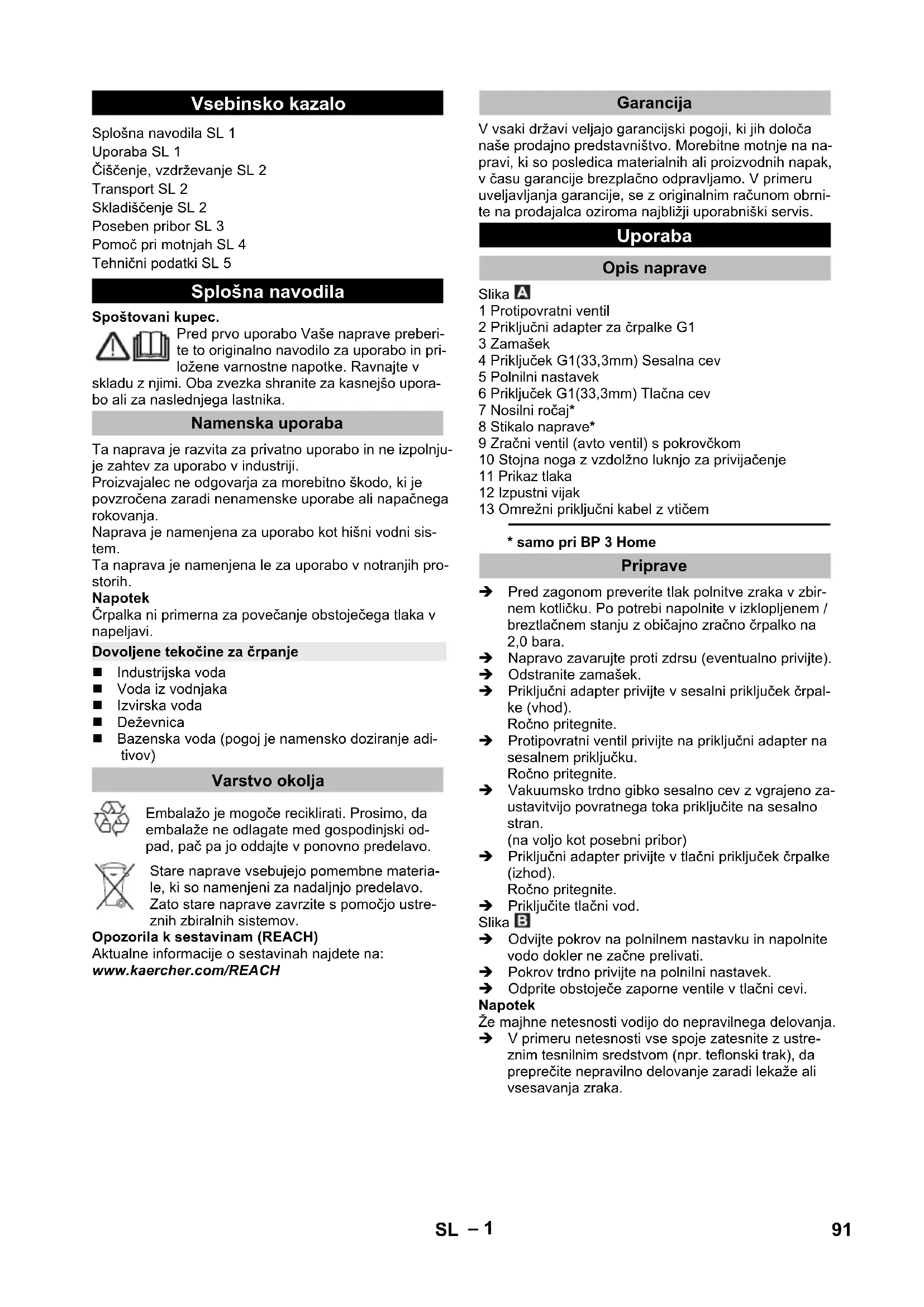 - samo pri BP 3 Home Pred zagonom preverite tlak polnitve zraka v zbir- nem kotličku. Po potrebi napolnite v izklopljenem / breztlačnem stanju z običajno zračno črpalko na 2,0 bara. Napravo zavarujte proti zdrsu (eventualno privijte). Odstranite zamašek. Priključni adapter privijte v sesalni priključek črpal- ke (vhod). Ročno pritegnite. Protipovratni ventil privijte na priključni adapter na sesalnem priključku. Ročno pritegnite. Vakuumsko trdno gibko sesalno cev z vgrajeno za- ustavitvijo povratnega toka priključite na sesalno stran. (na voljo kot posebni pribor) Priključni adapter privijte v tlačni priključek črpalke (izhod). Ročno pritegnite. Priključite tlačni vod. Slika Odvijte pokrov na polnilnem nastavku in napolnite vodo dokler ne začne prelivati. Pokrov trdno privijte na polnilni nastavek. Odprite obstoječe zaporne ventile v tlačni cevi. Napotek Že majhne netesnosti vodijo do nepravilnega delovanja. V primeru netesnosti vse spoje zatesnite z ustre- znim tesnilnim sredstvom (npr. teflonski trak), da preprečite nepravilno delovanje zaradi lekaže ali vsesavanja zraka. Vsebinsko kazalo Splošna navodila SL 1 Uporaba SL 1 Čiščenje, vzdrževanje SL 2 Transport SL 2 Skladiščenje SL 2 Poseben pribor SL 3 Pomoč pri motnjah SL 4 Tehnični podatki SL 5 Splošna navodila Namenska uporaba Dovoljene tekočine za črpanje Varstvo okolja Garancija Uporaba Opis naprave Priprave 91SL– 2 Pri fiksni instalaciji se lahko črpalka privije na ustrezno površino. Stojne noge z utreznimi vijaki privijte na ravno po- vršino. Dodatno se pri fiksni instalaciji priporoča montaža fle- ksibilne komponente na tlačni strani, kot npr fleksibilne gibke cevi za izenačevanje tlaka (glejte posebni pribor). To ima naslednje prednosti: Več fleksibilnosti pri postavljanju in montaži. Zmanjšanje hrupa, ker se na cevi napeljave ne pre- našano nihanja. Pri manjših lekažah se črpalka manj pogosto vklo- pi. Napotek Da bi poenostavili kasnejše praznjenje in tlačno razbre- menitev sistema, priporočamo montažo zaporne pipe med črpalko in tlačno cevjo. (ni v obsegu dobave) Pri praznjenju črpalke se lahko z zaprtjem zaporne pipe prepreči, da bi voda odtekala iz tlačne cevi. BP 3 Home: Omrežni vtič vtaknite v vtičnico. Napravo vklopite na stikalu naprave. BP 5 Home: Omrežni vtič vtaknite v vtičnico. Napotek Črpalka se takoj zažene. Počakajte, dokler črpalka sesa in enakomerno črpa, nato zaprite zaporne ventile v tlač- ni cevi. Po dosegu izklopnega tlaka tlačno stikalo izklopi motor. Zbirni kotliček je sedaj napolnjen, električna čr- palka je pripravljena za obratovanje. Pri manjkajočem dovodu vode se izklopni tlak ne dose- že, tlačno stikalo ne more več izklopiti naprave. Zaradi tega se voda v glavi črpalke segreje. Da se prepreči poškodovanje črpalke zaradi pregreva- nja, v primeru pregretja termo stikalo prekine dovod to- ka. Potem ko se črpalka ohladi, se dovod toka ponovno vzpostavi. Napotek Čas hlajenja do ponovnega zagona motorja lahko zna- ša do 150 min. Za regularno varovanje pred pomanjkanjem vode pripo- ročamo uporabo varovalke suhega teka (glejte posebni pribor). POZOR Sistem je pod pritiskom! (Za tlak glejte poglavje Tehnični podatki) BP 3 Home: Napravo izklopite na stikalu naprave. Omrežni vtič izvlecite iz vtičnice. BP 5 Home: Omrežni vtič izvlecite iz vtičnice. NEVARNOST Pred vsemi čistilnimi in vzdrževalnimi deli izklopite na- pravo in omrežni vtič izvlecite iz vtičnice. Za tlačno razbremenitev odprite in ponovno zaprite pri- ključene zaporne ventile. V sistemu ni tlaka. pri črpanju vode z dodatki, črpalko po vsaki uporabi splaknite s čisto vodo. Tlak polnitve zraka v zbirnem kotličku preverjajte polletno. Po potrebi napolnite v izklopljenem / brez- tlačnem stanju na 2,0 bara (napravo izključite, od- prite vodno pipo). Slika Zračni ventil se nahaja pod pokrovom. Pokrov odvijte v nasprotni smeri urinih kazalcev. 몇 PREVIDNOST Da preprečite nesreče ali poškodbe, pri transportu upo- števajte težo naprave (glejte tehnične podatke). Napravo zavarujte proti zdrsu in prevrnitvi. 몇 PREVIDNOST Da preprečite nesreč e ali poškodbe, pri izbiri kraja shra- njevanja upoštevajte težo naprave (glejte tehnične po- datke). Napravo pred shranjevanjem popolnoma izprazni- te. Črpalko pospravite na mesto, kjer ni zmrzali. Fiksna instalacija Obratovanje Zaključek delovanja Čiščenje, vzdrževanje Nega Vzdrževanje Transport Transport v vozilih Skladiščenje Shranjevanje naprave 92 SL– 3 Poseben pribor Slike v nadaljevanju navedenega posebnega pribora boste našli na strani 4 tega navodila. 6.997-343.0 Predfilter črpalke, majhen (pretok do 4000 l/h) Predfilter črpalke za vse običajne črpalke brez integriranega filtra. Za zaščito črpalke pred grobimi delci umazanije ali peskom. Fini filter je pralen. Za črpalke z G1 (33,3 mm) priključnim navojem. 6.997-344.0 Predfilter črpalke, velik (pre- tok do 6.000 l/h) Predfilter črpalke za vse običajne črpalke brez integriranega filtra. Za zaščito črpalke pred grobimi delci umazanije ali peskom. Fini filter je pralen. Za črpalke z G1 (33,3 mm) priključnim navojem. 6.997-350.0 Sesalna garnitura 3,5 m, 3/4" Komplet vakuumsko odporne spiralne gibke cevi, pripravljene za pri- ključitev, s sesalnim filtrom in povratnim prekinjevalnikom. Uporabljiv tudi kot podaljšek gibke sesalne cevi. Za črpalke z G1 (33,3 mm) pri- ključnim navojem. 6.997-349.0 Sesalna garnitura 7,0 m, 3/4" 6.997-348.0 Gibka sesalna cev 3,5 m, 3/4" Komplet vakuumsko odporne spiralne gibke cevi, pripravljene za pri- ključitev, za direktno priključitev na črpalke. Za podaljševanje sesal- ne garniture ali za uporabo s sesalnimi filtri. Za črpalke z G1 (33,3 mm) priključnim navojem. 6.997-359.0 Priključni kos črpalke G1 (33,3mm) vklj. Protipovratni ventil Vakuumsko odporen priključek gibkih cevi na črpalko. Za črpalke z G1 (33,3 mm) priključnim navojem in 3/4" ter 1" gibkimi cevmi, 