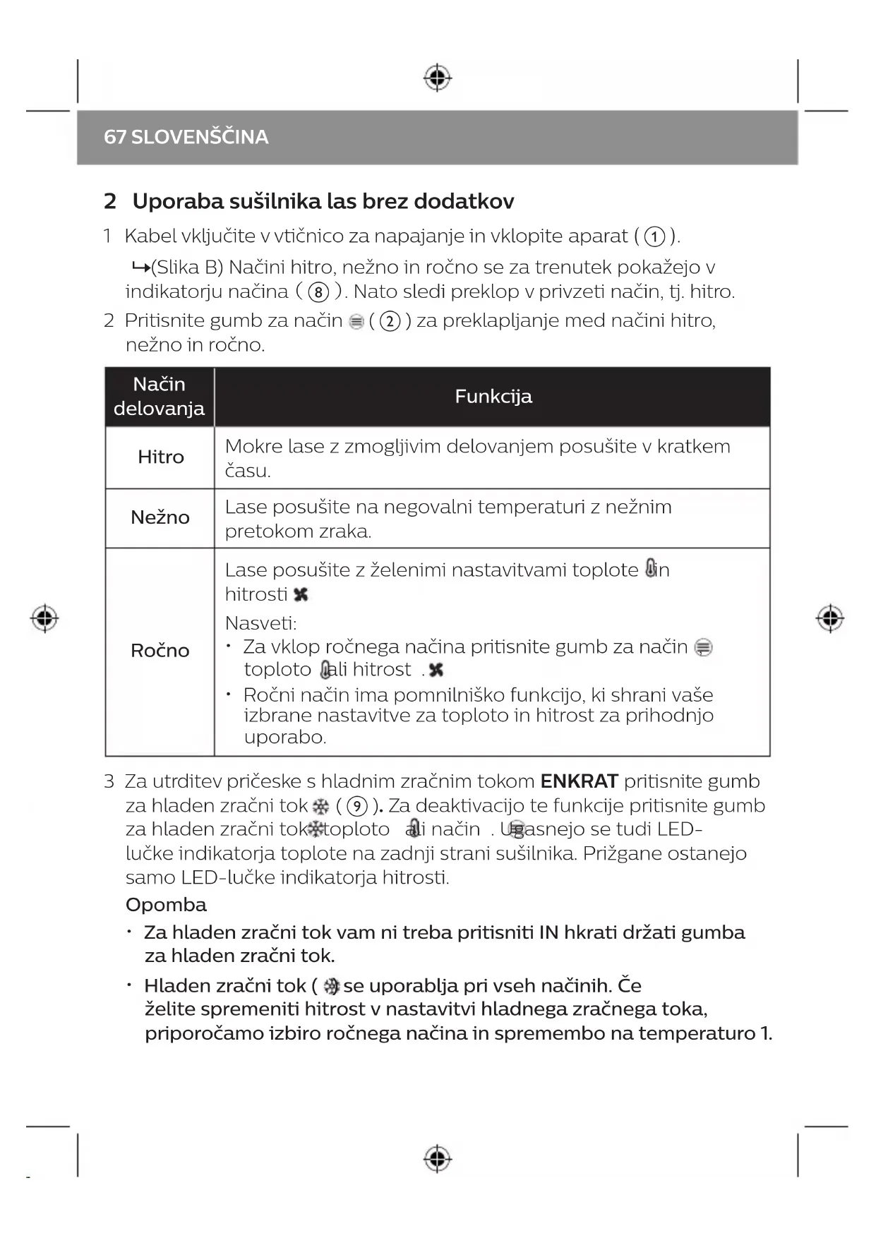 66SLOVENŠČINA2 Uporaba sušilnika las brez dodatkov 1 Kabel vključite v vtičnico za napajanje in vklopite aparat (a). »(Slika B) Načini hitro, nežno in ročno se za trenutek pokažejo v indikatorju načina (h). Nato sledi preklop v privzeti način, tj. hitro. 2 Pritisnite gumb za način ( b ) za preklapljanje med načini hitro, nežno in ročno. Način delovanja Funkcija Hitro Mokre lase z zmogljivim delovanjem posušite v kratkem času. Nežno Lase posušite na negovalni temperaturi z nežnim pretokom zraka. Ročno Lase posušite z želenimi nastavitvami toplote in hitrosti . Nasveti: