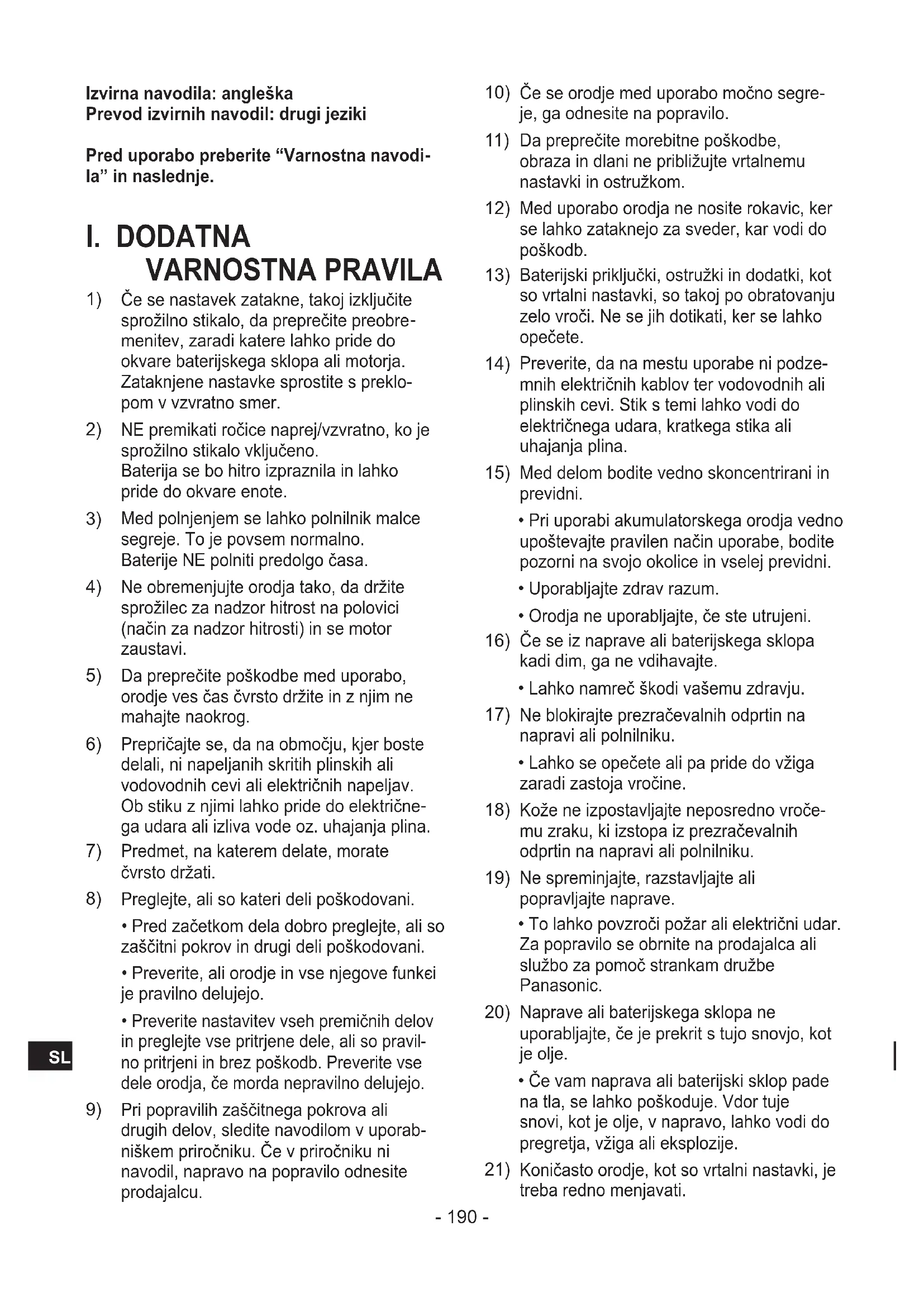 - Ne uporabljajte drugih baterijskih sklopov razen Panasonicovih, ki so zasnovani za uporabo s tem polnilnim orodjem.