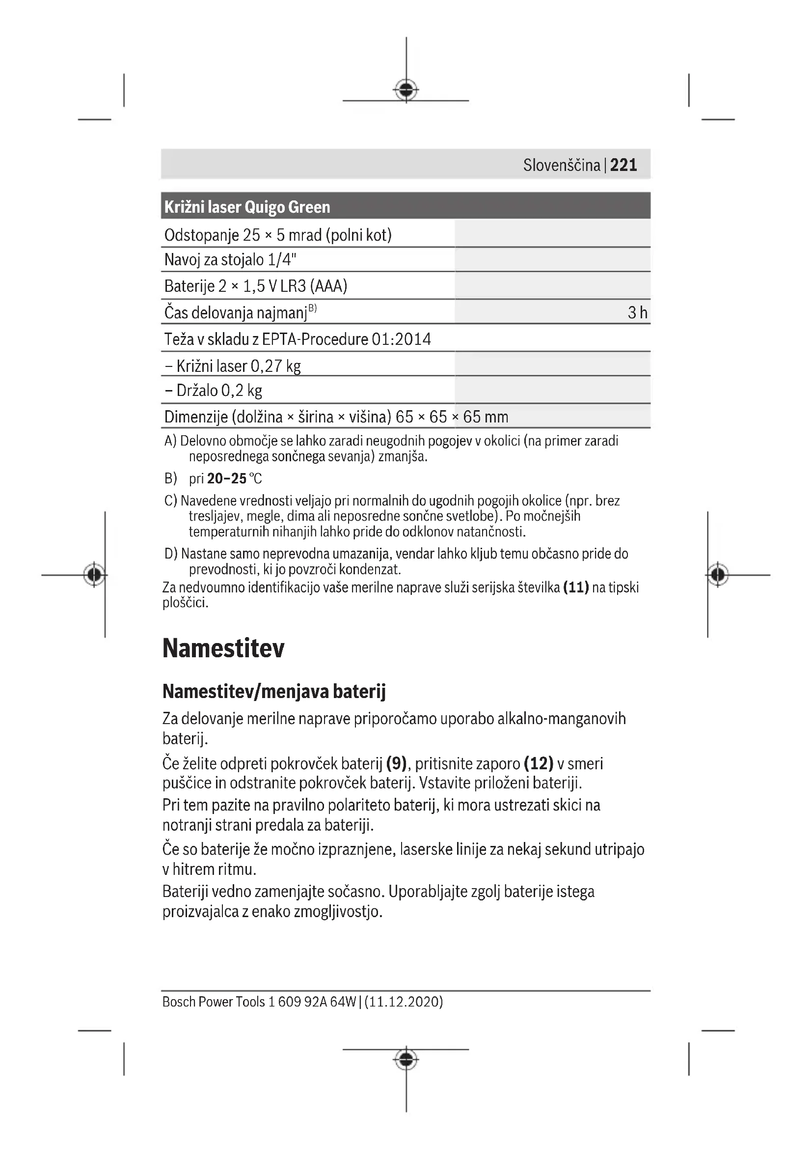 Teža v skladu z EPTA-Procedure01:2014 – Križni laser 0,27kg – Držalo 0,2kg Dimenzije (dolžina × širina × višina) 65×65×65mm A) Delovno območje se lahko zaradi neugodnih pogojev v okolici (na primer zaradi neposrednega sončnega sevanja) zmanjša.