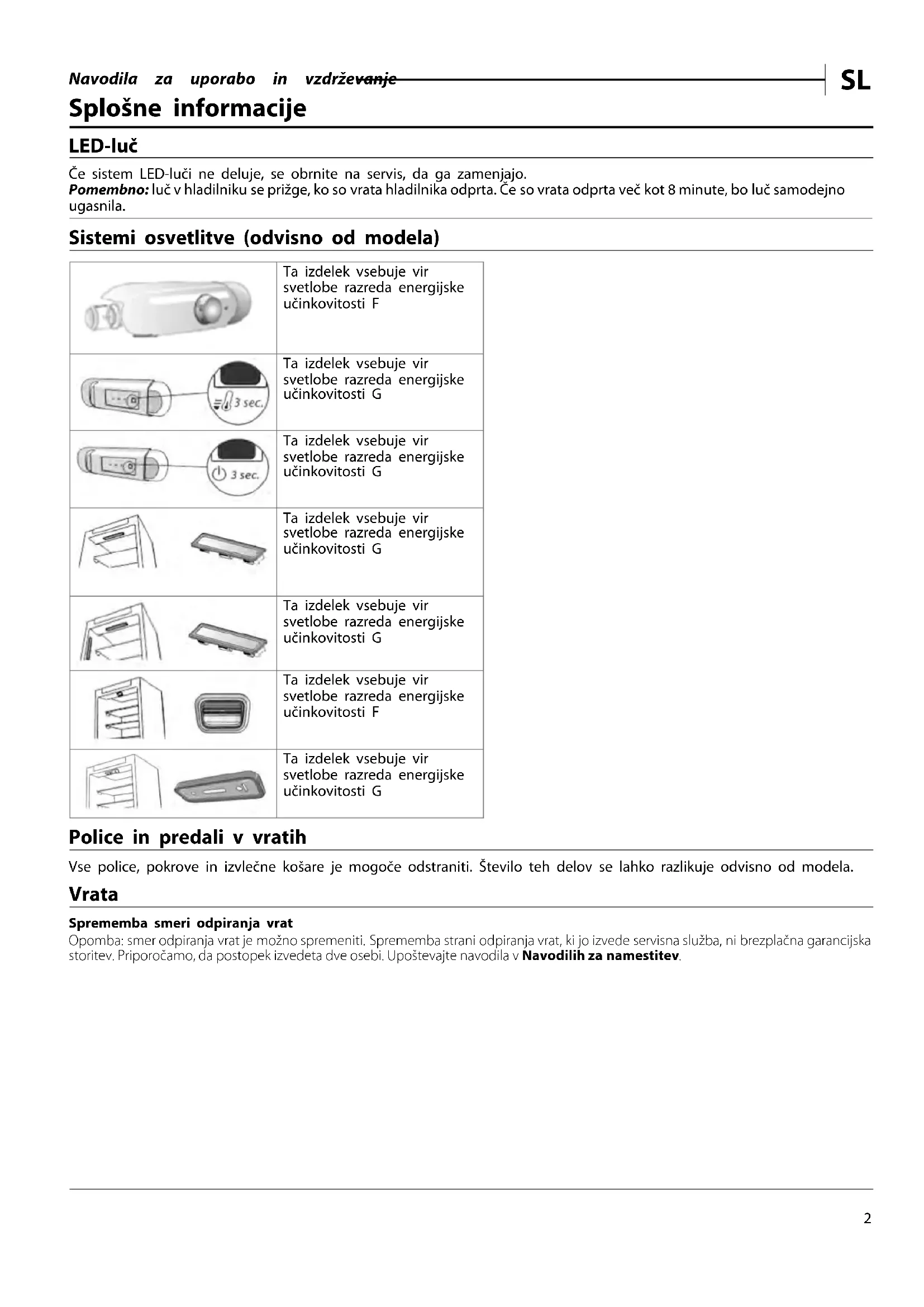 Splošne informacije LED-luč Če sistem LED-luči ne deluje, se obrnite na servis, da ga zamenjajo. Pomembno: luč v hladilniku se prižge, ko so vrata hladilnika odprta. Če so vrata odprta več kot 8 minute, bo luč samodejno ugasnila. Sistemi osvetlitve (odvisno od modela) Ta izdelek vsebuje vir svetlobe razreda energijske učinkovitosti F Ta izdelek vsebuje vir svetlobe razreda energijske učinkovitosti G Ta izdelek vsebuje vir svetlobe razreda energijske učinkovitosti G Ta izdelek vsebuje vir svetlobe razreda energijske učinkovitosti G Ta izdelek vsebuje vir svetlobe razreda energijske učinkovitosti G Ta izdelek vsebuje vir svetlobe razreda energijske učinkovitosti F Ta izdelek vsebuje vir svetlobe razreda energijske učinkovitosti G Police in predali v vratih Vse police, pokrove in izvlečne košare je mogoče odstraniti. Število teh delov se lahko razlikuje odvisno od modela. Vrata Sprememba smeri odpiranja vrat Opomba: smer odpiranja vrat je možno spremeniti. Sprememba strani odpiranja vrat, ki jo izvede servisna služba, ni brezplačna garancijska storitev. Priporočamo, da postopek izvedeta dve osebi. Upoštevajte navodila v Navodilih za namestitev.Navodila za uporabo in vzdrževanje