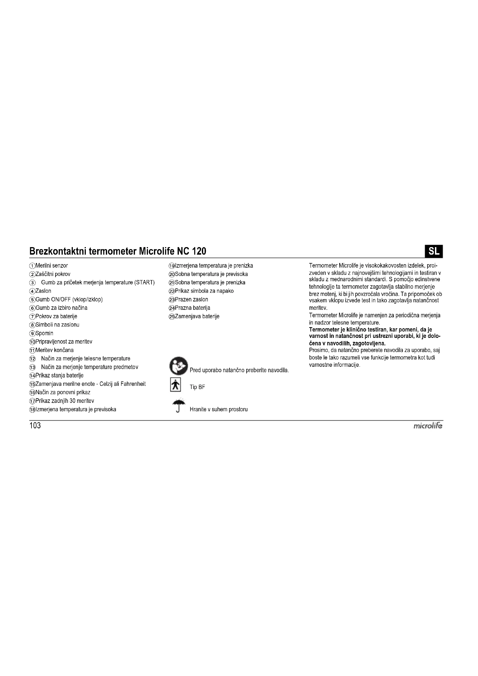 sistem ne deluje pravilno. Prazen zaslon BM: preverite, če je baterija pravilno nameščena. Prav tako preverite polarnost baterije (<+> in <->). Prazna baterija BN: če je na zaslonu prikazan samo simbol za baterijo, potem je treba baterijo nemudoma zamenjati. 10.Čiščenje in razkuževanje Pri čiščenju ohišja in senzorja za merjenje uporabljajte alkoholno palčko ali bombažno krpo, navlaženo z alko- holom (70 % izopropil). Pazite, da tekočina ne vstopi v notranjost termometra. Ne uporabljajte abrazivnih čistilnih sredstev, razredčil ali benzola, prav tako ne potapljajte naprave v vodo ali druge čistilne tekočine. Pazite, da ne opraskate površine merilne leče in zaslona. 11.Zamenjava prazne baterije Za ta termometer potrebujete litijevo baterijo tipa CR2032. Ko se na zaslonu prikaže utripajoč simbol za baterijo BN, baterijo zamenjajte z novo CR2032. Odstranite pokrov za baterije BO tako, da ga potisnete v prikazani smeri. Odstranite pokrov in vstavite novo baterijo, pol + mora biti na vrhu. Baterije in elektronske instrumente je potrebno odstranjevati v skladu z lokalnimi predpisi, saj ne spadajo med gospodinjske odpadke. 12.Garancija Za to napravo velja 2-letna garancija od dneva nakupa. Garancija velja le na podlagi predložitve garancijske kartice, ki jo izpolni prodajalec (glej zadnjo stran) in potrdi datum nakupa ali na podlagi računa. Garancija velja za napravo, vendar ne za baterijo in embalažo. Garancija ne velja, če napravo odprete ali jo kakorkoli spreminjate. Garancija ne velja za škodo, ki nastane zaradi neustre- znega ravnanja, uporabe prazne baterije, nezgod ali neupoštevanja navodil za uporabo. Prosimo, da kontaktirate Microlife servisno službo.108NC 120 SL 13.Tehnične specifikacije Naprava ustreza zahtevam Direktive za medicinske pripo- močke 93/42/EEC. Pridržujemo si pravico do tehničnih sprememb. Za profesionalne uporabnike naprave je v skladu z Zakonom o uporabi medicinskih izdelkov priporočljiv pregled naprave vsaki dve leti. Upoštevati je potrebno ustrezna pravila, ki veljajo za odstranjevanje naprave. 14.www.microlife.com Več informacij o naših termometrih in merilnikih krvnega tlaka kot tudi ostalih storitvah si lahko ogledate na spletni strani www.microlife.com. Tip: Brezkontaktni termometer NC 120 Razpon merjenja: Način za merjenje telesne temperature: 34,0-42,2 °C / 93,2-108,0 °F Način za merjenje temperature predmetov: 0-100,0 °C / 32-212,0 °F Resolucija: 0,1 °C / °F Natančnost merjenja: laboratorij: 0,2 °C, 36,0 39,0 °C 0,4 °F, 96,8 102,2 °F Zaslon: Zaslon LCD s tekočimi kristali, 4-mestno s posebnimi simboli Zvočni učinki: Naprava je vklopljena (ON) in pripravljena za merjenje: 1 kratek pisk. Meritev je opravljena: 1 daljši pisk (1 s), če je rezultat nižji od 37,5 °C / 99,5 °F, 10 krajših piskov, če je rezultat enak ali višji od 37,5 °C / 99,5 °F. Napaka ali nepravilno delovanje: 3 kratki piski. Spomin: Samodejen prikaz zadnje izmerjene tempe- rature 30 prikazov rezultatov v načinu spomina Osvetlitev: Ko je naprava vklopljena, je zaslon 4 sekunde osvetljen ZELENO. Ko je meritev opravljena in je vrednost temperature manjša od 37,5 °C / 99,5 °F, je zaslon 5 sekund osvetljen ZELENO. Ko je meritev zaključena in je vrednost temperature višja od 37,5 °C / 99,5 °F, je zaslon 5 sekund osvetljen RDEČE. Delovni pogoji: Način za merjenje telesne temperature: 16-40,0 °C / 60,8-104,0 °F Način za merjenje temperature predmetov: 5-40,0 °C / 41-104,0 °F Shranje- vanje: -20- +50°C / -4- +122°F 15-95 % najvišja relativna vlažnost Samodejen izklop: Približno 1 minuto po zadnji opravljeni meritvi. Baterija: 1 x CR2032 baterija 3V Dimenzije: 120 x 28 x 21 mm Življenjska doba bate- rije: pribl. 2000 meritev (z novo baterijo) Teža: 39 g (z baterijo), 36 g (brez baterije) Razred IP: IP21 Referenčni standard: ASTM E1965; IEC 60601-1; IEC 60601-1-2 (EMC); IEC 60601-1-11 Servisna življenjska doba: 5 let ali 12000 meritev
