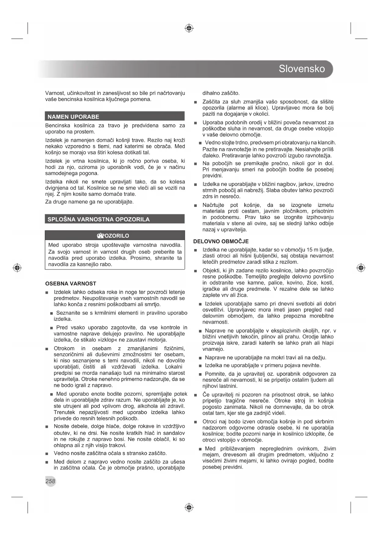 OPOZORILO Med uporabo stroja upoštevajte varnostna navodila. Za svojo varnost in varnost drugih oseb preberite ta navodila pred uporabo izdelka. Prosimo, shranite ta navodila za kasnejšo rabo. OSEBNA VARNOST ■ Izdelek lahko odseka roke in noge ter povzroči letenje predmetov. Neupoštevanje vseh varnostnih navodil se lahko konča z resnimi poškodbami ali smrtjo. ■ Seznanite se s krmilnimi elementi in pravilno uporabo izdelka. ■ Pred vsako uporabo zagotovite, da vse kontrole in varnostne naprave delujejo pravilno. Ne uporabljajte izdelka, če stikalo »izklop« ne zaustavi motorja. ■ Otrokom in osebam z zmanjšanimi fizičnimi, senzoričnimi ali duševnimi zmožnostmi ter osebam, ki niso seznanjene s temi navodili, nikoli ne dovolite uporabljati, čistiti ali vzdrževati izdelka. Lokalni predpisi se morda nanašajo tudi na minimalno starost upravitelja. Otroke nenehno primerno nadzorujte, da se ne bodo igrali z napravo. ■ Med uporabo enote bodite pozorni, spremljajte potek dela in uporabljajte zdrav razum. Ne uporabljajte je, ko ste utrujeni ali pod vplivom drog, alkohola ali zdravil. Trenutek nepazljivosti med uporabo izdelka lahko privede do resnih telesnih poškodb. ■ Nosite debele, dolge hlače, dolge rokave in vzdržljivo obutev, ki ne drsi. Ne nosite kratkih hlač in sandalov in ne rokujte z napravo bosi. Ne nosite oblačil, ki so ohlapna ali z njih visijo trakovi. ■ Vedno nosite zaščitna očala s stransko zaščito. ■ Med delom z napravo vedno nosite zaščito za ušesa in zaščitna očala. Če je območje prašno, uporabljajte dihalno zaščito. ■ Zaščita za sluh zmanjša vašo sposobnost, da slišite opozorila (alarme ali klice). Upravljavec mora še bolj paziti na dogajanje v okolici. ■ Uporaba podobnih orodij v bližini poveča nevarnost za poškodbe sluha in nevarnost, da druge osebe vstopijo v vaše delovno območje. ■ Vedno stojte trdno, predvsem pri obratovanju na klancih. Pazite na ravnotežje in ne pretiravajte. Nesiahajte príliš ďaleko. Pretiravanje lahko povzroči izgubo ravnotežja. ■ Na pobočjih se premikajte prečno, nikoli gor in dol. Pri menjavanju smeri na pobočjih bodite še posebej previdni. ■ Izdelka ne uporabljajte v bližini nagibov, jarkov, izredno strmih pobočij ali nabrežij. Slaba obutev lahko povzroči zdrs in nesrečo. ■ Načrtujte pot košnje, da se izognete izmetu materiala proti cestam, javnim pločnikom, prisotnim in podobnemu. Prav tako se izognite izpihovanju materiala v stene ali ovire, saj se slednji lahko odbije nazaj v upravitelja.
