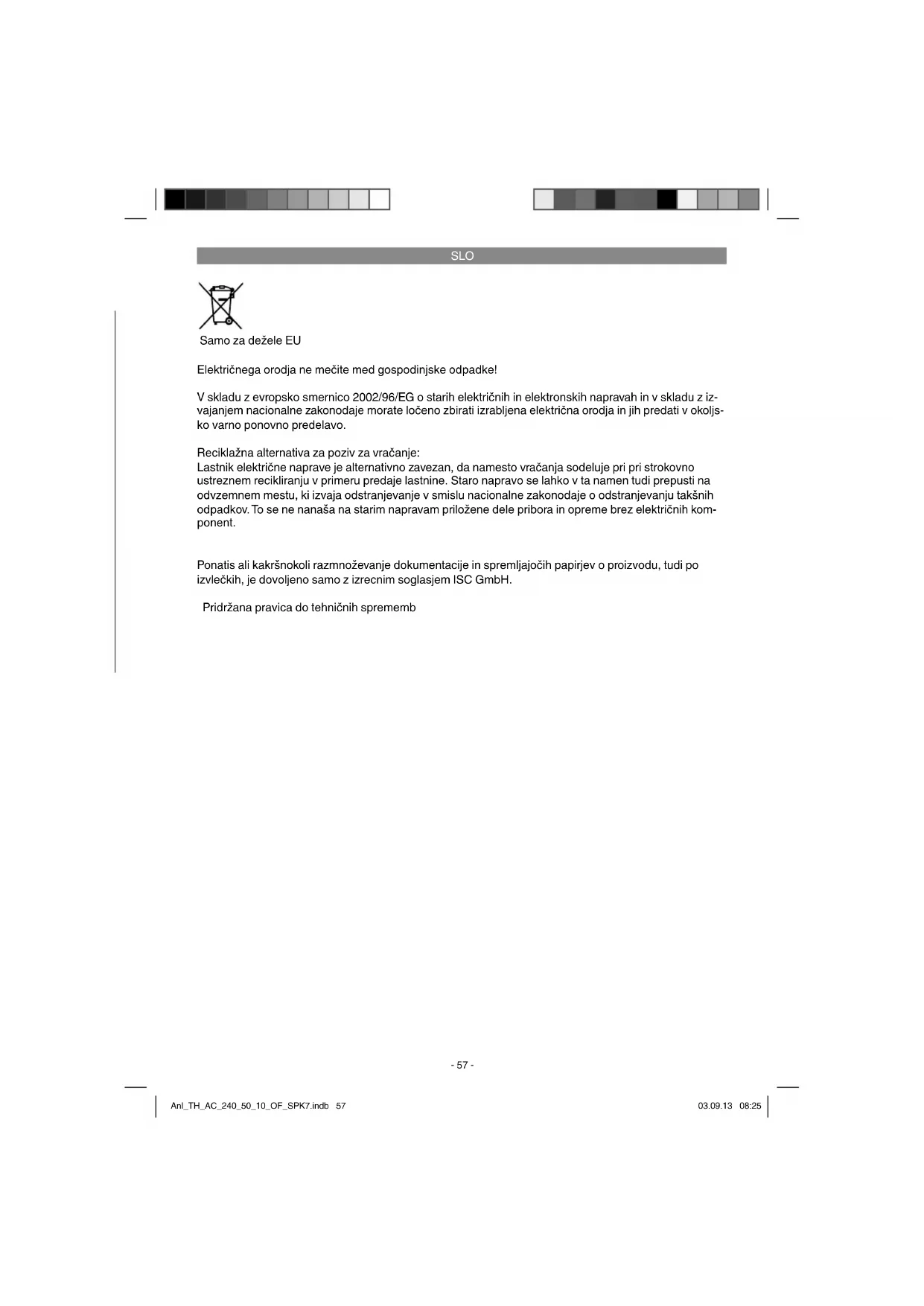 Samo za dežele EU Električnega orodja ne mečite med gospodinjske odpadke! V skladu z evropsko smernico 2002/96/EG o starih električnih in elektronskih napravah in v skladu z iz- vajanjem nacionalne zakonodaje morate ločeno zbirati izrabljena električna orodja in jih predati v okoljs- ko varno ponovno predelavo. Reciklažna alternativa za poziv za vračanje: Lastnik električne naprave je alternativno zavezan, da namesto vračanja sodeluje pri pri strokovno ustreznem recikliranju v primeru predaje lastnine. Staro napravo se lahko v ta namen tudi prepusti na odvzemnem mestu, ki izvaja odstranjevanje v smislu nacionalne zakonodaje o odstranjevanju takšnih odpadkov. To se ne nanaša na starim napravam priložene dele pribora in opreme brez električnih kom- ponent. Ponatis ali kakršnokoli razmnoževanje dokumentacije in spremljajočih papirjev o proizvodu, tudi po izvlečkih, je dovoljeno samo z izrecnim soglasjem ISC GmbH. Pridržana pravica do tehničnih sprememb Anl_TH_AC_240_50_10_OF_SPK7.indb 57Anl_TH_AC_240_50_10_OF_SPK7.indb 57 03.09.13 08:2503.09.13 08:25SLO