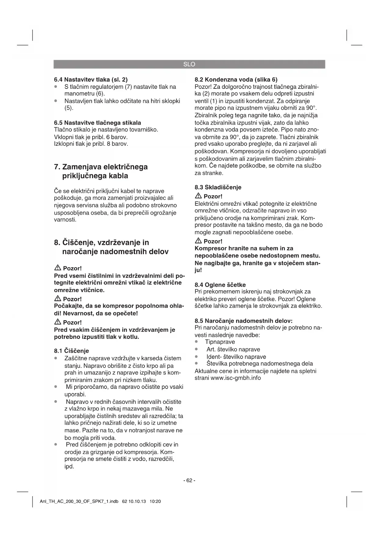 Samo za dežele EU Električnega orodja ne mečite med gospodinjske odpadke! V skladu z evropsko smernico 2002/96/EG o starih električnih in elektronskih napravah in v skladu z iz- vajanjem nacionalne zakonodaje morate ločeno zbirati izrabljena električna orodja in jih predati v okoljs- ko varno ponovno predelavo. Reciklažna alternativa za poziv za vračanje: Lastnik električne naprave je alternativno zavezan, da namesto vračanja sodeluje pri pri strokovno ustreznem recikliranju v primeru predaje lastnine. Staro napravo se lahko v ta namen tudi prepusti na odvzemnem mestu, ki izvaja odstranjevanje v smislu nacionalne zakonodaje o odstranjevanju takšnih odpadkov. To se ne nanaša na starim napravam priložene dele pribora in opreme brez električnih kom- ponent. Ponatis ali kakršnokoli razmnoževanje dokumentacije in spremljajočih papirjev o proizvodu, tudi po izvlečkih, je dovoljeno samo z izrecnim soglasjem ISC GmbH. Pridržana pravica do tehničnih sprememb Anl_TH_AC_200_30_OF_SPK7_1.indb 65 10.10.13 10:20SLO