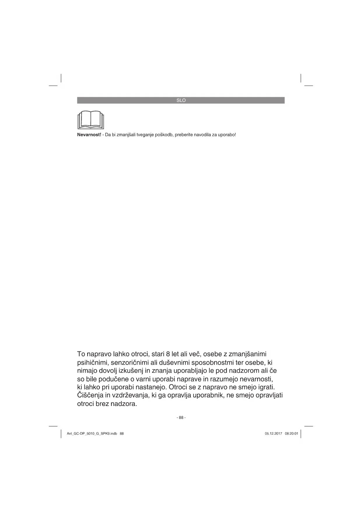 Nevarnost! - Da bi zmanjšali tveganje poškodb, preberite navodila za uporabo! To napravo lahko otroci, stari 8 let ali več, osebe z zmanjšanimi psihičnimi, senzoričnimi ali duševnimi sposobnostmi ter osebe, ki nimajo dovolj izkušenj in znanja uporabljajo le pod nadzorom ali če so bile podučene o varni uporabi naprave in razumejo nevarnosti, ki lahko pri uporabi nastanejo. Otroci se z napravo ne smejo igrati. Čiščenja in vzdrževanja, ki ga opravlja uporabnik, ne smejo opravljati otroci brez nadzora. Anl_GC-DP_5010_G_SPK9.indb 88Anl_GC-DP_5010_G_SPK9.indb 88 05.12.2017 08:20:0105.12.2017 08:20:01SLO