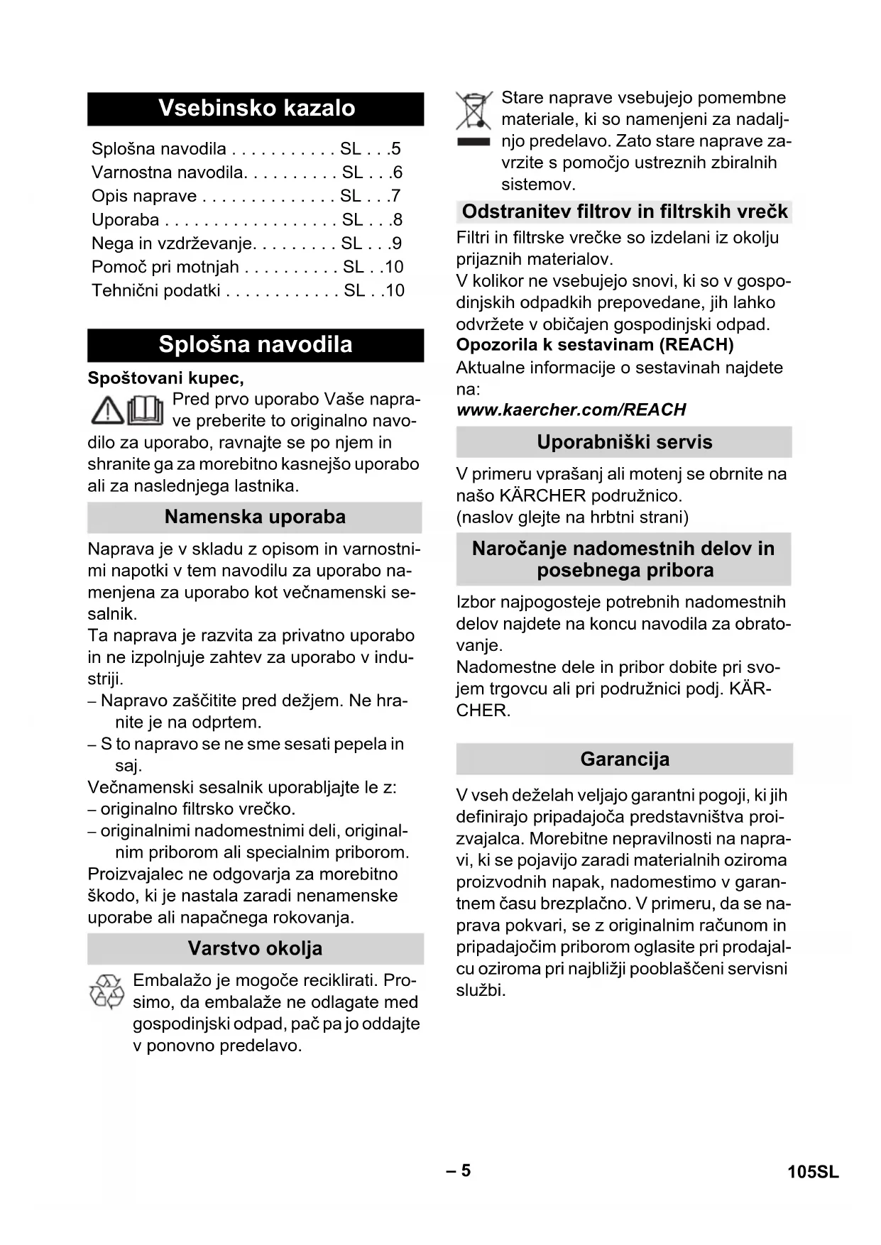 Výkon P jmen 1000 W Síťová pojistka (pomalá) 10 A Objem sběrné nádoby 20 l Nasávání vody pomocí rukojeti 12 l Nasávání vody pomocí podlahové trysky 10 l Sít'ový kabel H05VV-F 2x0,75 Hladina akustického tlaku (EN 60704-2-1) 72 dB(A) Hmotnost (bez příslušen- ství) MV 4 7,0 kg Hmotnost (bez příslušen- ství) MV 4 Premium 7,3 kg 104 CS– 5 Spoštovani kupec, Pred prvo uporabo Vaše napra- ve preberite to originalno navo- dilo za uporabo, ravnajte se po njem in shranite ga za morebitno kasnejšo uporabo ali za naslednjega lastnika. Naprava je v skladu z opisom in varnostni- mi napotki v tem navodilu za uporabo na- menjena za uporabo kot večnamenski se- salnik. Ta naprava je razvita za privatno uporabo in ne izpolnjuje zahtev za uporabo v indu- striji. – Napravo zaščitite pred dežjem. Ne hra- nite je na odprtem. – S to napravo se ne sme sesati pepela in saj. Večnamenski sesalnik uporabljajte le z: – originalno filtrsko vrečko. – originalnimi nadomestnimi deli, original- nim priborom ali specialnim priborom. Proizvajalec ne odgovarja za morebitno škodo, ki je nastala zaradi nenamenske uporabe ali napačnega rokovanja. Embalažo je mogoče reciklirati. Pro- simo, da embalaže ne odlagate med gospodinjski odpad, pač pa jo oddajte v ponovno predelavo. Stare naprave vsebujejo pomembne materiale, ki so namenjeni za nadalj- njo predelavo. Zato stare naprave za- vrzite s pomočjo ustreznih zbiralnih sistemov. Filtri in filtrske vrečke so izdelani iz okolju prijaznih materialov. V kolikor ne vsebujejo snovi, ki so v gospo- dinjskih odpadkih prepovedane, jih lahko odvržete v običajen gospodinjski odpad. Opozorila k sestavinam (REACH) Aktualne informacije o sestavinah najdete na: www.kaercher.com/REACH V primeru vprašanj ali motenj se obrnite na našo KÄRCHER podružnico. (naslov glejte na hrbtni strani) Izbor najpogosteje potrebnih nadomestnih delov najdete na koncu navodila za obrato- vanje. Nadomestne dele in pribor dobite pri svo- jem trgovcu ali pri podružnici podj. KÄR- CHER. V vseh deželah veljajo garantni pogoji, ki jih definirajo pripadajoča predstavništva proi- zvajalca. Morebitne nepravilnosti na napra- vi, ki se pojavijo zaradi materialnih oziroma proizvodnih napak, nadomestimo v garan- tnem času brezplačno. V primeru, da se na- prava pokvari, se z originalnim računom in pripadajočim priborom oglasite pri prodajal- cu oziroma pri najbližji pooblaščeni servisni službi. Vsebinsko kazalo Splošna navodila . . . . . . . . . . . SL . . .5 Varnostna navodila. . . . . . . . . . SL . . .6 Opis naprave . . . . . . . . . . . . . . SL . . .7 Uporaba . . . . . . . . . . . . . . . . . . SL . . .8 Nega in vzdrževanje. . . . . . . . . SL . . .9 Pomoč pri motnjah . . . . . . . . . . SL . .10 Tehnični podatki . . . . . . . . . . . . SL . .10 Splošna navodila Namenska uporaba Varstvo okolja Odstranitev filtrov in filtrskih vrečk Uporabniški servis Naročanje nadomestnih delov in posebnega pribora Garancija 105SL– 6 – Ta naprava ni namenjena uporabi oseb z omejenimi fi- zičnimi, senzoričnimi ali du- ševnimi sposobnostmi ali po- manjkljivimi izkušnjami in/ali pomanjkljivim znanjem, razen če jih nadzoruje oseba, pri- stojna za njihovo varnost, ali so od nje prejeli navodila, kako napravo uporabljati, ter so razumeli nevarnosti, ki iz tega izhajajo. – Otroci smejo napravo upora- bljati le, če so stari nad 8 let in jih nadzoruje oseba, pristojna za njihovo varnost, ali so od nje prejeli navodila, kako na- pravo uporabljati, ter so razu- meli nevarnosti, ki iz tega iz- hajajo. – Otroci se z napravo ne smejo igrati. – Nadzorujte otroke, da zagoto- vite, da se z napravo ne igra- jo. – Čiščenja in uporabniškega vzdrževanja otroci ne smejo izvajati brez nadzora. – Embalažne folije hranite proč od otrok, obstaja nevarnost zadušitve! – Napravo izklopite po vsaki uporabi ter pred vsakim či- ščenjem/vzdrževanjem. – Nevarnost požara. Ne sesajte gorečih ali tlilnih predmetov. – Prepovedano je obratovanje v področjih, kjer obstaja ne- varnost eksplozij. 몇 Električni priključek Stroj priključujte samo na izme- nični tok. Napetost se mora uje- mati s tipsko ploščico stroja. Nevarnost električnega udara Omrežnega vtiča in vtičnice ni- koli ne prijemajte z mokrimi ro- kami. Omrežnega vtiča ne vlecite iz vtičnice z vlečenjem priključne- ga kabla. Pred vsako uporabo preverite ali na priključnem kablu z omre- žnim vitčem obstajajo poškod- be. Poškodovani priključni kabel takoj dajte na zamenjavo poo- blaščeni servisni službi/elektri- čarju. Za izogibanje električnim nesre- čam priporočamo, da uporablja- te vtičnice s predvklopljenim za- ščitnim stikalom (maks. 30 mA nazivne jakosti sprožilnega to- ka). Opozorilo Določene snovi lahko pri vrtinče- nju s sesalnim zrakom tvorijo ek- splozivne pare ali mešanice! Sledečih snovi nikoli ne vsesa- vajte: – eksplozivne ali vnetljive pline, tekočine in prah (reaktivni prah) – reaktivni kovinski prah (npr. aluminij, magnezij, cink) v po- vezavi z močno alkalnimi in kislimi čistilnimi sredstvi – nerazredčene močne kisline in lug Varnostna navodila 106 SL– 7 – organska topila (npr. bencin, barvno razredčilo, aceton, ku- rilno olje). Te snovi lahko dodatno uničujejo materiale uporabljene na stroju. Nevarnost Za neposredno grozečo nevar- nost, ki vodi do težkih telesnih poškodb ali smrti. 몇 Opozorilo Za možno nevarno situacijo, ki bi lahko vodila do težkih telesnih poškodb ali smrti. Pozor Za možno nevarno situacijo, ki lahko vodi do lahkih poškodb ali materialne škode. Slike glejte na razklopni stra- ni! To navodilo za uporabo opisuje večna- menski sesalnik, naveden na spre- dnjem ovitku. Slike kažejo maksimalno opremljenost, glede na model obstajajo razlike v opre- mi in priloženem priboru. Pri razpakiranju preverite ali v vsebini pake- ta manjka pribor oz. ali obstajajo poškodbe. V primeru transportnih poškodb obvestite