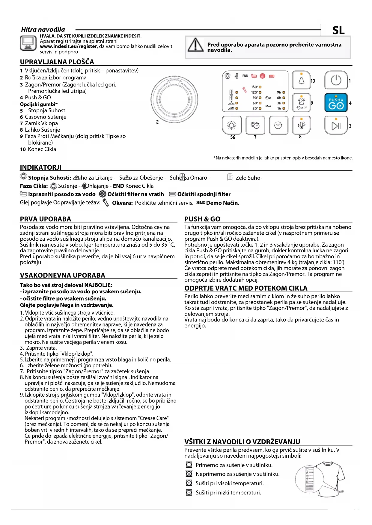 Filtri so bistveni deli sušilnega postopka. Na njih se zbirajo dlačice, ki nastajajo med sušenjem. Če se ltri zamašijo, je pretok zraka v stroju onemogočen, čas sušenja se podaljša, poraba energije se poveča, sušilnik pa se lahko poškoduje. Če teh postopkov ne izvedete pravilno, zagon sušilnika ni vedno mogoč.HVALA, DA STE KUPILI IZDELEK ZNAMKE INDESIT. Aparat registrirajte na spletni strani www.indesit.eu/register, da vam bomo lahko nudili celovit servis in podporo Pravila uporabe, standardna dokumentacija, naročanje nadomestnih delov in dodatne informacije o izdelkih so na voljo: