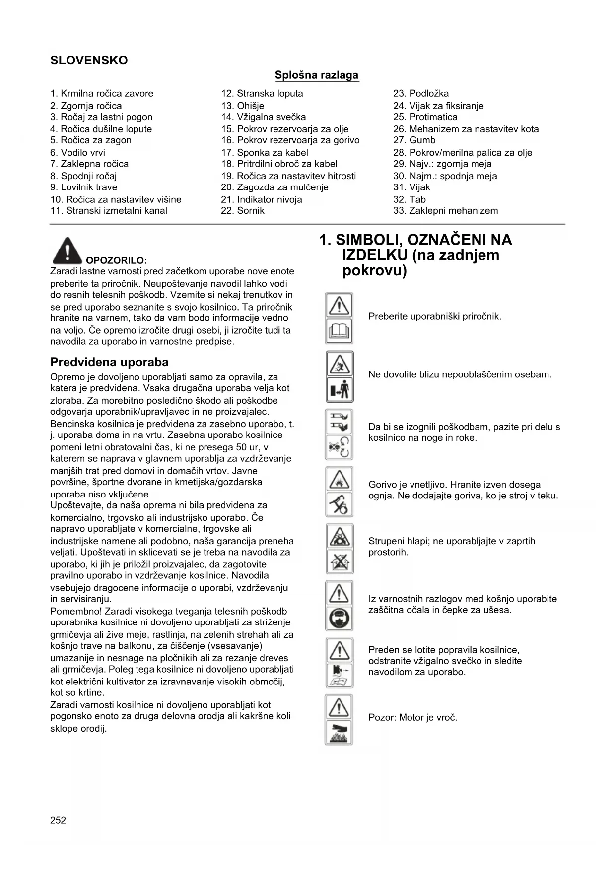 Preberite uporabniški priročnik. Ne dovolite blizu nepooblaščenim osebam. Da bi se izognili poškodbam, pazite pri delu s kosilnico na noge in roke. Gorivo je vnetljivo. Hranite izven dosega ognja. Ne dodajajte goriva, ko je stroj v teku. Strupeni hlapi; ne uporabljajte v zaprtih prostorih. Iz varnostnih razlogov med košnjo uporabite zaščitna očala in čepke za ušesa. Preden se lotite popravila kosilnice, odstranite vžigalno svečko in sledite navodilom za uporabo. Pozor: Motor je vroč.253