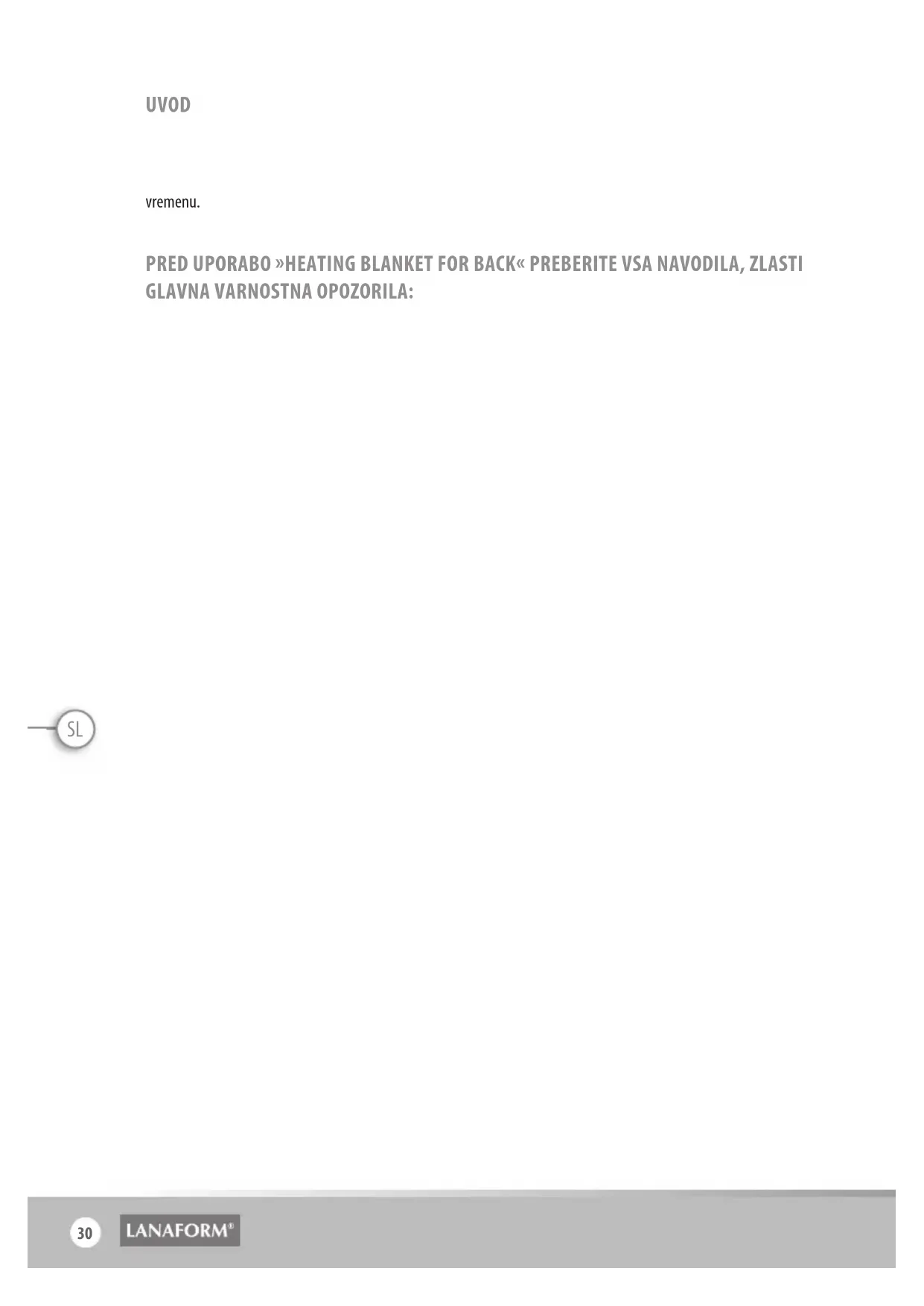 Heating Blanket for BackSL UVOD Hvala, ker ste izbrali grelni jopič »Heating Blanket for Back« podjetja LANAFORM®. Grelni jopič »Heating Blanket for Back« podjetja LANAFORM® je prestal stroge preizkuse po veljavnih evropskih standardih. Poleg tega omogoča postopen nadzor temperature, zato se lahko z njim ogrejete pozimi ali v vlažnem vremenu. PRED UPORABO »HEATING BLANKET FOR BACK« PREBERITE VSA NAVODILA, ZLASTI GLAVNA VARNOSTNA OPOZORILA: Da bi preprečili opekline, smrt zaradi električnega udara, požar ali poškodbe: