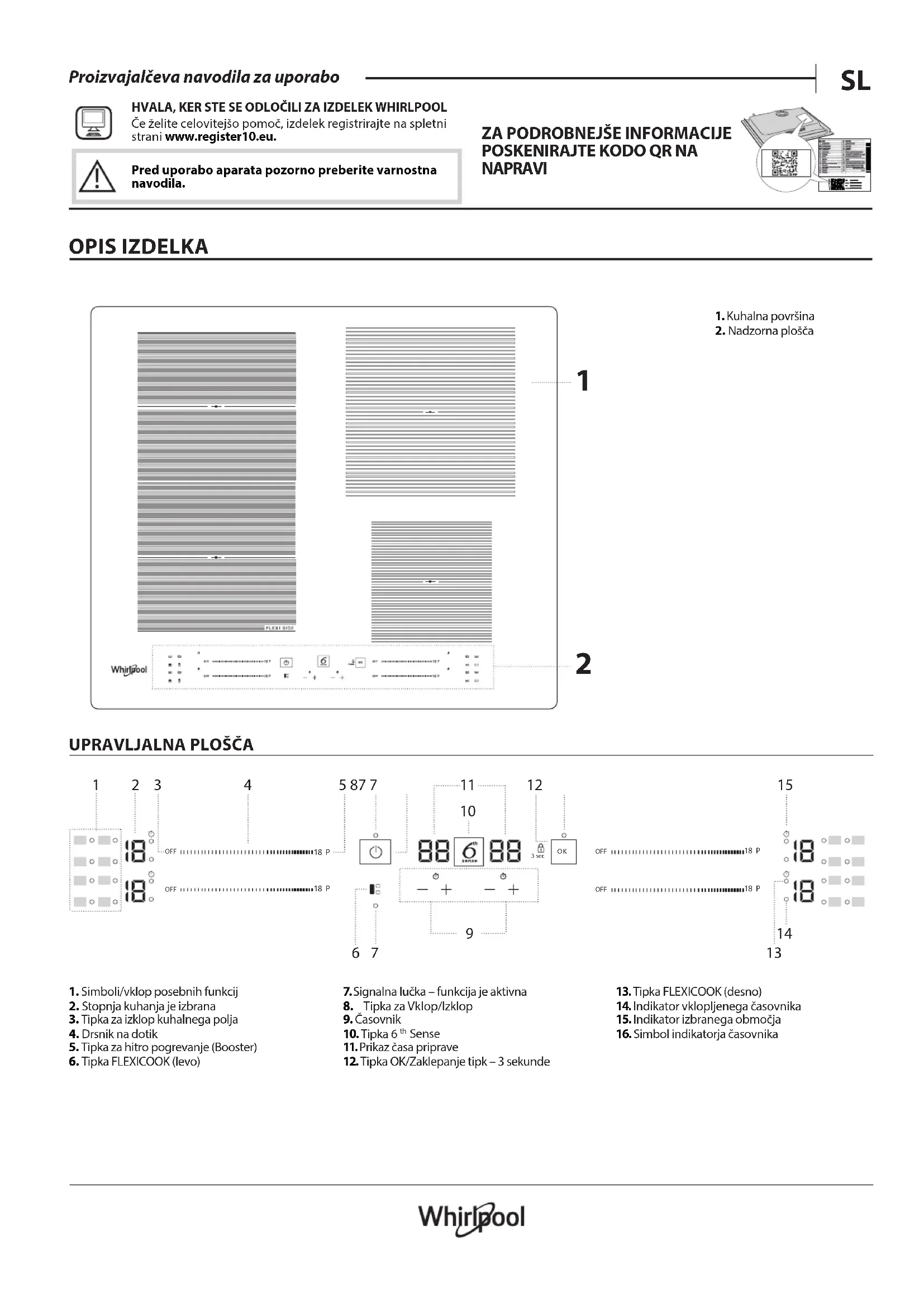 - Prípadne sa obráťte na náš popredajný servis (Telefónne číslo nájdete vzáručnej knižke). Pri kontaktovaní nášho servisu uveďte, prosím, kódy, ktoré nájdete na identikačnom štítku vášho výrobku. ®/TM/ © 2025 Whirlpool. Vyrobené na základe licencie.Pred uporabo aparata preberite ta varnostna navodila. Navodila hranite na dosegu roke za prihodnjo uporabo. V navodilih za uporabo in na aparatu so pomembna varnostna navodila, ki jih mora uporabnik prebrati in vedno upoštevati. Proizvajalec ne prevzema odgovornosti v primeru neupoštevanja varnostnih navodil, nepravilne uporabe aparata ali napačne nastavitve upravljalnih elementov. OPOZORILO: Če na površini kuhalne plošče opazite razpoko, aparata ne uporabljajte, saj obstaja nevarnost električnega udara. OPOZORILO: Nevarnost požara: ne hranite predmetov na kuhalni površini. POZOR: Postopek kuhanja je treba nadzorovati. Postopek kratkotrajnega kuhanja je treba nenehno nadzorovati. OPOZORILO: Nenadzorovano kuhanje na kuhalni plošči z mastjo ali oljem je lahko nevarno, saj obstaja možnost požara. NIKOLI ne skušajte pogasiti ognja z vodo: aparat izključite in nato pokrijte plamen npr. s pokrovom ali požarno odejo. Kuhalne plošče ne uporabljajte kot delovni pult ali podlago. Pazite, da aparat ne pride v stik s krpami ali drugimi vnetljivimi predmeti, dokler se vse komponente povsem ne ohladijo, saj lahko pride do požara. Kovinskih predmetov, na primer nožev, vilic, žlic in pokrovov, ne odlagajte na površino kuhalnika, saj se lahko segrejejo. Zelo majhni otroci (0–3let) naj se ne približujejo aparatu. Majhni otroci (3–8let) ne smejo biti v bližini aparata brez stalnega nadzora. Otroci, stari 8 let ali več, in osebe z omejenimi telesnimi, čutnimi ali razumskimi sposobnostmi oz. osebe, ki nimajo izkušenj in znanja, lahko aparat uporabljajo le, če so pod nadzorom oz. če so bili poučeni o varni uporabi aparata in se zavedajo morebitnih nevarnosti. Otroci se z aparatom ne smejo igrati. Otroci brez nadzora ne smejo čistiti ali vzdrževati aparata. Kuhališče na kuhalni plošči po uporabi izklopite z upravljalnim elementom in se ne zanašajte na detektor posod. OPOZORILO: Aparat in dostopni deli se med uporabo segrejejo. Pazite, da se ne dotaknete grelnih elementov. Otroci, mlajši od 8let, se ne smejo zadrževati v bližini aparata, če niso pod stalnim nadzorom. Živila ne smejo ostati v ali na izdelku več kot eno uro pred ali po kuhanju. DOVOLJENA UPORABA POZOR: aparat ni namenjen temu, da bi ga upravljali z zunanjimi upravljalnimi napravami, kot sta časovnik ali ločen daljinski upravljalnik. Aparat je namenjen uporabi v gospodinjstvu in temu podobnim načinom uporabe, na primer: v kuhinjah za osebje v trgovinah, pisarnah in drugih delovnih okoljih, na kmetijah, za goste v hotelih, motelih in prebivalce drugih stanovanjskih okolij. Druga uporaba ni dovoljena (npr. za segrevanje prostorov). Aparat ni namenjen profesionalni uporabi. Aparata ne uporabljajte na prostem. OPOZORILO: Indukcijska kuhalna plošča lahko proizvaja zvočni signal, ko nekaj pustite na upravljalni plošči. Kuhalno ploščo izklopite z gumbom za VKLOP/IZKLOP. NAMESTITEV Za premikanje in namestitev aparata sta potrebni najmanj dve osebi, saj obstaja nevarnost poškodb. Za odstranjevanje embalaže in namestitev aparata uporabite zaščitne rokavice, saj obstaja nevarnost ureznin. Namestitev, vključno s priklopom vode (če je prisotna) in elektrike, mora izvesti usposobljen tehnik. Ne popravljajte ali zamenjujte delov aparata, razen če to ni izrecno navedeno v navodilih za uporabo. Otroci se mestu namestitve ne smejo približevati. Ko aparat odstranite iz embalaže, se prepričajte, da se med prevozom ni poškodoval. V primeru težav se obrnite na prodajalca ali na najbližjo servisno službo. Ko je aparat nameščen, embalažo (plastika, deli iz stiropora itd.) shranite izven dosega otrok, saj obstaja nevarnost zadušitve. Preden aparat namestite, ga zaradi nevarnosti električnega udara odklopite z električnega omrežja. Med namestitvijo pazite, da aparat ne poškoduje napajalnega kabla, saj to lahko privede do požara ali povzroči električni udar. Aparat vključite šele, ko je namestitev končana. Vse potrebne izreze v element izvedite pred vgradnjo aparata in odstranite vse lesene trske in žagovino. Če aparat ni vgrajen nad pečico, je treba v predelek pod aparatom vgraditi ločevalno ploščo (ni priložena).