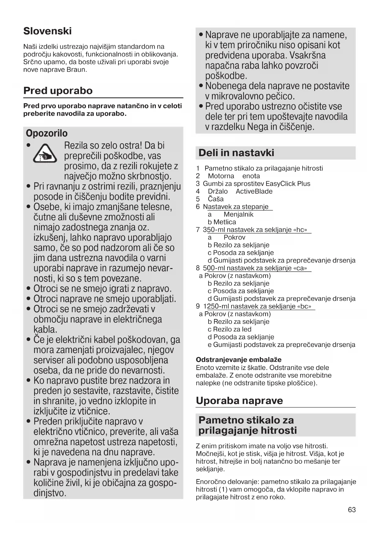Pred uporabo ustrezno očistite vse dele ter pri tem upoštevajte navodila v razdelku Nega in čiščenje. Deli in nastavki 1 Pametno stikalo za prilagajanje hitrosti 2 Motorna enota 3 Gumbi za sprostitev EasyClick Plus 4 Držalo ActiveBlade 5 Čaša 6 Nastavek za stepanje a Menjalnik b Metlica 7 350-ml nastavek za sekljanje «hc» a Pokrov b Rezilo za sekljanje c Posoda za sekljanje d Gumijasti podstavek za preprečevanje drsenja 8 500-ml nastavek za sekljanje «ca» a Pokrov (z nastavkom) b Rezilo za sekljanje c Posoda za sekljanje d Gumijasti podstavek za preprečevanje drsenja 9 1250-ml nastavek za sekljanje «bc» a Pokrov (z nastavkom) b Rezilo za sekljanje c Rezilo za led d Posoda za sekljanje e Gumijasti podstavek za preprečevanje drsenja Odstranjevanje embalaže Enoto vzemite iz škatle. Odstranite vse dele embalaže. Z enote odstranite vse morebitne nalepke (ne odstranite tipske ploščice). Uporaba naprave Pametno stikalo za prilagajanje hitrosti Z enim pritiskom imate na voljo vse hitrosti. Močnejši, kot je stisk, višja je hitrost. Višja, kot je hitrost, hitrejše in bolj natančno bo mešanje ter sekljanje. Enoročno delovanje: pametno stikalo za prilagajanje hitrosti (1) vam omogoča, da vklopite napravo in prilagajate hitrost z eno roko. 5722113444_01_MQ 7000x_7045x_INT_S6-96.indd 635722113444_01_MQ 7000x_7045x_INT_S6-96.indd 63 04.07.19 13:5404.07.19 13:5464 Držalo ActiveBlade (A) Ročni mešalnik vključuje držalo ActiveBlade, ki rezilu omogoča, da se razteza vse do dna držala. Prilagoditev se izvede samodejno tako, da prilagaja tlak opravilom za mešanje. To je posebej priročno za mešanje trdih živil, npr. surovega sadja, in zelenjave. Prav tako je ta postopek primeren tudi za pripravo omak, solatnih prelivov, juh, hrane za dojenčke kot tudi za pijače, smutije in mlečne napitke. Če želite doseči najboljše rezultate, uporabite najvišjo hitrost. Sestava in delovanje