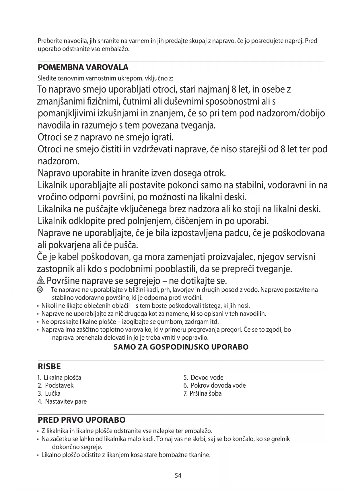 AE54 Preberite navodila, jih shranite na varnem in jih predajte skupaj z napravo, če jo posredujete naprej. Pred uporabo odstranite vso embalažo. POMEMBNA VAROVALA Sledite osnovnim varnostnim ukrepom, vključno z: To napravo smejo uporabljati otroci, stari najmanj 8 let, in osebe z zmanjšanimi zičnimi, čutnimi ali duševnimi sposobnostmi ali s pomanjkljivimi izkušnjami in znanjem, če so pri tem pod nadzorom/dobijo navodila in razumejo s tem povezana tveganja. Otroci se z napravo ne smejo igrati. Otroci ne smejo čistiti in vzdrževati naprave, če niso starejši od 8 let ter pod nadzorom. Napravo uporabite in hranite izven dosega otrok. Likalnik uporabljajte ali postavite pokonci samo na stabilni, vodoravni in na vročino odporni površini, po možnosti na likalni deski. Likalnika ne puščajte vključenega brez nadzora ali ko stoji na likalni deski. Likalnik odklopite pred polnjenjem, čiščenjem in po uporabi. Naprave ne uporabljajte, če je bila izpostavljena padcu, če je poškodovana ali pokvarjena ali če pušča. Če je kabel poškodovan, ga mora zamenjati proizvajalec, njegov servisni zastopnik ali kdo s podobnimi pooblastili, da se prepreči tveganje. h Površine naprave se segrejejo – ne dotikajte se. b Te naprave ne uporabljajte v bližini kadi, prh, lavorjev in drugih posod z vodo. Napravo postavite na stabilno vodoravno površino, ki je odporna proti vročini.