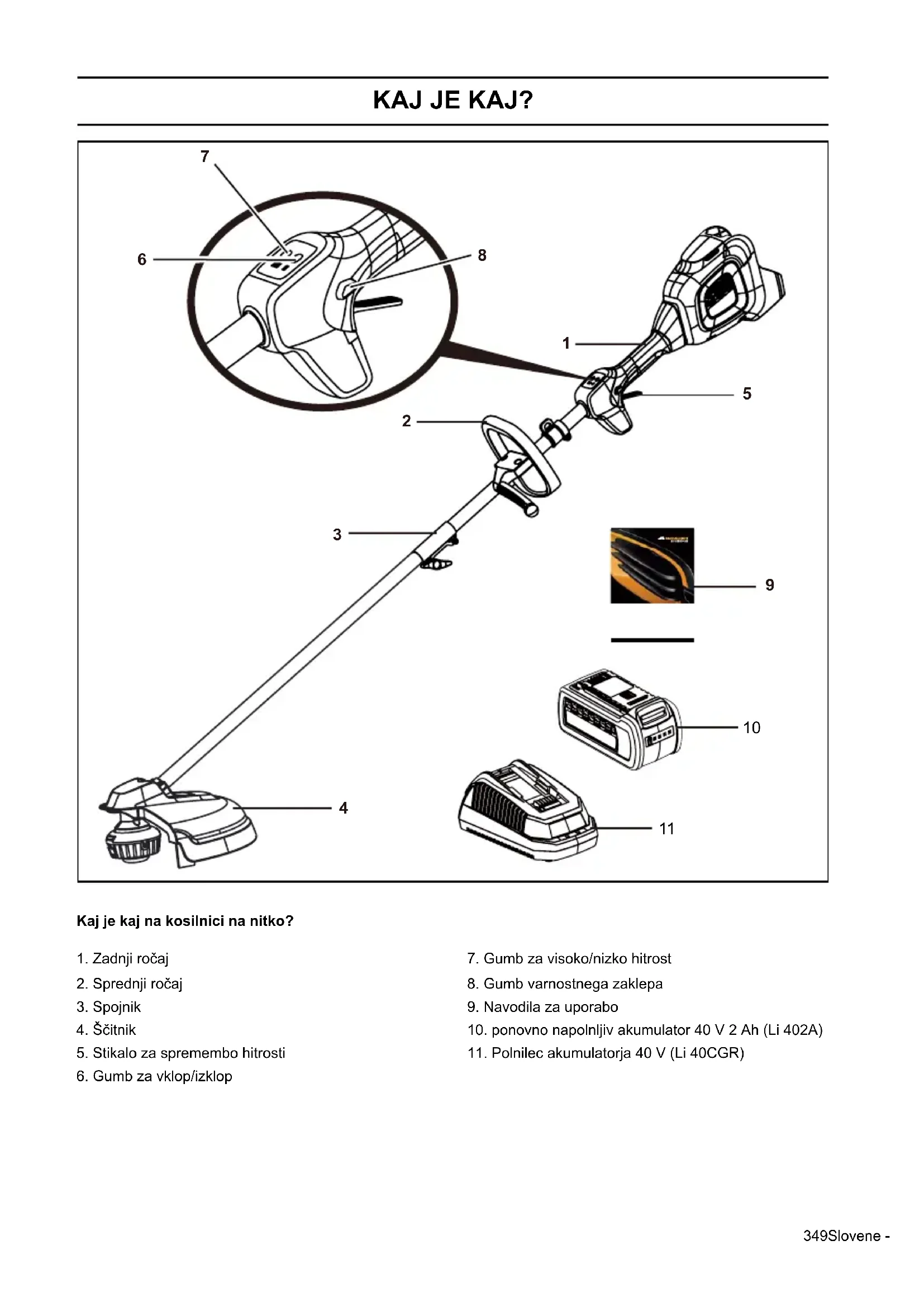 OPOZORILO! Žaga za čiščenje, rezalnik grmovja in trimer so lahko ob napačni uporabi zelo nevarno orodje, ki povzroči resne poškodbe in smrt uporabnika ali tretjih oseb. Zato je zelo pomembno, da natančno preberete in se poglobite v navodila za uporabo. VSEBINA349Slovene - KAJ JE KAJ? Kaj je kaj na kosilnici na nitko?