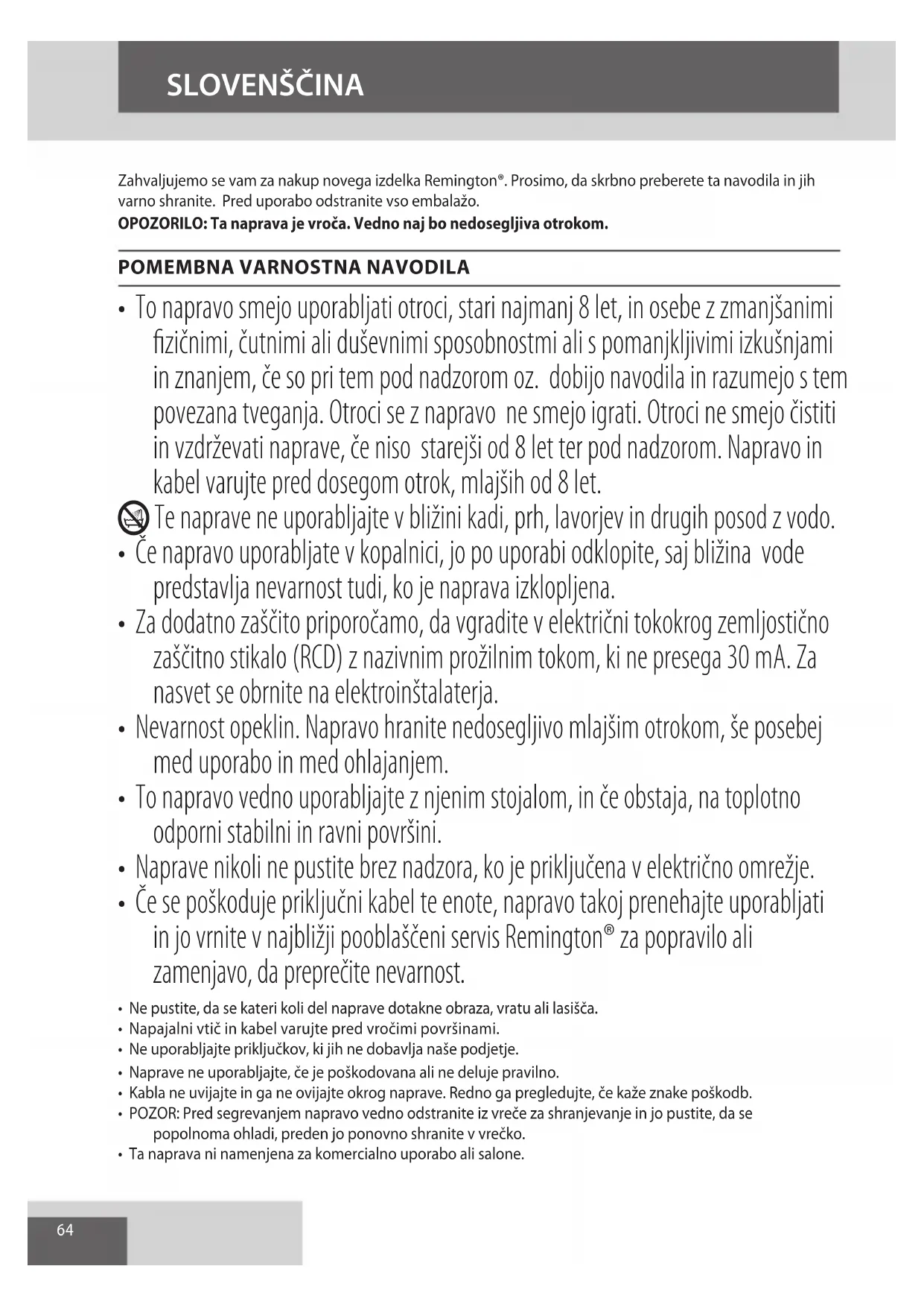 - Če se poškoduje priključni kabel te enote, napravo takoj prenehajte uporabljati in jo vrnite v najbližji pooblaščeni servis Remington® za popravilo ali zamenjavo, da preprečite nevarnost.