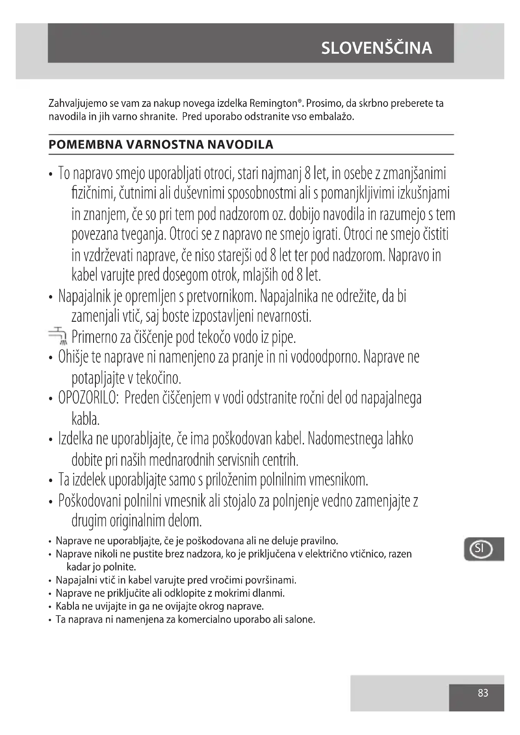 - To napravo smejo uporabljati otroci, stari najmanj 8 let, in osebe z zmanjšanimi fizičnimi, čutnimi ali duševnimi sposobnostmi ali s pomanjkljivimi izkušnjami in znanjem, če so pri tem pod nadzorom oz. dobijo navodila in razumejo s tem povezana tveganja. Otroci se z napravo ne smejo igrati. Otroci ne smejo čistiti in vzdrževati naprave, če niso starejši od 8 let ter pod nadzorom. Napravo in kabel varujte pred dosegom otrok, mlajših od 8 let.