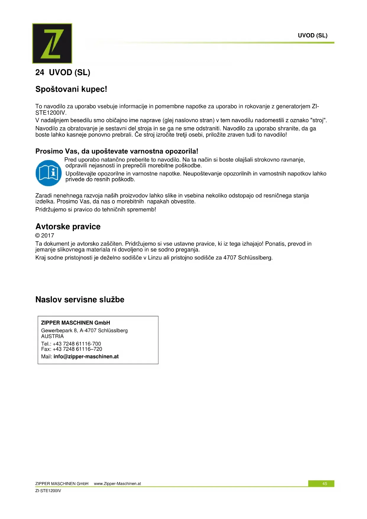 NAPOMENA Ukoliko niste u mogućnosti provesti neophodne popravke, ili nemate dovoljno znanja za provedbu, riješite problem u stručnom i ovlaštenom servisu.UVOD (SL) ZIPPER MASCHINEN GmbH www.Zipper-Maschinen.at 45 ZI-STE1200IV 24 UVOD (SL) Spoštovani kupec! To navodilo za uporabo vsebuje informacije in pomembne napotke za uporabo in rokovanje z generatorjem ZI- STE1200IV. V nadaljnjem besedilu smo običajno ime naprave (glej naslovno stran) v tem navodilu nadomestili z oznako "stroj". Navodilo za obratovanje je sestavni del stroja in se ga ne sme odstraniti. Navodilo za uporabo shranite, da ga boste lahko kasneje ponovno prebrali. Če stroj izročite tretji osebi, priložite zraven tudi to navodilo! Prosimo Vas, da upoštevate varnostna opozorila! Pred uporabo natančno preberite to navodilo. Na ta način si boste olajšali strokovno ravnanje, odpravili nejasnosti in preprečili morebitne poškodbe. Upoštevajte opozorilne in varnostne napotke. Neupoštevanje opozorilnih in varnostnih napotkov lahko privede do resnih poškodb. Zaradi nenehnega razvoja naših proizvodov lahko slike in vsebina nekoliko odstopajo od resničnega stanja izdelka. Prosimo Vas, da nas o morebitnih napakah obvestite. Pridržujemo si pravico do tehničnih sprememb! Avtorske pravice © 2017 Ta dokument je avtorsko zaščiten. Pridržujemo si vse ustavne pravice, ki iz tega izhajajo! Ponatis, prevod in jemanje slikovnega materiala ni dovoljeno in se sodno preganja. Kraj sodne pristojnosti je deželno sodišče v Linzu ali pristojno sodišče za 4707 Schlüsslberg.