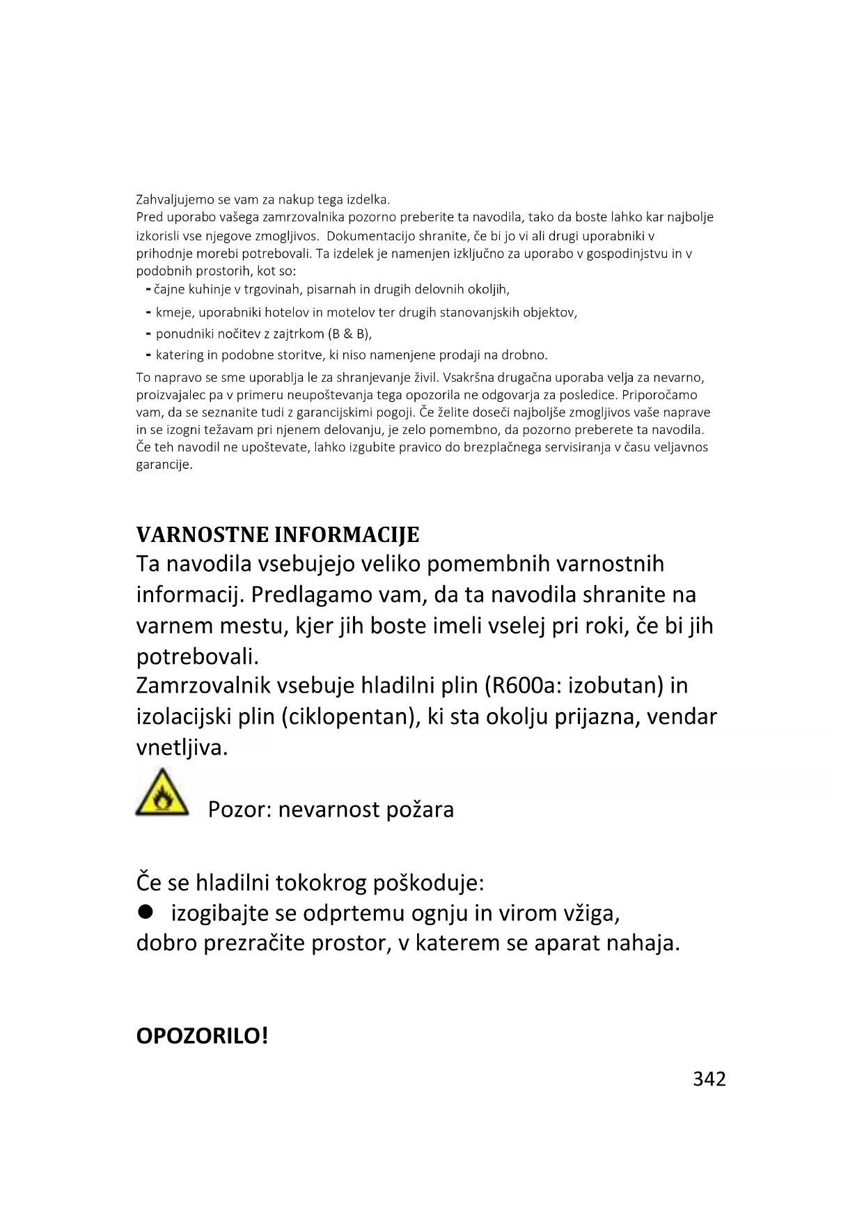 Zahvaljujemo se vam za nakup tega izdelka. Pred uporabo vašega zamrzovalnika pozorno preberite ta navodila, tako da boste lahko kar najbolje izkoristili vse njegove zmogljivosti. Dokumentacijo shranite, če bi jo vi ali drugi uporabniki v prihodnje morebiti potrebovali. Ta izdelek je namenjen izključno za uporabo v gospodinjstvu in v podobnih prostorih, kot so: - čajne kuhinje v trgovinah, pisarnah in drugih delovnih okoljih, - kmetije, uporabniki hotelov in motelov ter drugih stanovanjskih objektov, - ponudniki nočitev z zajtrkom (B & B), - katering in podobne storitve, ki niso namenjene prodaji na drobno. To napravo se sme uporabljati le za shranjevanje živil. Vsakršna drugačna uporaba velja za nevarno, proizvajalec pa v primeru neupoštevanja tega opozorila ne odgovarja za posledice. Priporočamo vam, da se seznanite tudi z garancijskimi pogoji. Če želite doseči najboljše zmogljivosti vaše naprave in se izogniti težavam pri njenem delovanju, je zelo pomembno, da pozorno preberete ta navodila. Če teh navodil ne upoštevate, lahko izgubite pravico do brezplačnega servisiranja v času veljavnosti garancije. VARNOSTNE INFORMACIJE Ta navodila vsebujejo veliko pomembnih varnostnih informacij. Predlagamo vam, da ta navodila shranite na varnem mestu, kjer jih boste imeli vselej pri roki, če bi jih potrebovali. Zamrzovalnik vsebuje hladilni plin (R600a: izobutan) in izolacijski plin (ciklopentan), ki sta okolju prijazna, vendar vnetljiva. Pozor: nevarnost požara Če se hladilni tokokrog poškoduje: izogibajte se odprtemu ognju in virom vžiga, dobro prezračite prostor, v katerem se aparat nahaja. Čas delovanja v odstotkih: OPOZORILO!343 Med čiščenjem/prenašanjem aparata pazite, da se ne dotaknete kovinskih žic kondenzatorja na zadnji strani aparata, saj si pri tem lahko poškodujete prste in roke ali pa povzročite poškodbe izdelka. Ta aparat ni namenjen za zlaganje pod ali na druge aparate. Ne poskušajte se usesti ali stopiti na vrh vašega aparata, saj ni temu namenjen. Pri tem lahko poškodujete sebe ali aparat. Pazite, da med prenašanjem ali prestavljanjem aparata pod njim ne ukleščite priključnega kabla, saj ga s tem lahko odrežete ali poškodujete. Pri nameščanju aparata pazite, da ne poškodujete talnih oblog, cevi, stenskih oblog ipd. Aparata ne prestavljajte tako, da ga vlečete za pokrov ali ročaj. Ne pustite otrokom, da bi se igrali z aparatom ali posegali v njegove nastavitve. Naša družba zavrača vsakršno odgovornost v primeru neupoštevanja navodil. Aparata ne nameščajte na vlažno, mastno ali prašno mesto in ne izpostavljajte ga neposredni sončni svetlobi ali vodi. Aparata ne nameščajte v bližino grelnikov ali vnetljivih materialov. V primeru izpada električne energije ne odpirajte pokrova. Če izpad ne traja dlje kot 20 ur, to ne bi smelo vplivati na zamrznjena živila. Če izpad električne energije traja dlje, živila preverite in jih takoj pojejte ali pa jih skuhajte in nato zamrznite.344 Če pokrov zamrzovalne skrinje težko odprete takoj po tem, ko ste ga pravkar zaprli, ne skrbite. To je posledica razlike v tlaku, ki se izenači in po nekaj minutah omogoči normalno odpiranje pokrova. Aparata ne priključujte na električno napajanje, dokler ne odstranite vseh zaščit, ki so bile potrebne zaradi pakiranja in prevoza. Preden aparat vključite, ga pustite najmanj 4 ure mirovati, da se olje v kompresorju posede, če ste aparat prevažali v vodoravni legi. Zamrzovalnik uporabljajte le za predvidene namene (in sicer za shranjevanje in zamrzovanje užitnih živil). V vinski vitrini ne shranjujte zdravil ali snovi za raziskovalne namene. Če snovi, ki jih shranjujete, zahtevajo strogi nadzor temperature shranjevanja, se lahko pokvarijo ali pa pride do nenadzorovane reakcije, ki je lahko nevarna. Pred kakršnimi koli posegi iztaknite vtič priključnega kabla iz omrežne vtičnice. Ob dostavi se prepričajte, da izdelek ni poškodovan ter da so vsi sestavni deli in dodatki brezhibno ohranjeni. Če opazite puščanje hladilnega sistema, se ne dotikajte stenske vtičnice in ne uporabljajte odprtega ognja. Odprite okno in prezračite prostor. Nato pokličite serviserja zaradi popravila. Ne uporabljajte podaljškov ali adapterjev.345 Priključnega kabla ne vlecite premočno in ne zvijajte ga ter ne dotikajte se vtiča z mokrimi rokami. Pazite, da ne poškodujete vtiča in/ali priključnega kabla, saj to lahko povzroči električni udar ali požar. Ne postavljajte ali shranjujte vnetljivih in zelo hlapnih snovi, kot so eter, bencin, UNP, propan, aerosolni razpršilci, lepila, čisti alkohol ipd. Te snovi lahko povzročijo eksplozijo. Če je električni kabel poškodovan, ga mora zamenjati izdelovalec, tehnik za servis ali podobno kvalificiran tehnik, da se izognete tveganju. V bližini vinske vitrine ne uporabljajte in ne shranjujte vnetljivih razpršil, kot so barve v razpršilu. To lahko povzroči eksplozijo ali požar. Na vrh aparata ne postavljajte predmetov in/ali posod, napolnjenih z vodo. Odsvetuje se uporaba podaljškov in razdelilnih letev. Aparata ne mečite v ogenj. Pazite, da med prevozom in med uporabo ne poškodujete hladilnega tokokroga/cevi aparata. V primeru poškodbe, aparata ne izpostavljajte ognju ali morebitnim virom vžiga in takoj prezračite prostor, v katerem je aparat nameščen. Hladilni sistem, ki se nahaja na zadnji strani in v notranjosti vinske vitrine, vsebuje hladivo. Zato346 pazite, da ne poškodujete cevi. Ne uporabljajte električnih naprav v razdelkih za shranjevanje živil aparata, razen če so take vrste, ki jih priporoča proizvajalec. Pazite, da ne poškodujete hladilnega tokokroga. Ne uporabljajte mehanskih sredstev za pospešitev odtaljevanja oziroma takih, ki jih ne priporoči proizvajalec. Ne uporabljajte električnih naprav v razdelkih za shranjevanje živil, razen če so take vrste, ki jih priporoča proizvajalec. Ne zapirajte prezračevalnih odprtin na ohišju aparata ali na vgradnih elementi