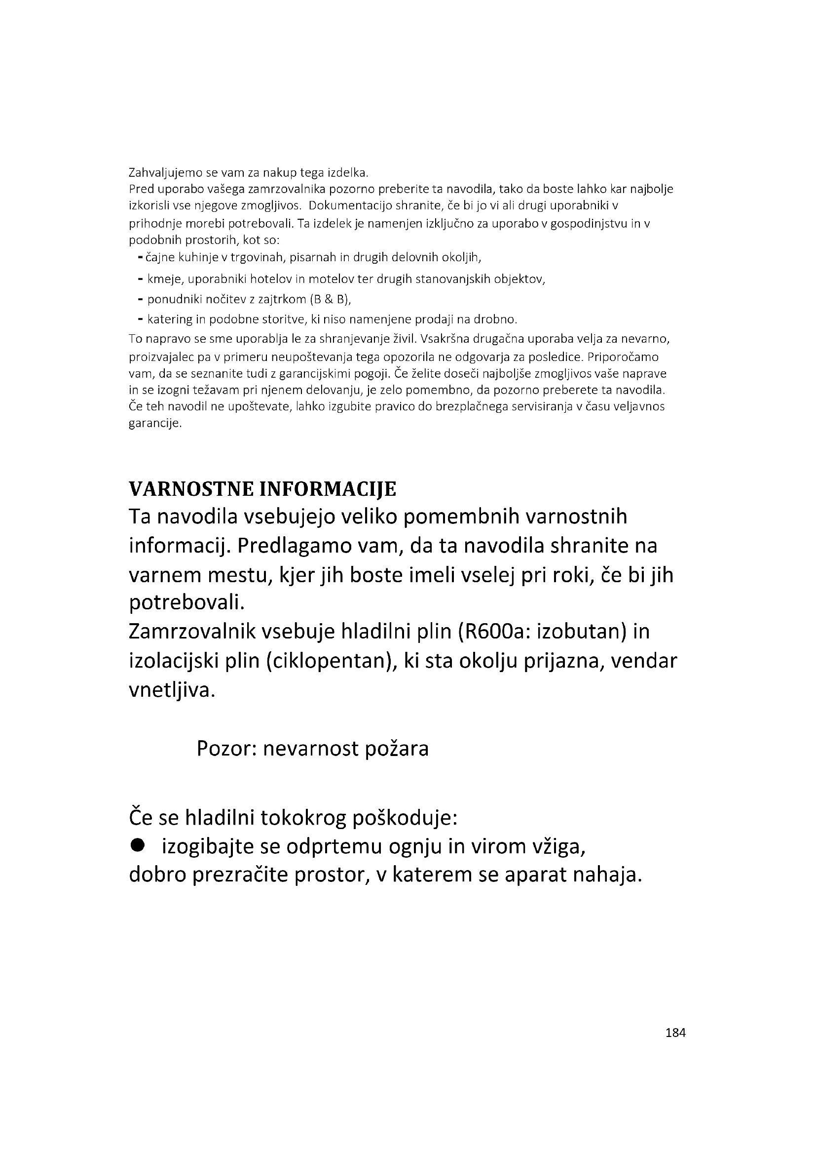 - ISKANJE IN ODPRAVLJANJE NAPAK 84 Zahvaljujemo se vam za nakup tega izdelka. Pred uporabo vašega zamrzovalnika pozorno preberite ta navodila, tako da boste lahko kar najbolje izkoristili vse njegove zmogljivosti. Dokumentacijo shranite, če bi jo vi ali drugi uporabniki v prihodnje morebiti potrebovali. Ta izdelek je namenjen izključno za uporabo v gospodinjstvu in v podobnih prostorih, kot so: - čajne kuhinje v trgovinah, pisarnah in drugih delovnih okoljih, - kmetije, uporabniki hotelov in motelov ter drugih stanovanjskih objektov, - ponudniki nočitev z zajtrkom (B & B), - katering in podobne storitve, ki niso namenjene prodaji na drobno. To napravo se sme uporabljati le za shranjevanje živil. Vsakršna drugačna uporaba velja za nevarno, proizvajalec pa v primeru neupoštevanja tega opozorila ne odgovarja za posledice. Priporočamo vam, da se seznanite tudi z garancijskimi pogoji. Če želite doseči najboljše zmogljivosti vaše naprave in se izogniti težavam pri njenem delovanju, je zelo pomembno, da pozorno preberete ta navodila. Če teh navodil ne upoštevate, lahko izgubite pravico do brezplačnega servisiranja v času veljavnosti garancije. VARNOSTNE INFORMACIJE Ta navodila vsebujejo veliko pomembnih varnostnih informacij. Predlagamo vam, da ta navodila shranite na varnem mestu, kjer jih boste imeli vselej pri roki, če bi jih potrebovali. Zamrzovalnik vsebuje hladilni plin (R600a: izobutan) in izolacijski plin (ciklopentan), ki sta okolju prijazna, vendar vnetljiva. Pozor: nevarnost požara Če se hladilni tokokrog poškoduje: izogibajte se odprtemu ognju in virom vžiga, dobro prezračite prostor, v katerem se aparat nahaja. Čas delovanja v odstotkih: 18℃:delovanje 11 min,ustavitev 20 min 25℃:delovanje 10 min,ustavitev 12 min185 OPOZORILO! Med čiščenjem/prenašanjem aparata pazite, da se ne dotaknete kovinskih žic kondenzatorja na zadnji strani aparata, saj si pri tem lahko poškodujete prste in roke ali pa povzročite poškodbe izdelka. Ta aparat ni namenjen za zlaganje pod ali na druge aparate. Ne poskušajte se usesti ali stopiti na vrh vašega aparata, saj ni temu namenjen. Pri tem lahko poškodujete sebe ali aparat. Pazite, da med prenašanjem ali prestavljanjem aparata pod njim ne ukleščite priključnega kabla, saj ga s tem lahko odrežete ali poškodujete. Pri nameščanju aparata pazite, da ne poškodujete talnih oblog, cevi, stenskih oblog ipd. Aparata ne prestavljajte tako, da ga vlečete za pokrov ali ročaj. Ne pustite otrokom, da bi se igrali z aparatom ali posegali v njegove nastavitve. Naša družba zavrača vsakršno odgovornost v primeru neupoštevanja navodil. Aparata ne nameščajte na vlažno, mastno ali prašno mesto in ne izpostavljajte ga neposredni sončni svetlobi ali vodi. Aparata ne nameščajte v bližino grelnikov ali vnetljivih materialov. V primeru izpada električne energije ne odpirajte pokrova. Če izpad ne traja dlje kot 20 ur, to ne bi smelo vplivati na zamrznjena živila. Če izpad električne energije traja dlje, živila preverite in jih takoj pojejte ali pa jih skuhajte in nato zamrznite.186 Če pokrov zamrzovalne skrinje težko odprete takoj po tem, ko ste ga pravkar zaprli, ne skrbite. To je posledica razlike v tlaku, ki se izenači in po nekaj minutah omogoči normalno odpiranje pokrova. Aparata ne priključujte na električno napajanje, dokler ne odstranite vseh zaščit, ki so bile potrebne zaradi pakiranja in prevoza. Preden aparat vključite, ga pustite najmanj 4 ure mirovati, da se olje v kompresorju posede, če ste aparat prevažali v vodoravni legi. Zamrzovalnik uporabljajte le za predvidene namene (in sicer za shranjevanje in zamrzovanje užitnih živil). V vinski vitrini ne shranjujte zdravil ali snovi za raziskovalne namene. Če snovi, ki jih shranjujete, zahtevajo strogi nadzor temperature shranjevanja, se lahko pokvarijo ali pa pride do nenadzorovane reakcije, ki je lahko nevarna. Pred kakršnimi koli posegi iztaknite vtič priključnega kabla iz omrežne vtičnice. Ob dostavi se prepričajte, da izdelek ni poškodovan ter da so vsi sestavni deli in dodatki brezhibno ohranjeni. Če opazite puščanje hladilnega sistema, se ne dotikajte stenske vtičnice in ne uporabljajte odprtega ognja. Odprite okno in prezračite prostor. Nato pokličite serviserja zaradi popravila. Ne uporabljajte podaljškov ali adapterjev. Priključnega kabla ne vlecite premočno in ne187 zvijajte ga ter ne dotikajte se vtiča z mokrimi rokami. Pazite, da ne poškodujete vtiča in/ali priključnega kabla, saj to lahko povzroči električni udar ali požar. Ne postavljajte ali shranjujte vnetljivih in zelo hlapnih snovi, kot so eter, bencin, UNP, propan, aerosolni razpršilci, lepila, čisti alkohol ipd. Te snovi lahko povzročijo eksplozijo. V bližini vinske vitrine ne uporabljajte in ne shranjujte vnetljivih razpršil, kot so barve v razpršilu. To lahko povzroči eksplozijo ali požar. Na vrh aparata ne postavljajte predmetov in/ali posod, napolnjenih z vodo. Odsvetuje se uporaba podaljškov in razdelilnih letev. Aparata ne mečite v ogenj. Pazite, da med prevozom in med uporabo ne poškodujete hladilnega tokokroga/cevi aparata. V primeru poškodbe, aparata ne izpostavljajte ognju ali morebitnim virom vžiga in takoj prezračite prostor, v katerem je aparat nameščen. Hladilni sistem, ki se nahaja na zadnji strani in v notranjosti vinske vitrine, vsebuje hladivo. Zato pazite, da ne poškodujete cevi. Ne uporabljajte električnih naprav v razdelkih za shranjevanje živil aparata, razen če so take vrste, ki jih priporoča proizvajalec. Pazite, da ne poškodujete hladilnega tokokroga.188 Ne uporabljajte mehanskih sredstev za pospešitev odtaljevanja oziroma takih, ki jih ne priporoči proizvajalec. Ne uporabljajte električnih naprav v razdelkih za shranjevanje živil, razen če so take vrste, ki jih priporoča proizvajalec. Ne zapirajte prezračevalnih odprtin na ohišju aparata ali na vgradnih elementih. Ne uporabljajte koničasti