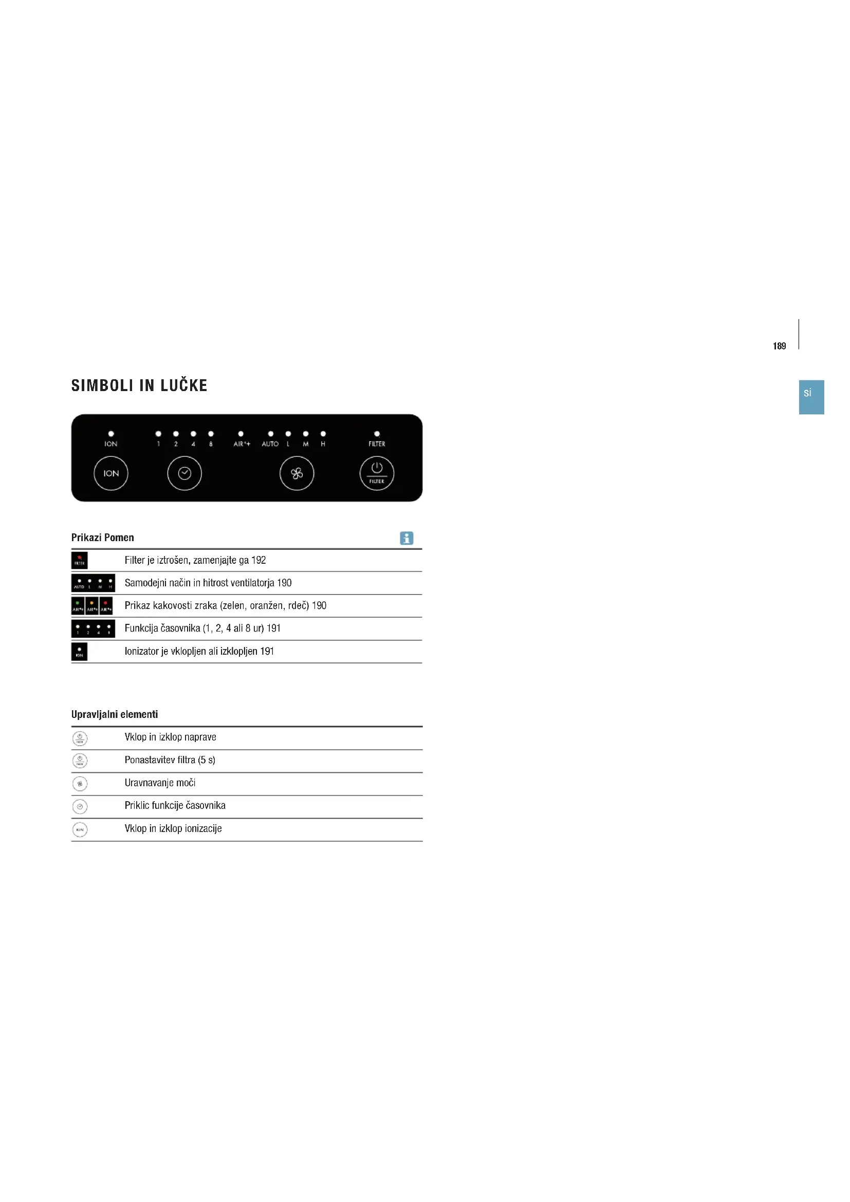 Ionizator je vklopljen ali izklopljen 191