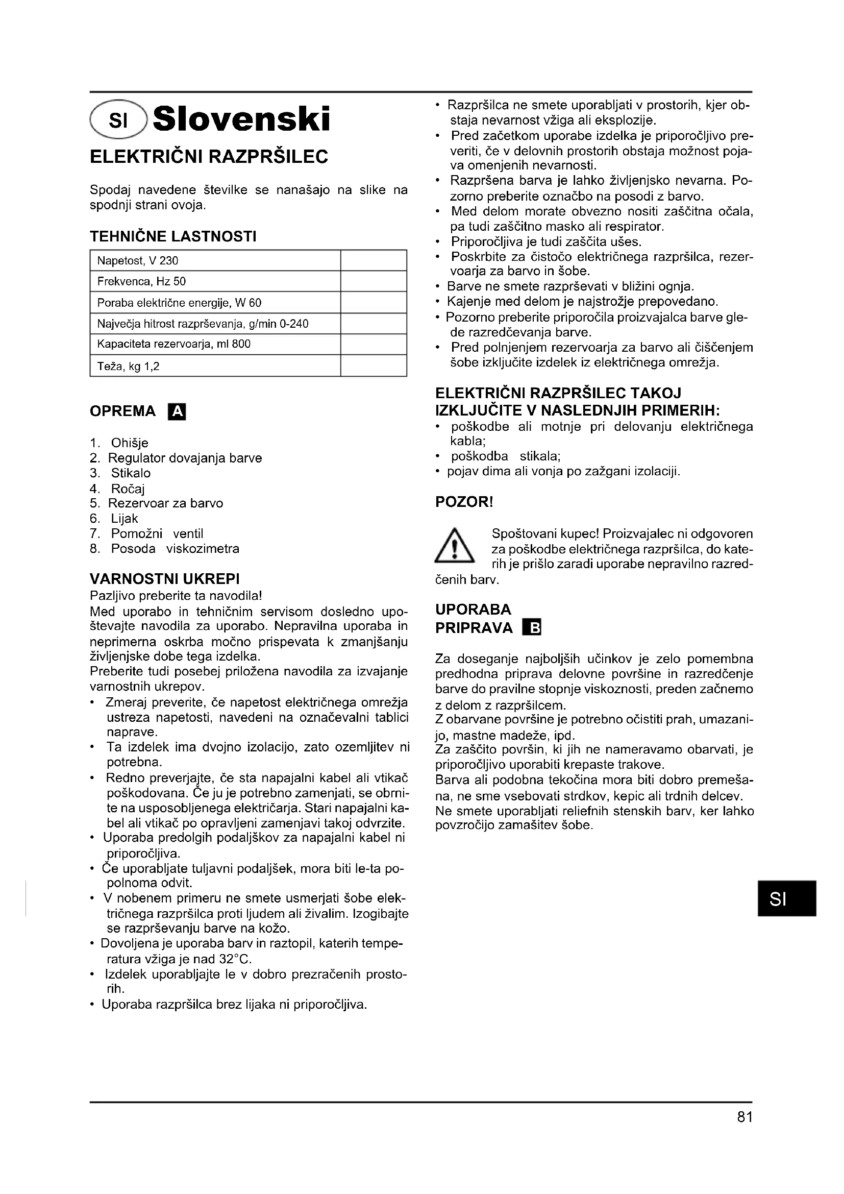 Pozor! Med čiščenjem razpršilca ali rezervo- arja obvezno izključite izdelek iz električnega omrežja. Po vsaki uporabi je potrebno očistiti barve z lijaka in šo- be razpršilca, v nasprotnem primeru lahko pride do za- mašitve in prenehanja delovanja razpršilca ob nasledn- jem vklopu. Čiščenje ni vključeno v seznam popravil, ki jih proizvajalec zagotavlja v garancijskem roku.83