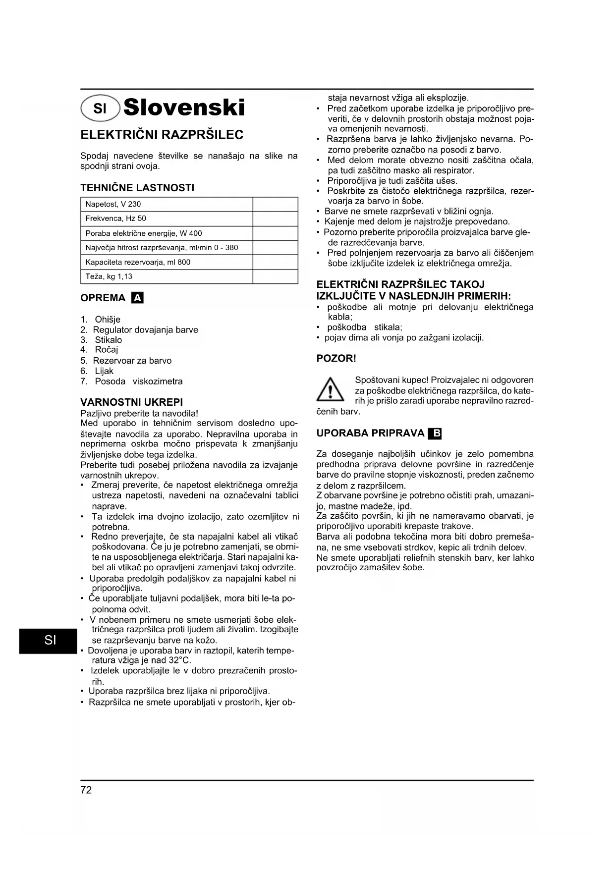 Spoštovani kupec! Proizvajalec ni odgovoren za poškodbe električnega razpršilca, do katerih je prišlo zaradi uporabe nepravilno razred-